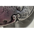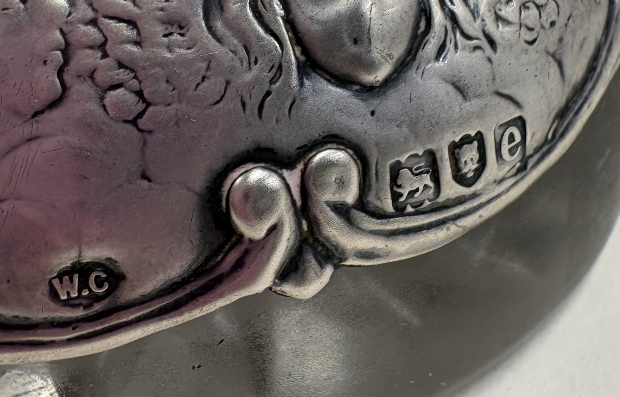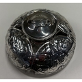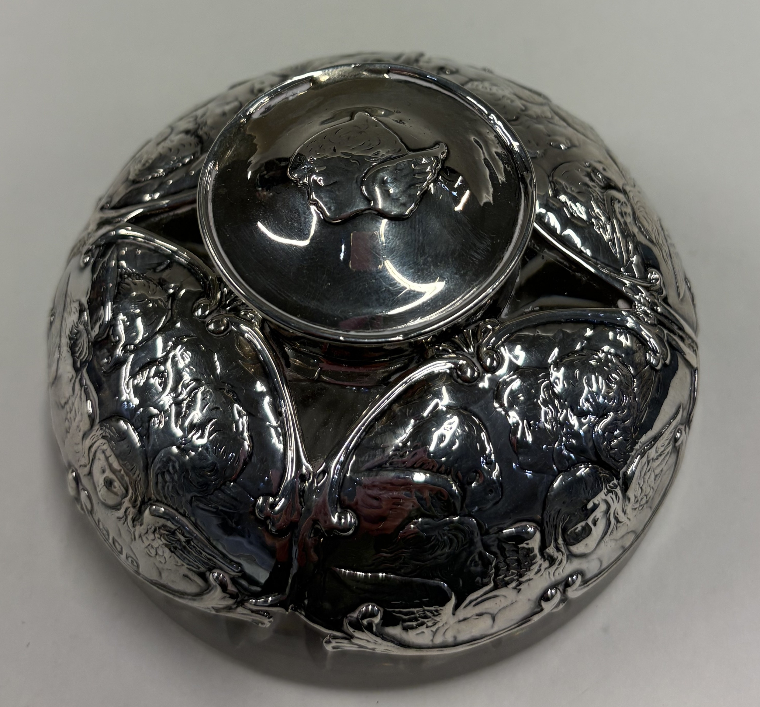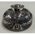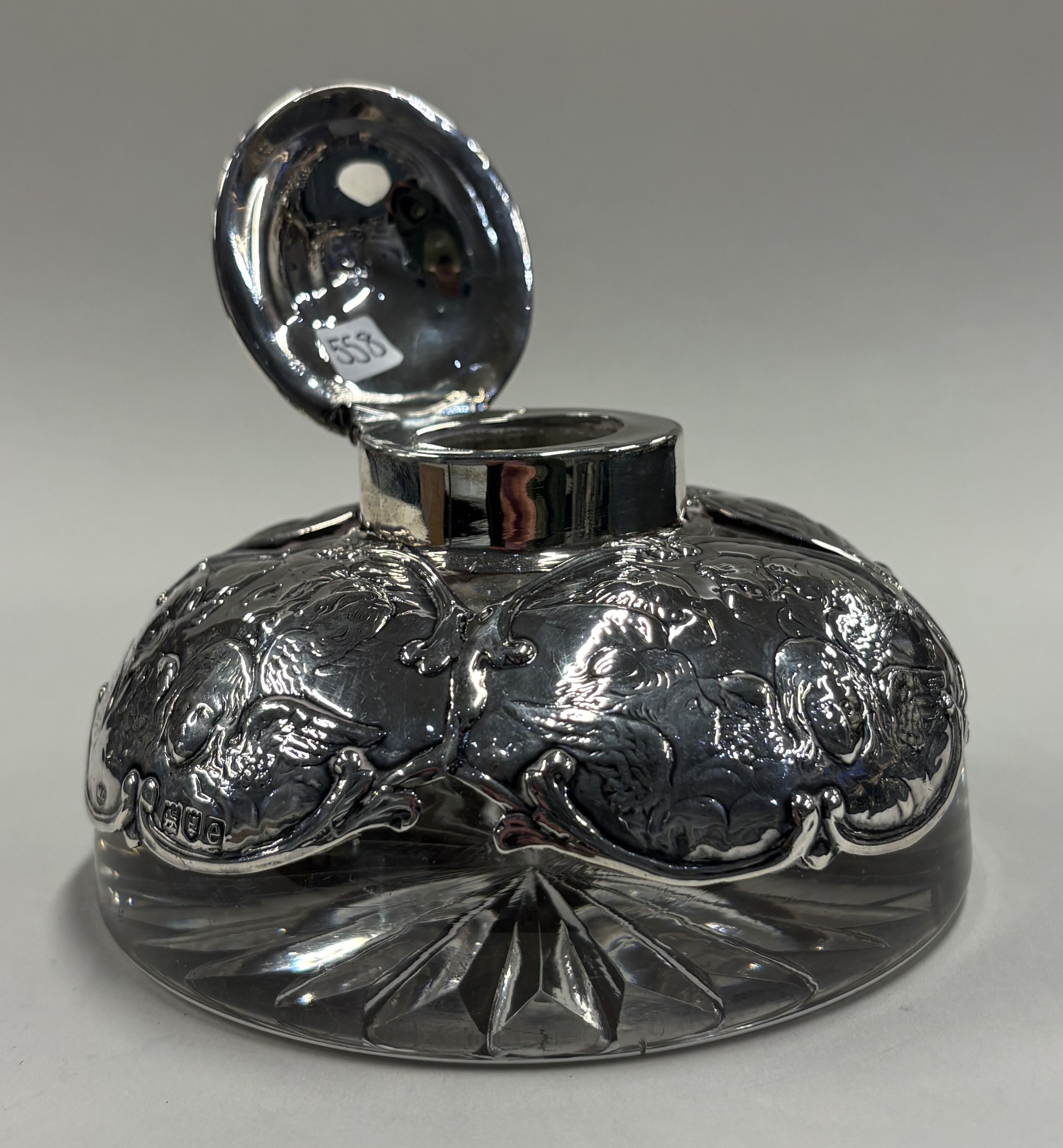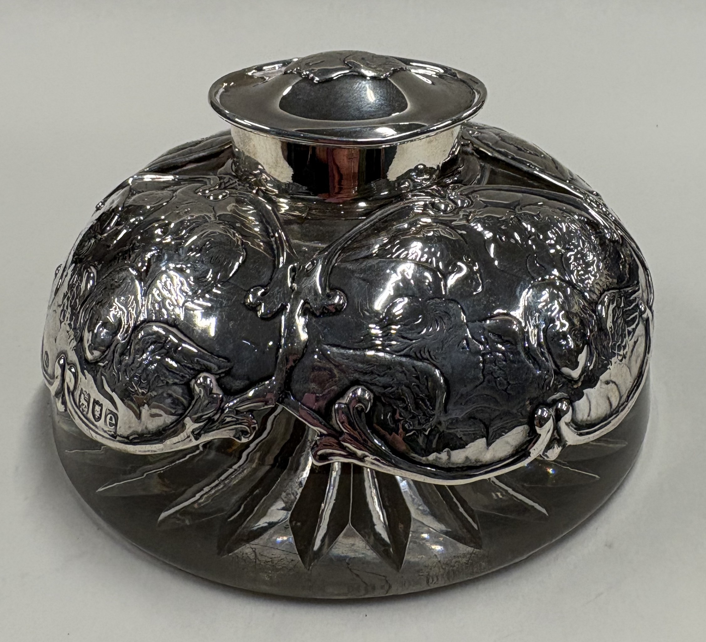 A heavy Victorian silver-mounted glass inkwell chased with cherub decoration. London 1900. By William Comyns. Est. £200 - £300.