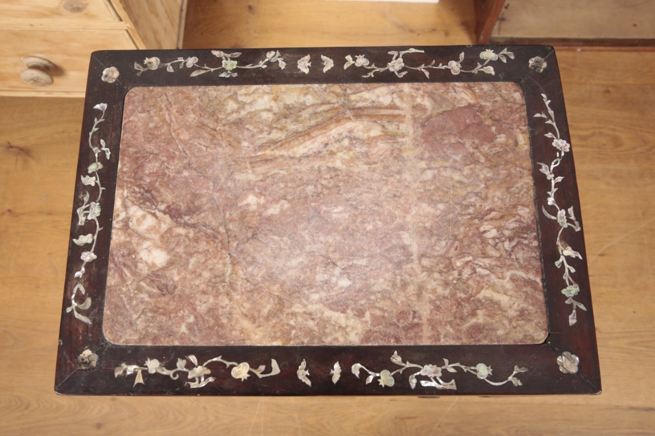 19th century, the rectangular top with inset marble above a pierced frieze and decorated throughout with inlaid mother of pearl, 80cm high x 42cm wide x 30cm deep