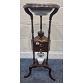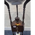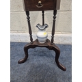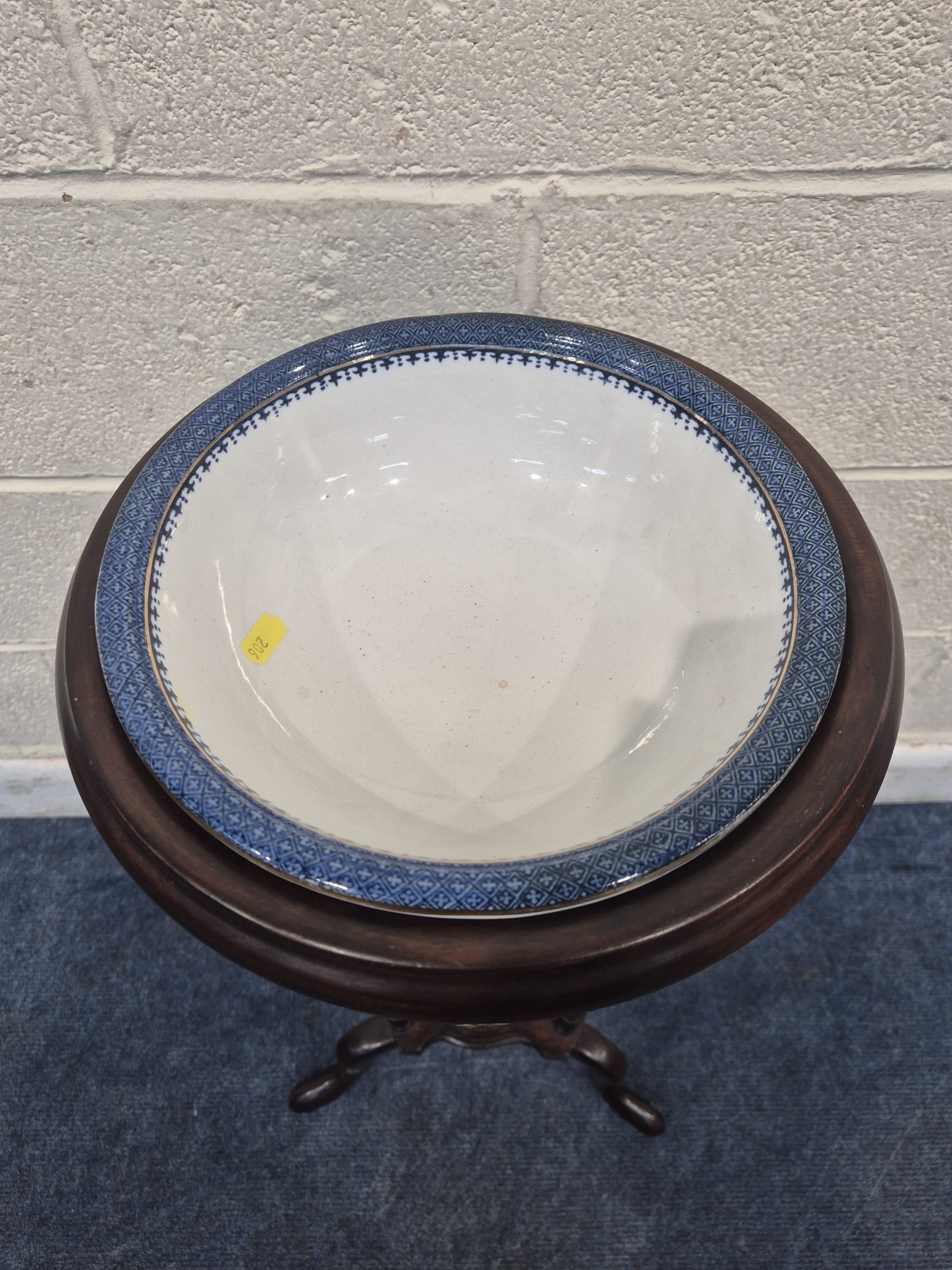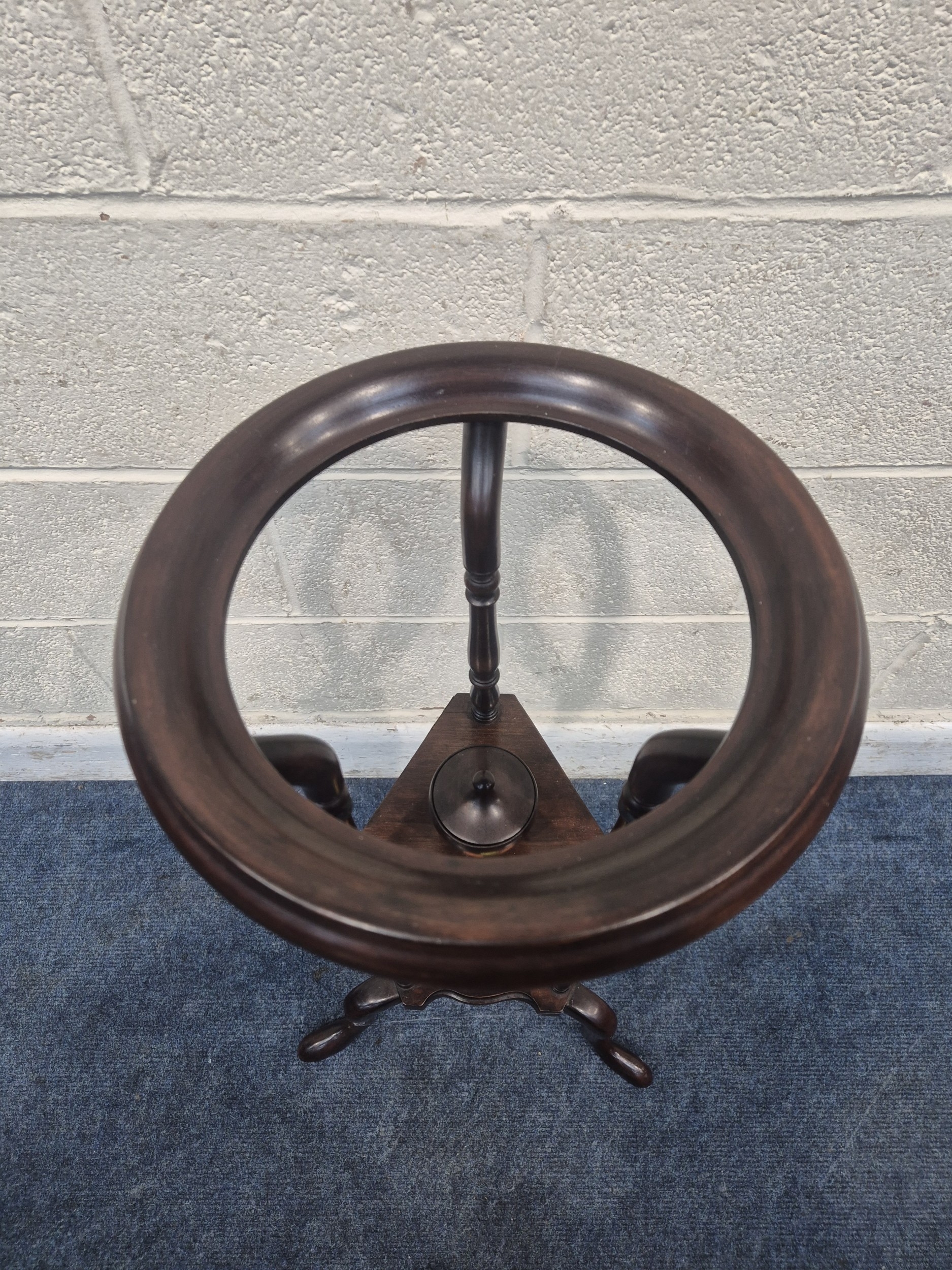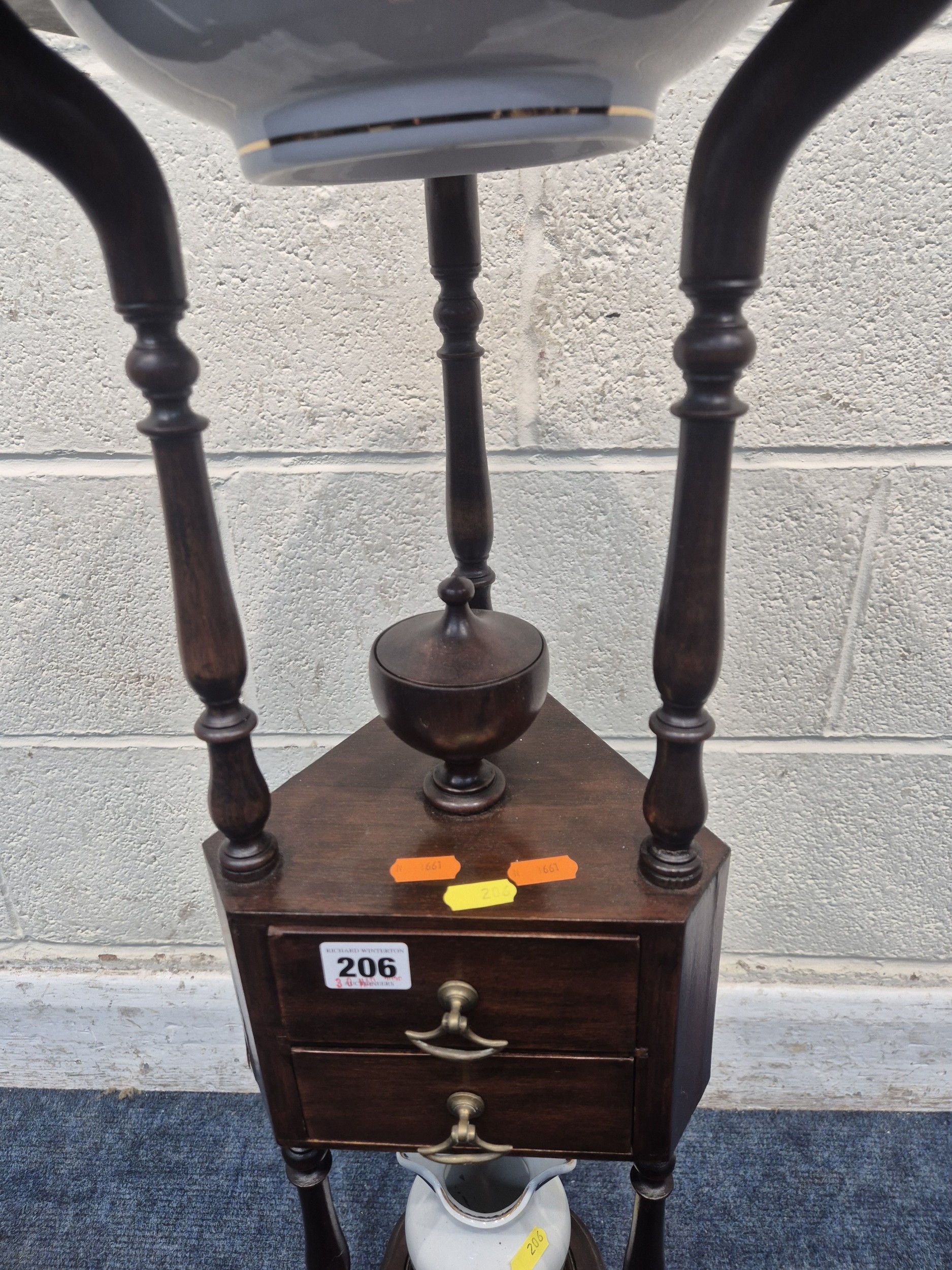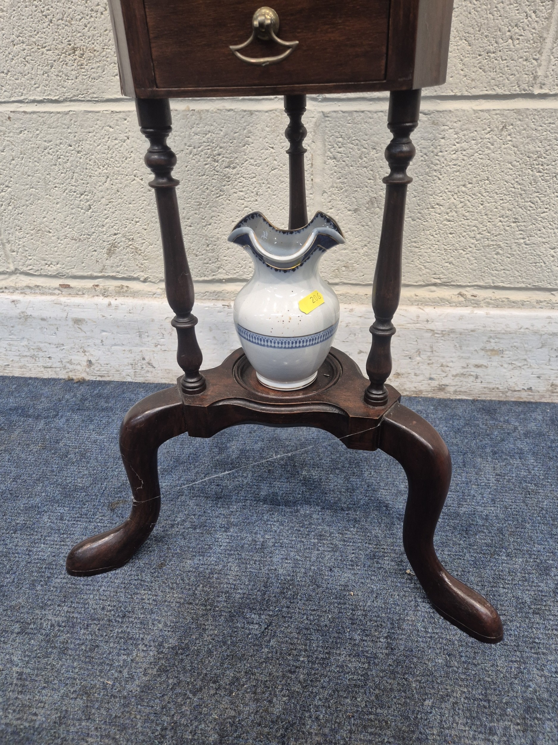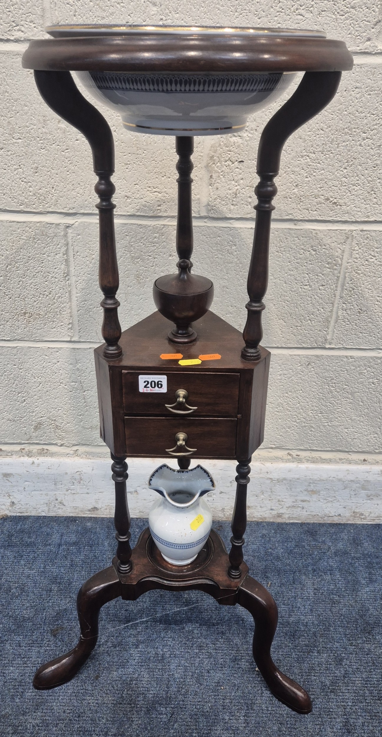 A MAHOGANY WIG STAND, with a circular top, the triangle centre section with a lidded cup and two drawers, raised on three cabriole legs, height 85cm, along with a Booths Lowestoft border design wash jug and bowl, condition report: appears over-stained, jug and bowl undamaged, some crazing, general signs of wear and usage (3)