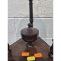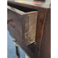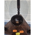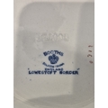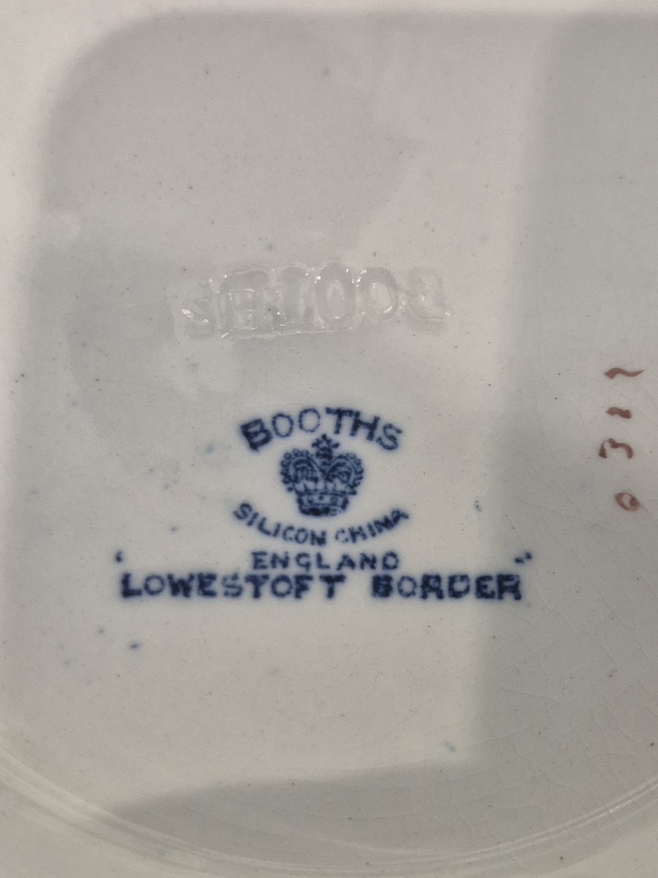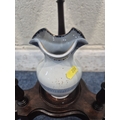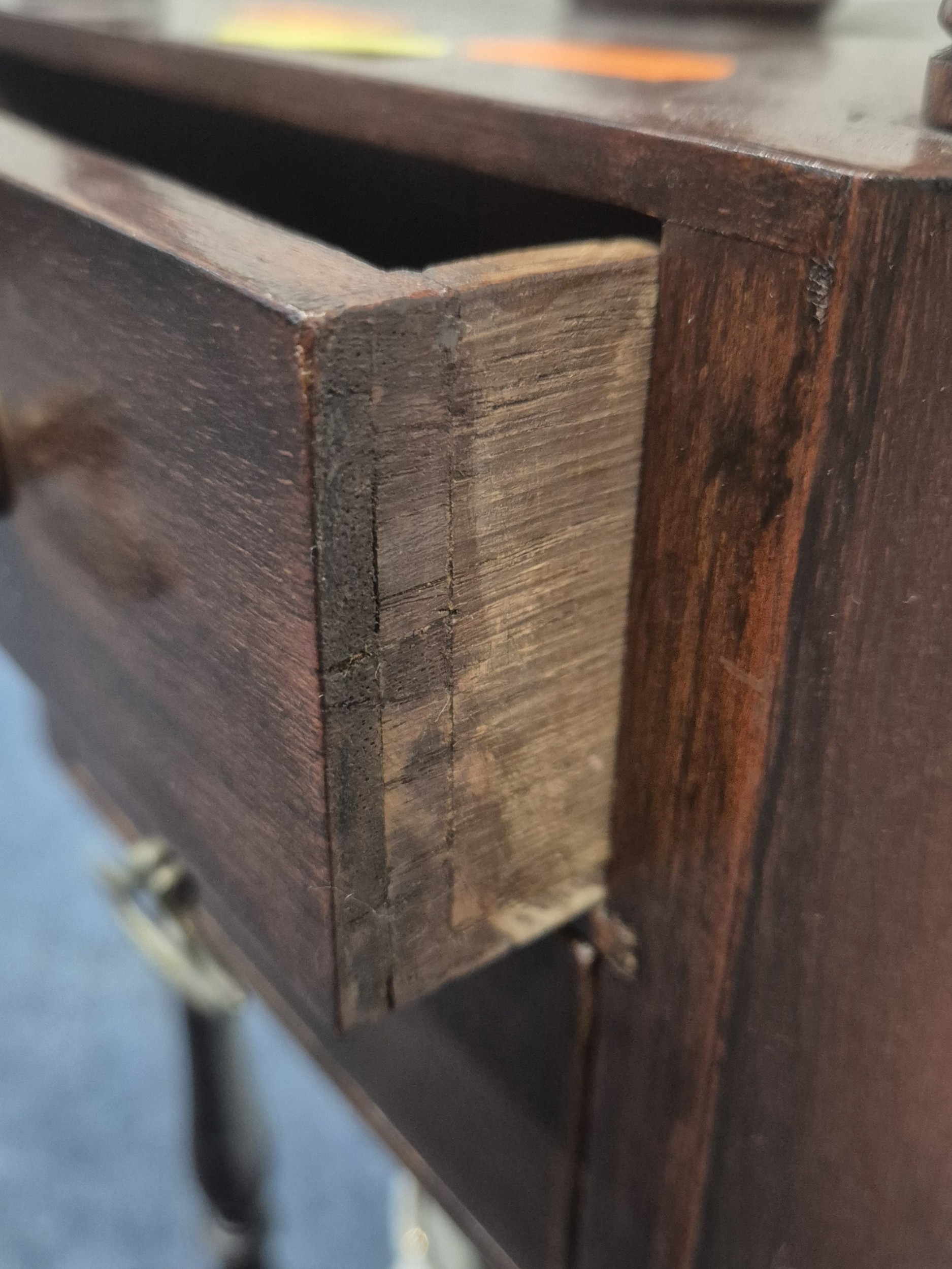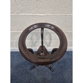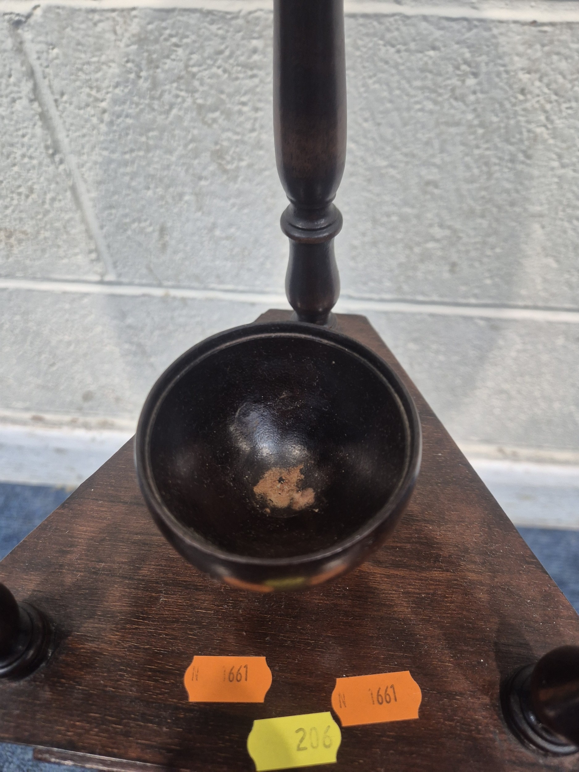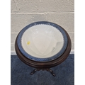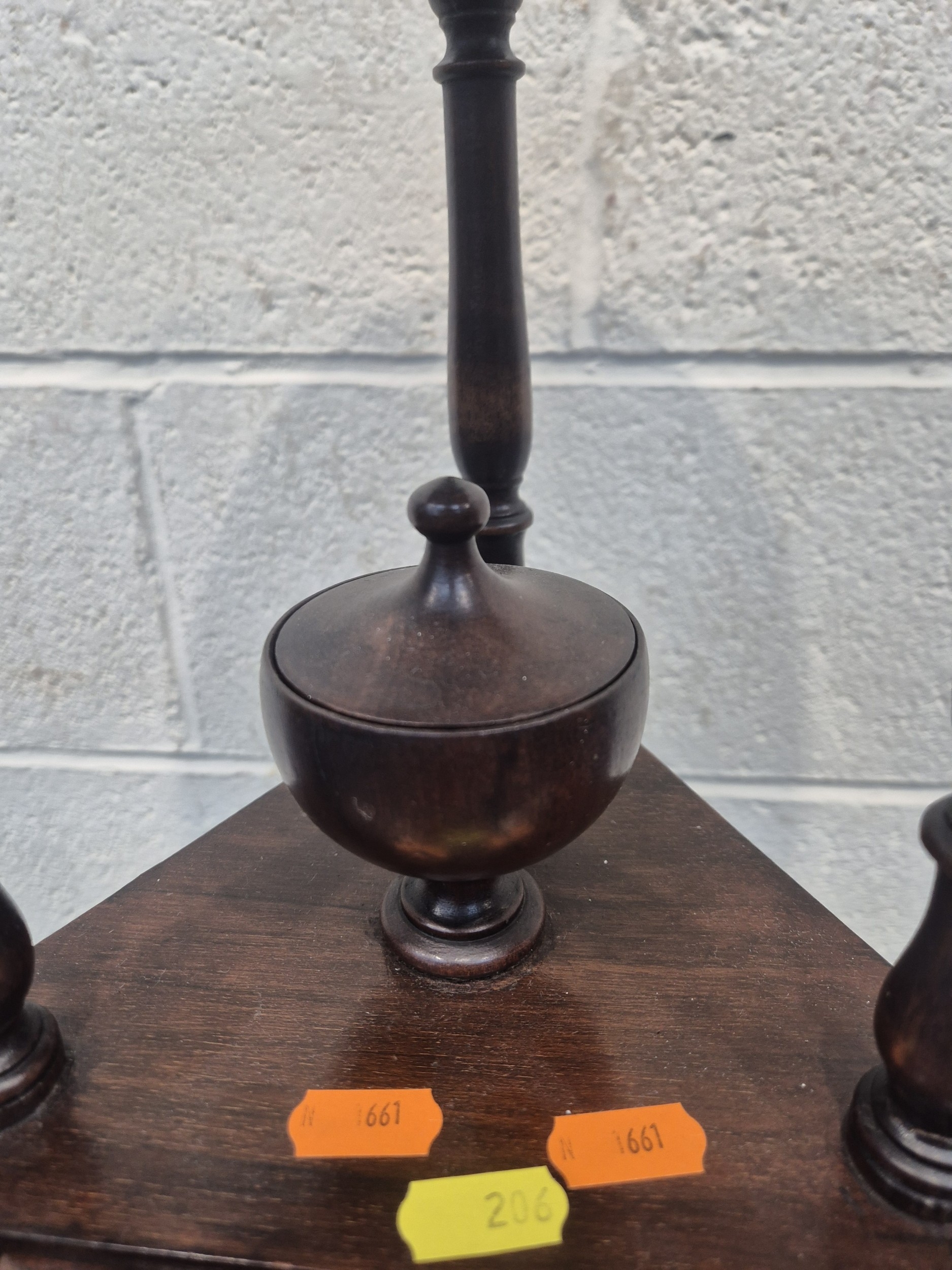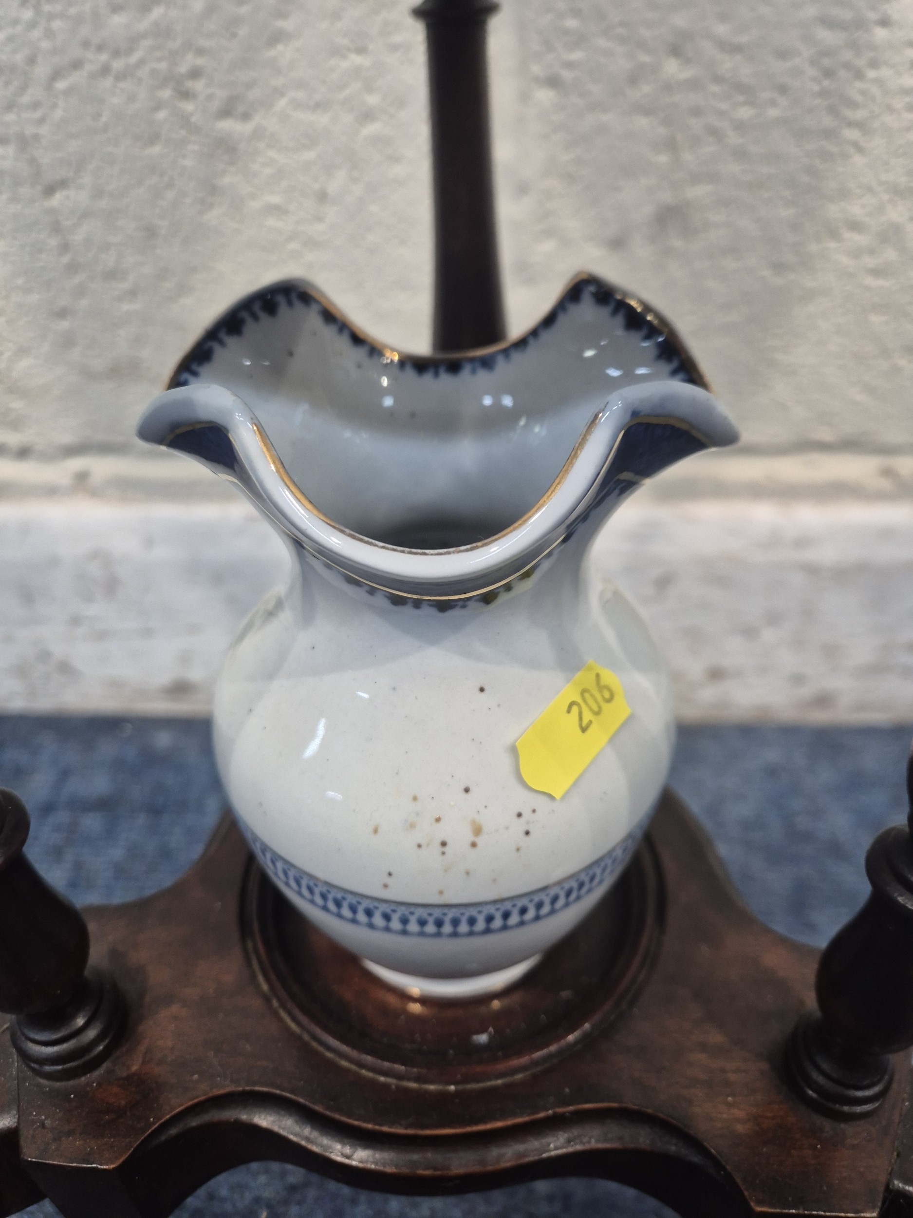 A MAHOGANY WIG STAND, with a circular top, the triangle centre section with a lidded cup and two drawers, raised on three cabriole legs, height 85cm, along with a Booths Lowestoft border design wash jug and bowl, condition report: appears over-stained, jug and bowl undamaged, some crazing, general signs of wear and usage (3)