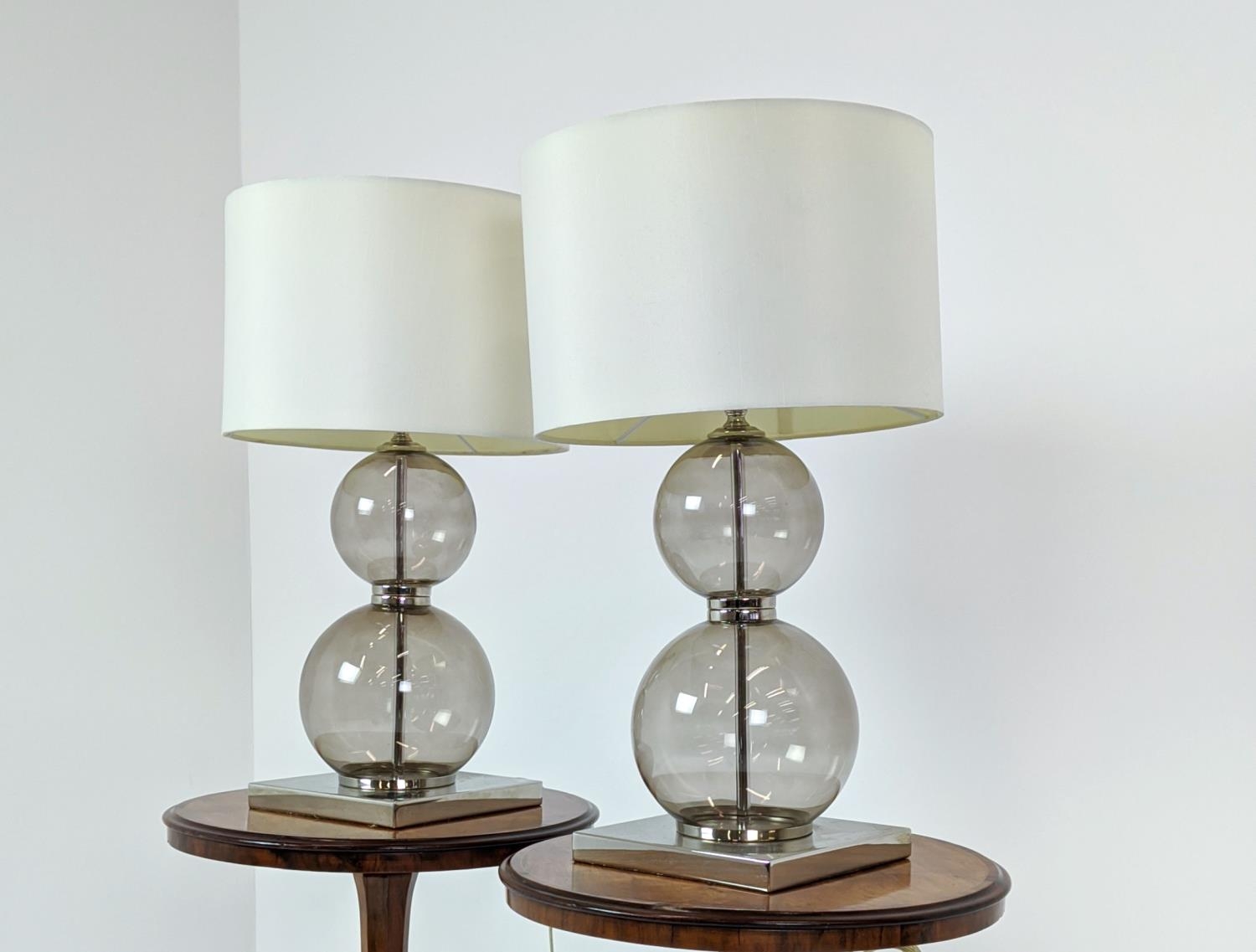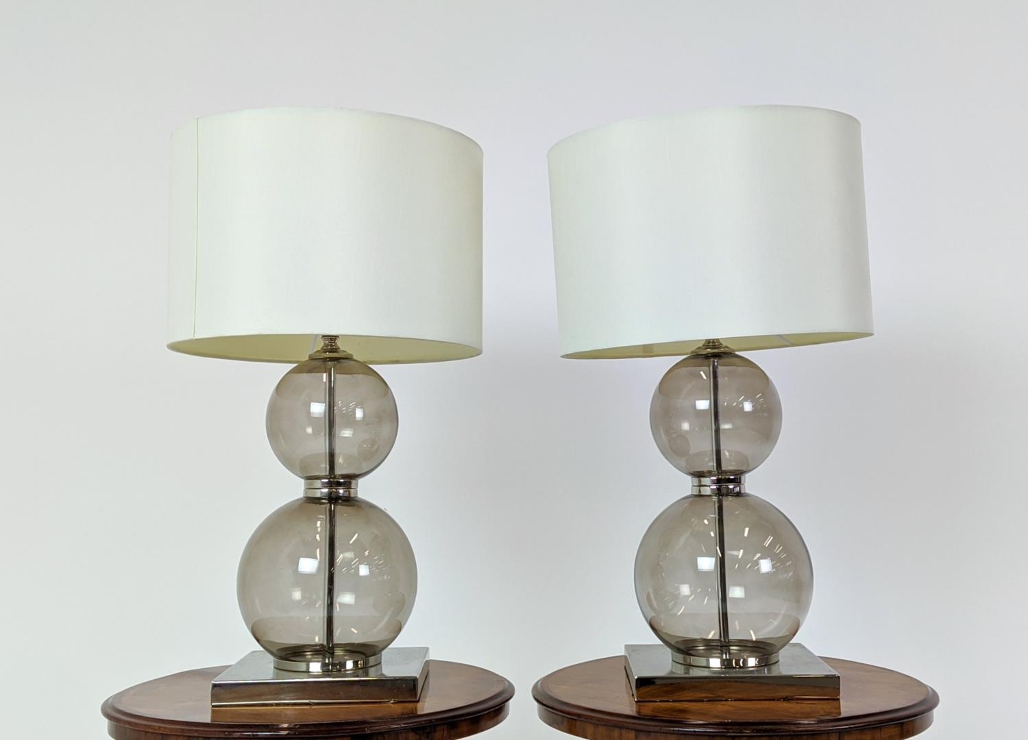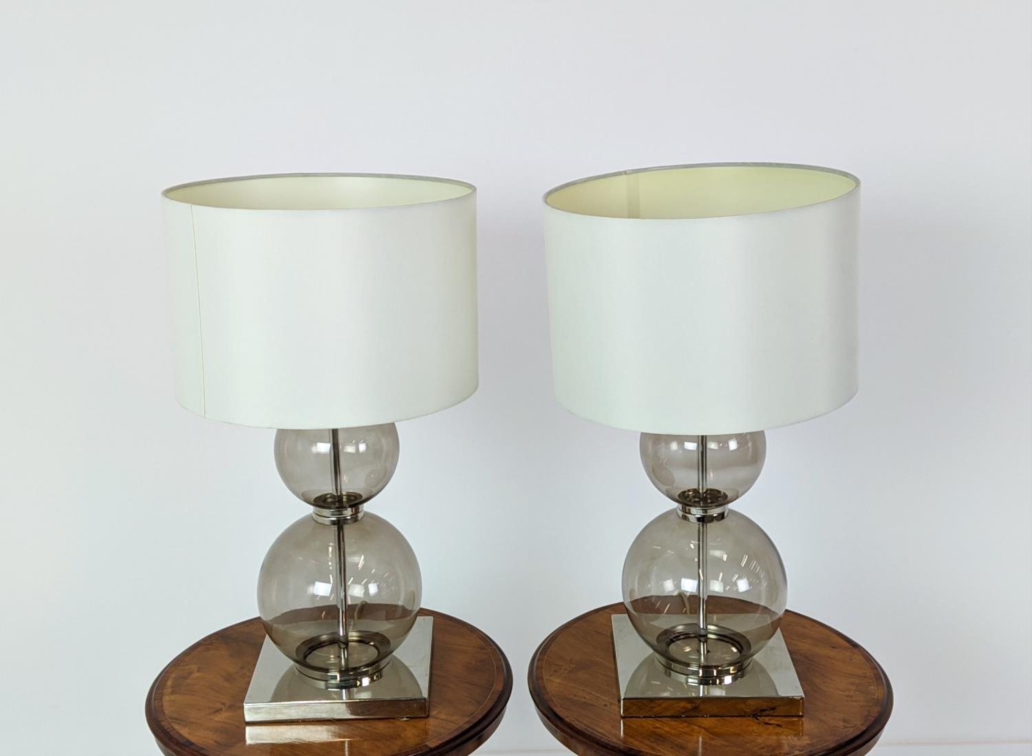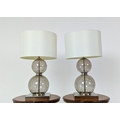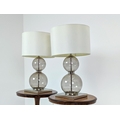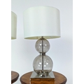 TABLE LAMPS, a pair, glass ball stems on square polished metal bases, 61cm H x 35cm W in shades. (2)