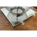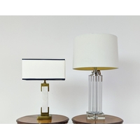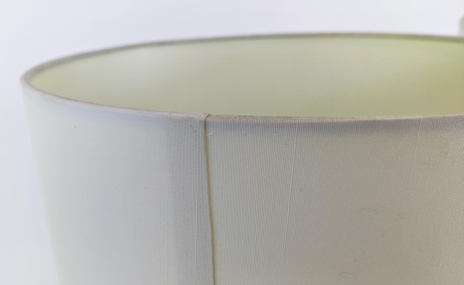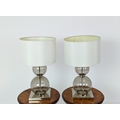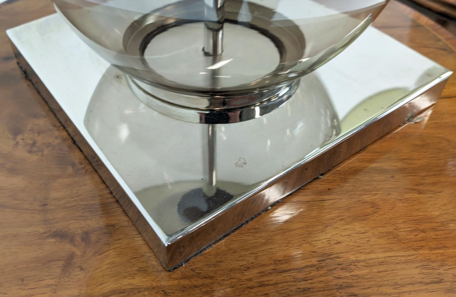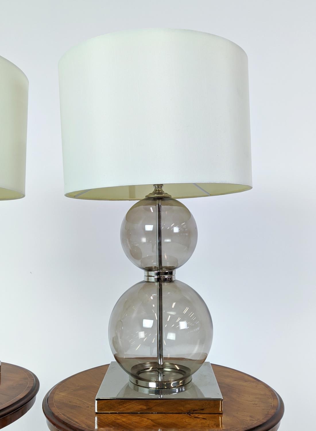 TABLE LAMPS, a pair, glass ball stems on square polished metal bases, 61cm H x 35cm W in shades. (2)
