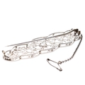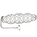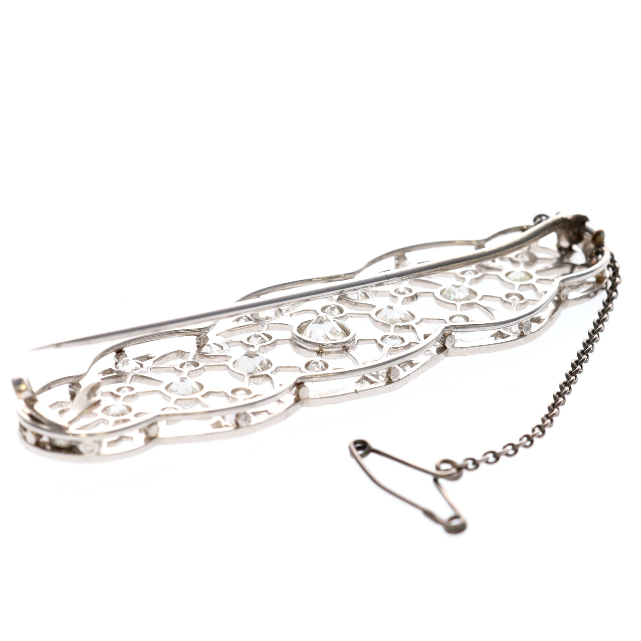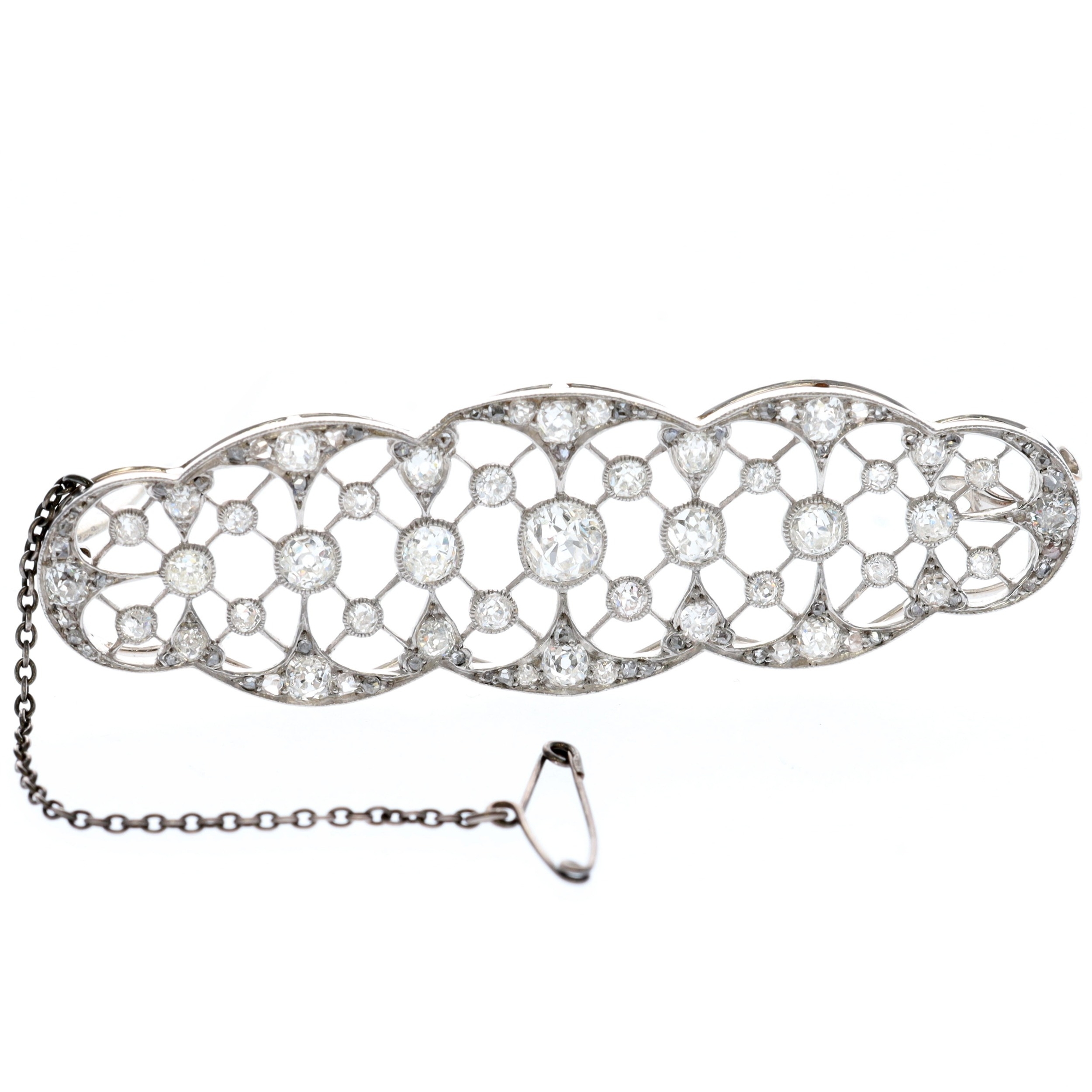 Platinum and silver Diamond brooch with safety chain. Measures approx. 6.9 x 2.7cm. There are approx. 3ct of diamonds, the central stone measures approx. 0.6 x 0.6cm. Clarity is approx. VS1-SI1 and the colour approx. G-H. The hook catch is slightly bent, slightly misshapen along one edge. Tested to 900 plat and silver. Weighs in total 12.6g