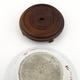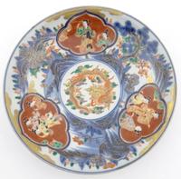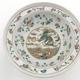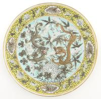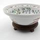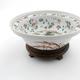 Chinese porcelain bowl enamelled in the famille rose palette with a dragon, fish and grasshoppers amongst flowers, with iron red bamboo decoration to the reverse, raised on a wooden stand, 22cm diameter