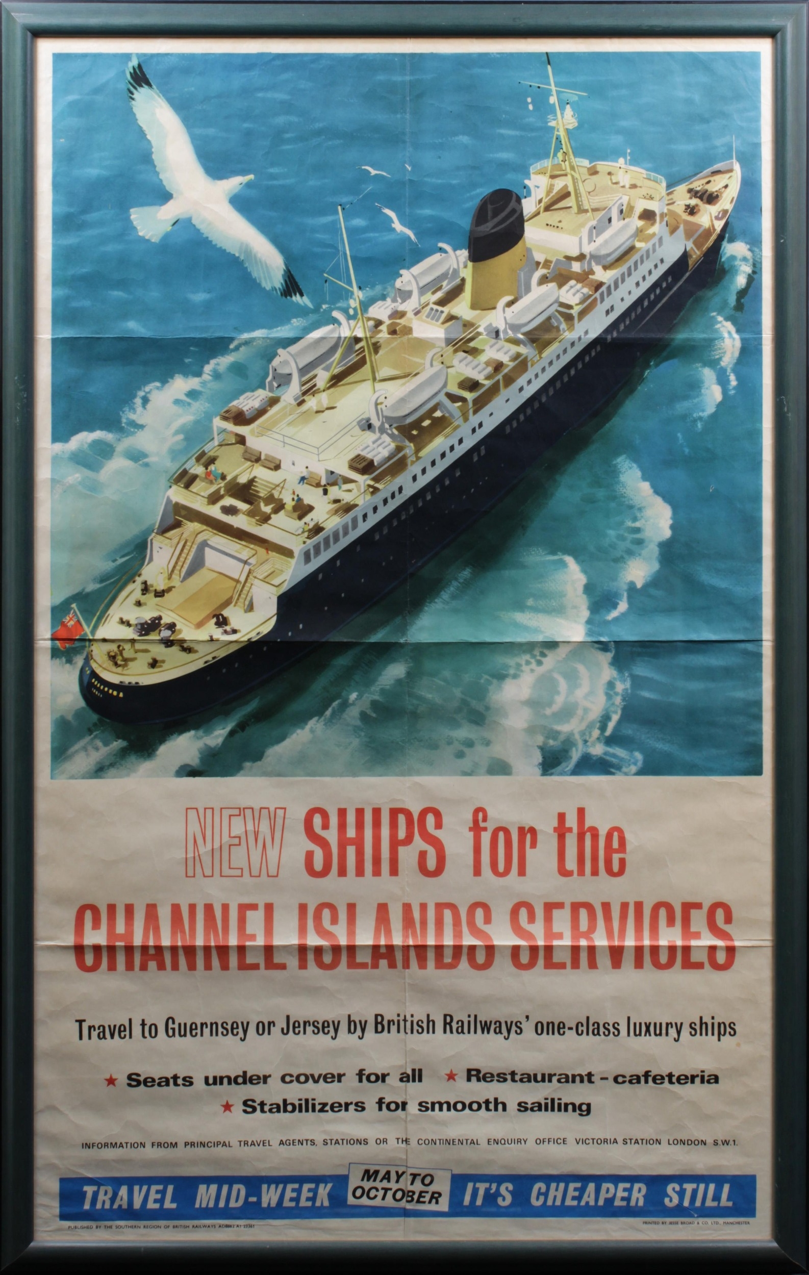 A vintage travel poster - "NEW SHIPS for the CHANNEL ISLANDS SERVICES" by British Railways, dating to 1961, framed & glazed, 108 x 96cm. overall.