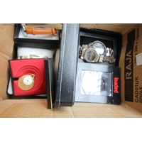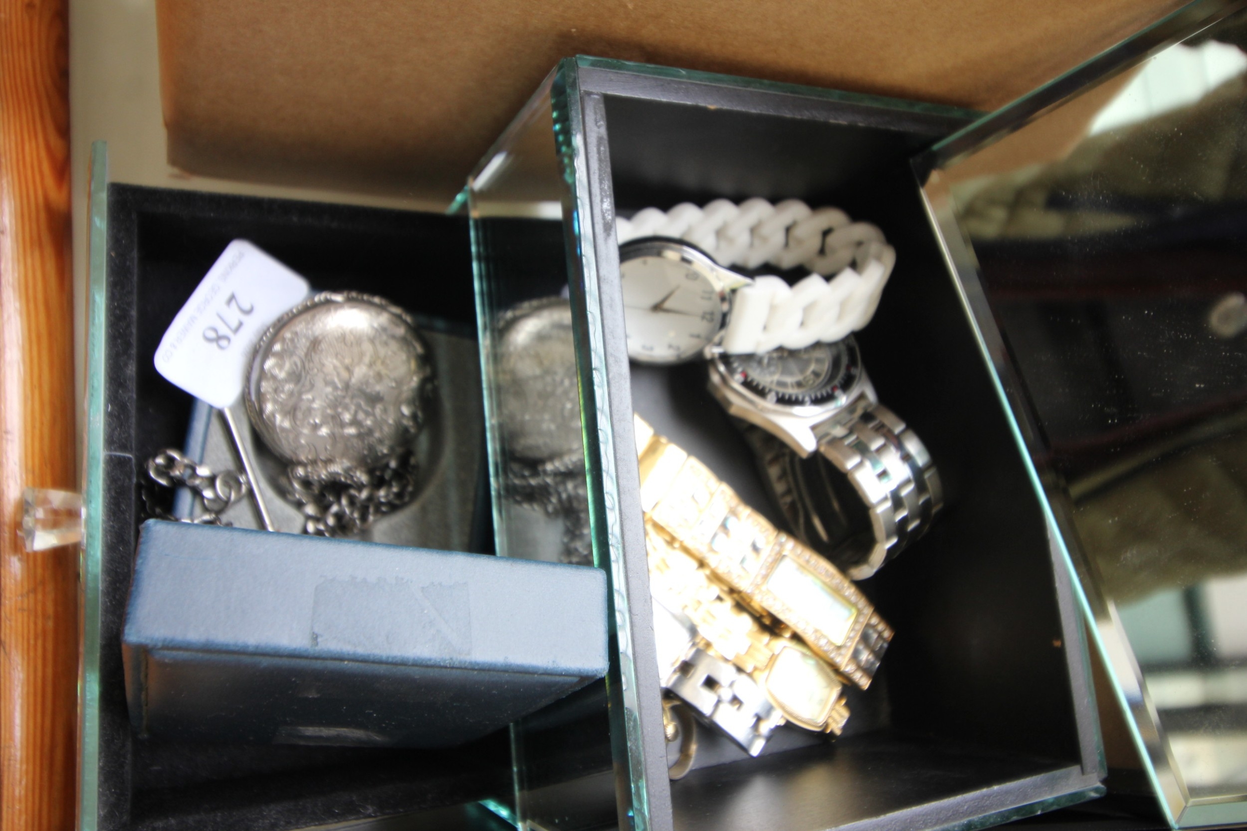 Glass jewelry box containing modern designer type ladies watches and pocket watch