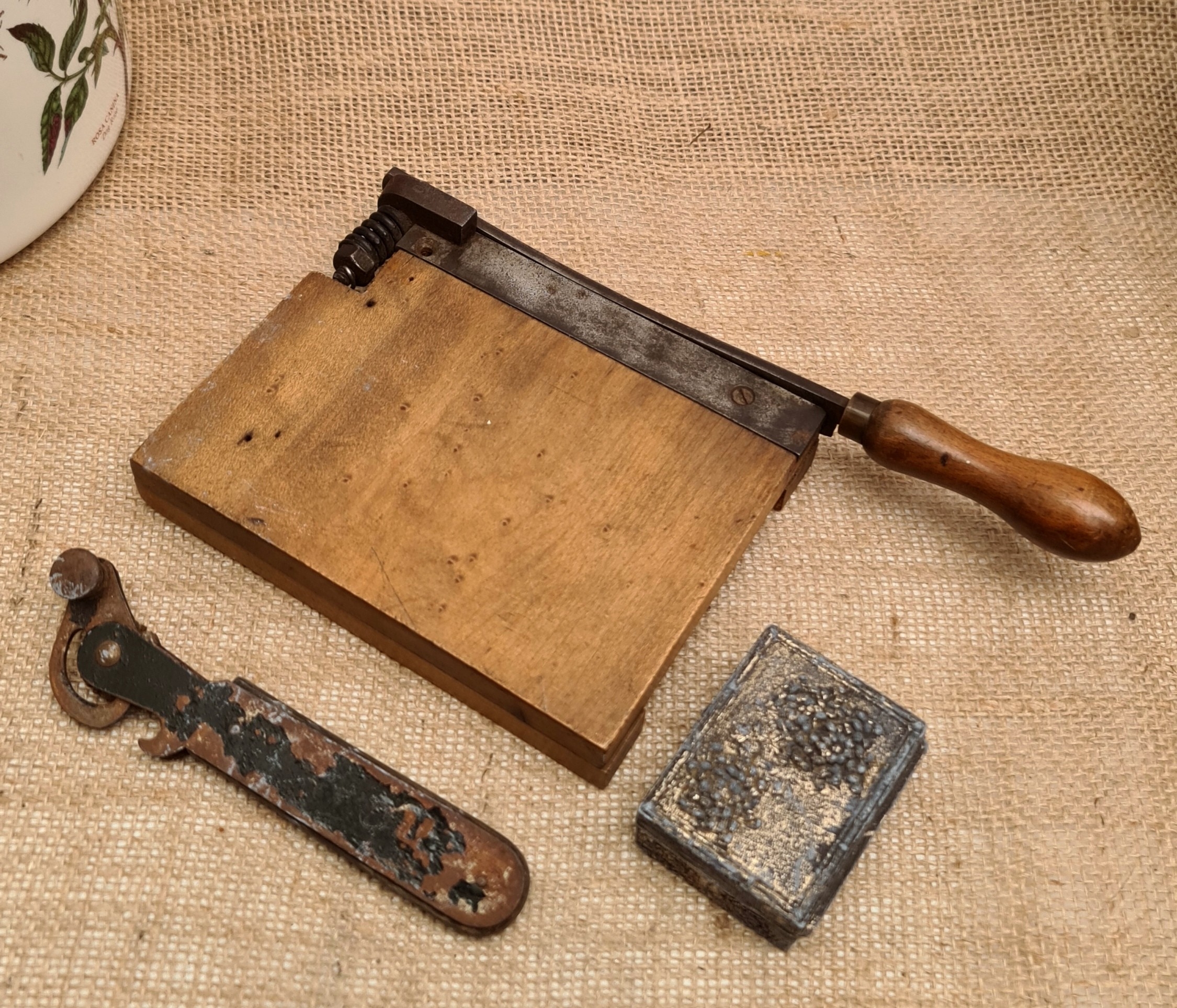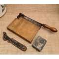 Vintage Wood Base Paper Guillotine Plus Vintage Bottle Opener and a Metal Box. The guillotine measures 26cm by 13cm. Shipping is available. Please ask for a quote before bidding. Where possible we combine shipping costs. Remember, if you are the highest bidder above reserve on this Lot you have bought the item and are legally responsible for the item. Viewing is recommended in either person or via video link. Contact us to arrange.