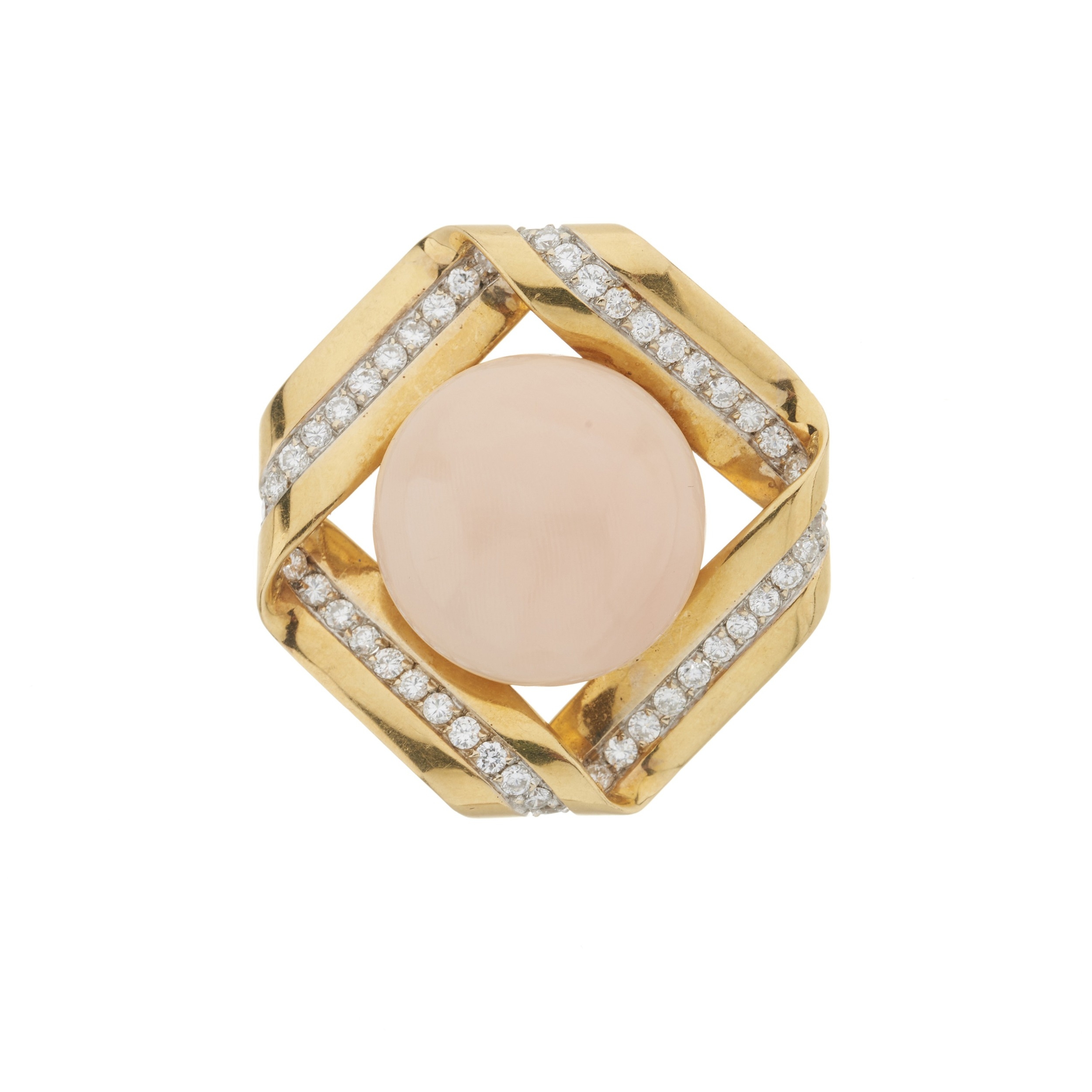 Overall good condition Moderate general wear and surface scratches Coral a pale peach colour, even colour distribution, small, light surface scratches throughout Diamonds well matched, bright and lively Pin, hinge and clasp in good working order Clients are advised to view and inspect items before bidding and they must satisfy themselves as to the condition of every lot For enquiries about this lot please contact David Pregun at david@kinghamsauctioneers.com