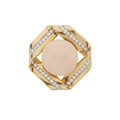 An 18ct gold pink coral cabochon and brilliant-cut diamond brooch, coral measures approximately 19 by 12.5mm, estimated total diamond weight 1.45ct, I-J colour, SI clarity, Italian assay marks, length 3.3cm, 21.1g