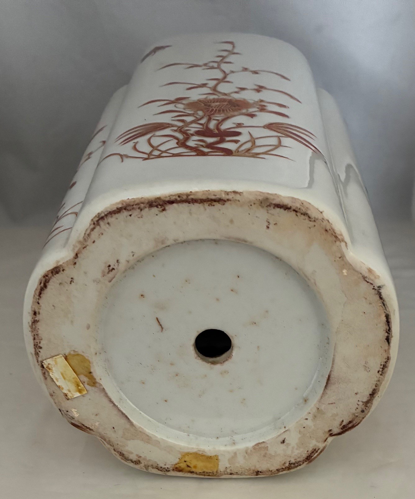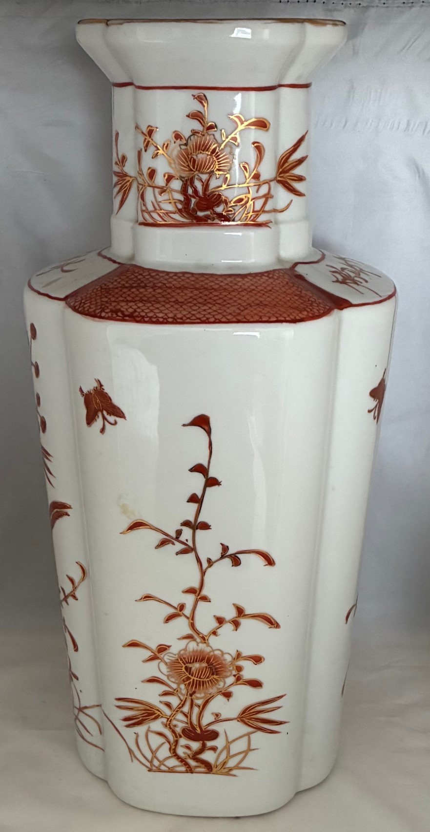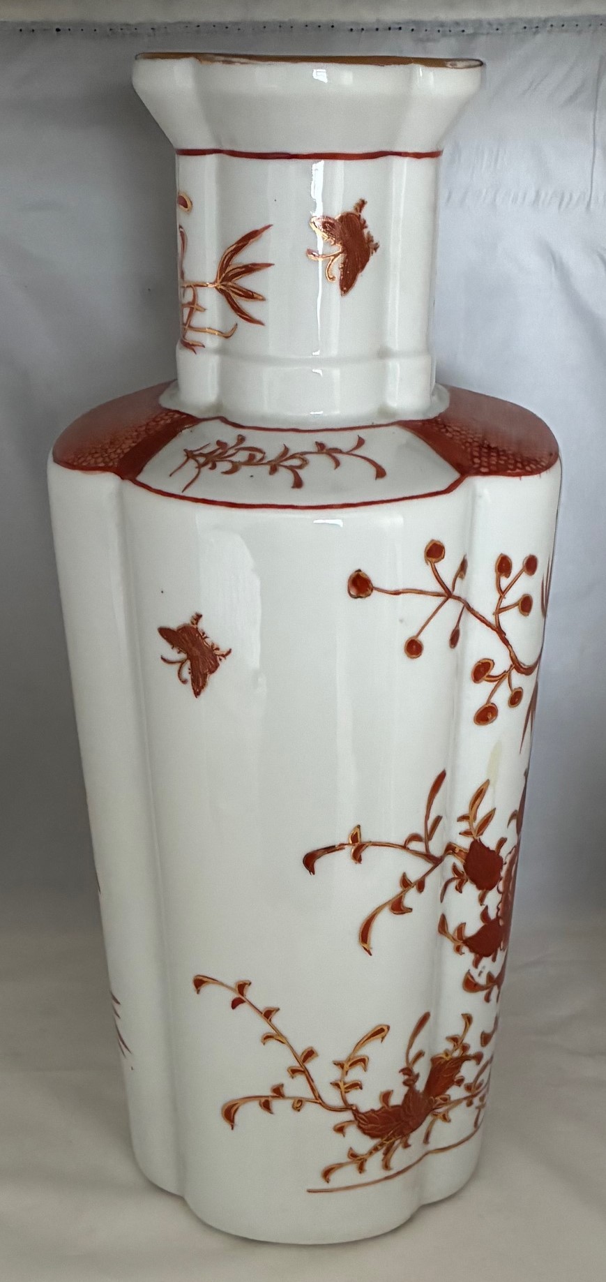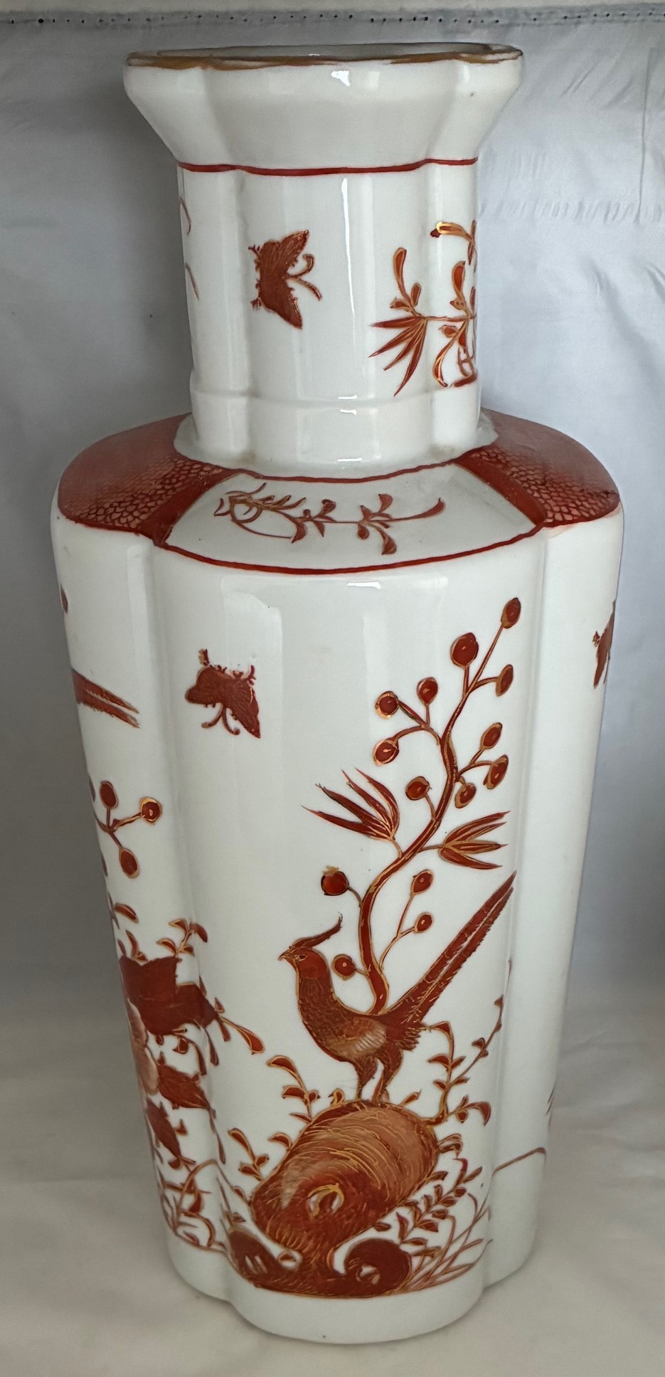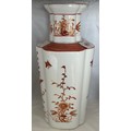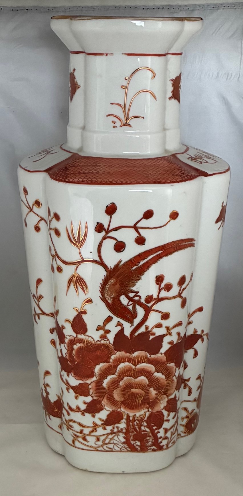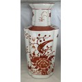 Japanese Kutani vase, of octagonal form, decorated in iron red with birds and foliage, the base drilled, 36.5cm high.