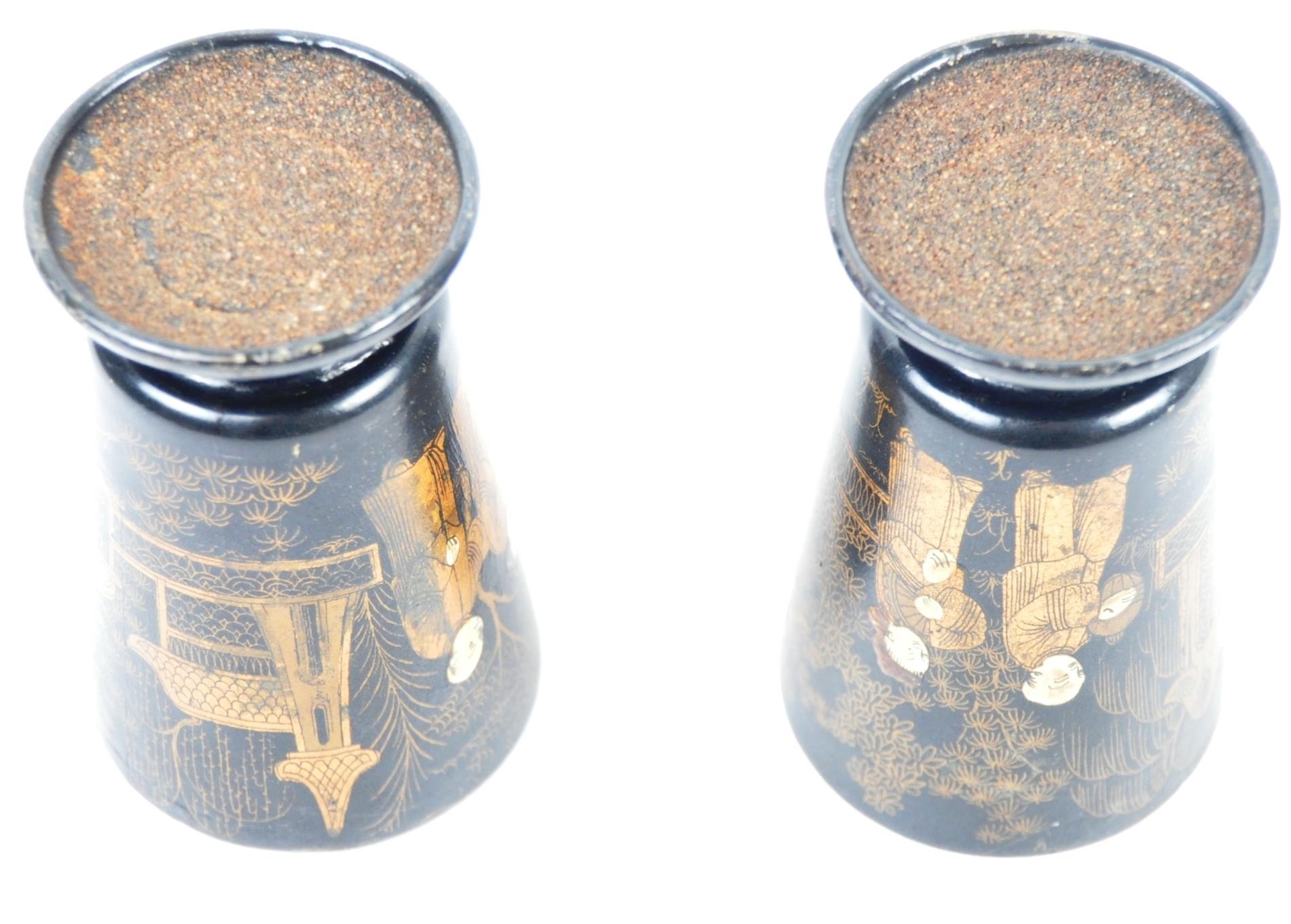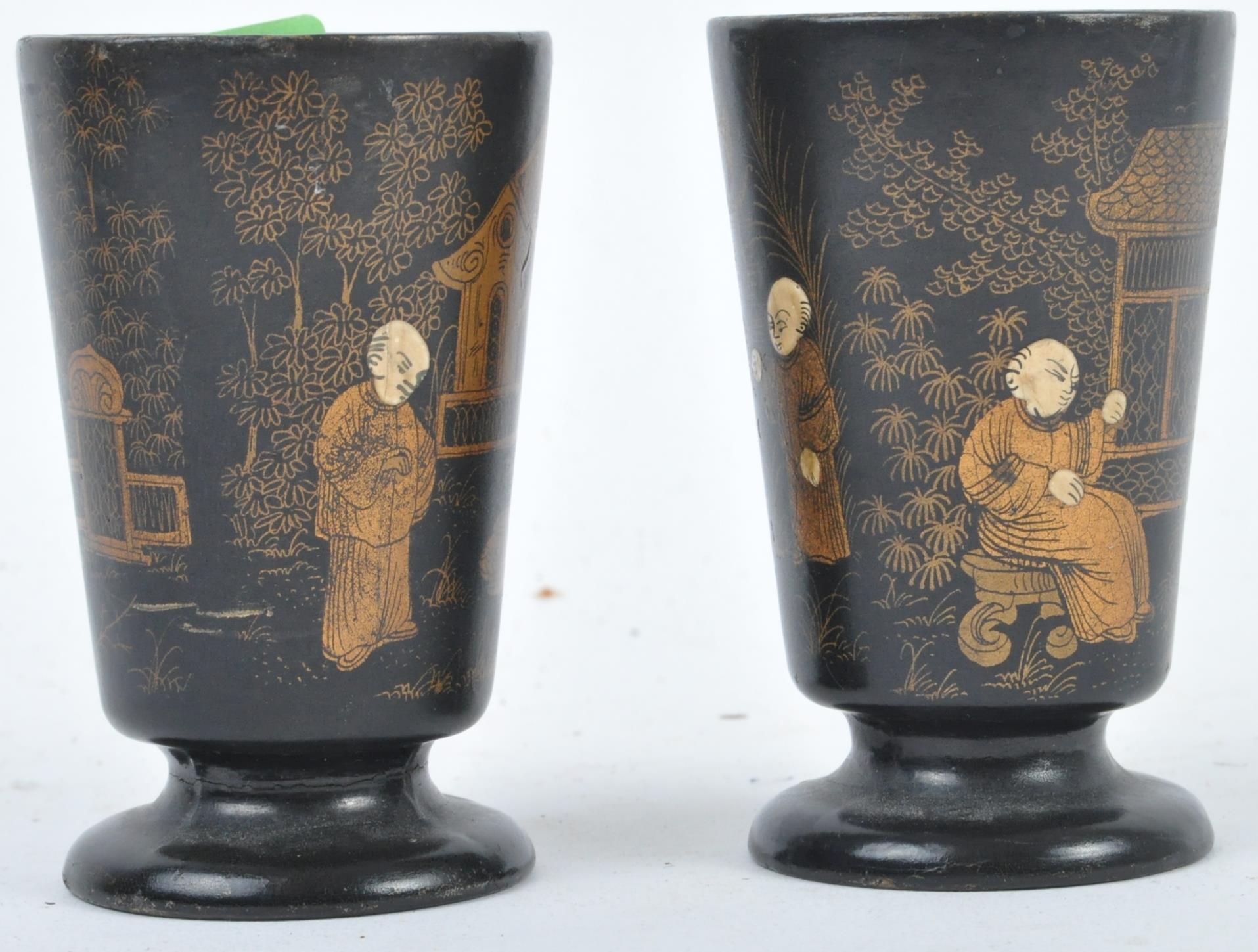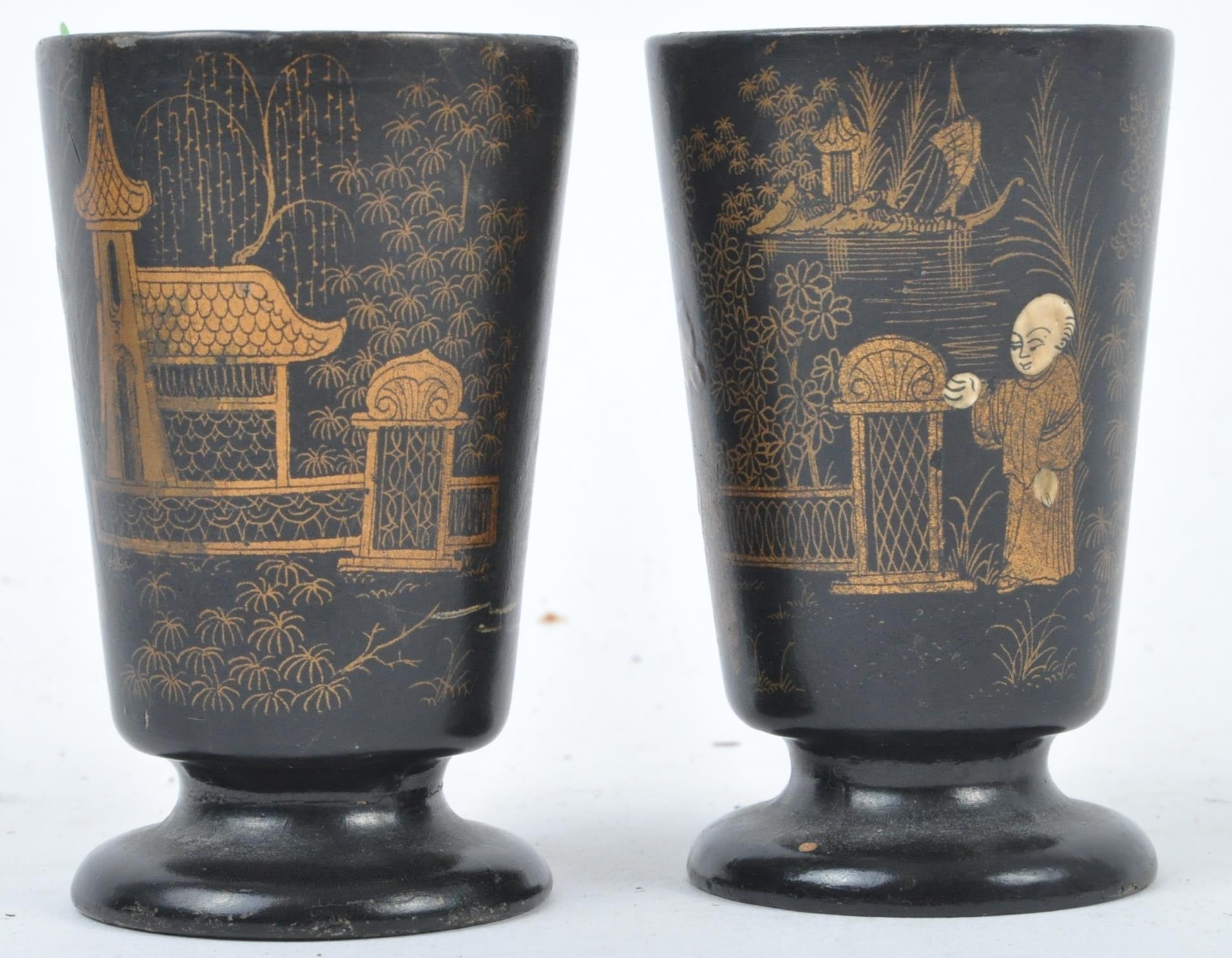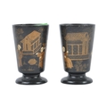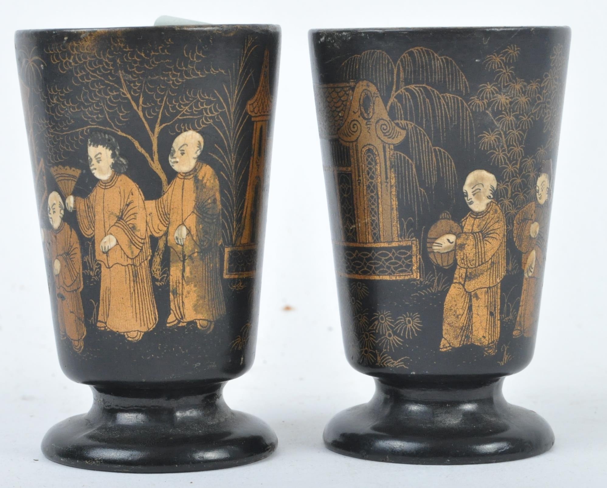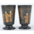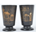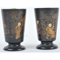 A pair of early 20th Century Chinese / Japanese black lacquer gilded drinking cups. Hand painted decoration depicting figures & buildings among trees. Measures approx; 8cm tall.