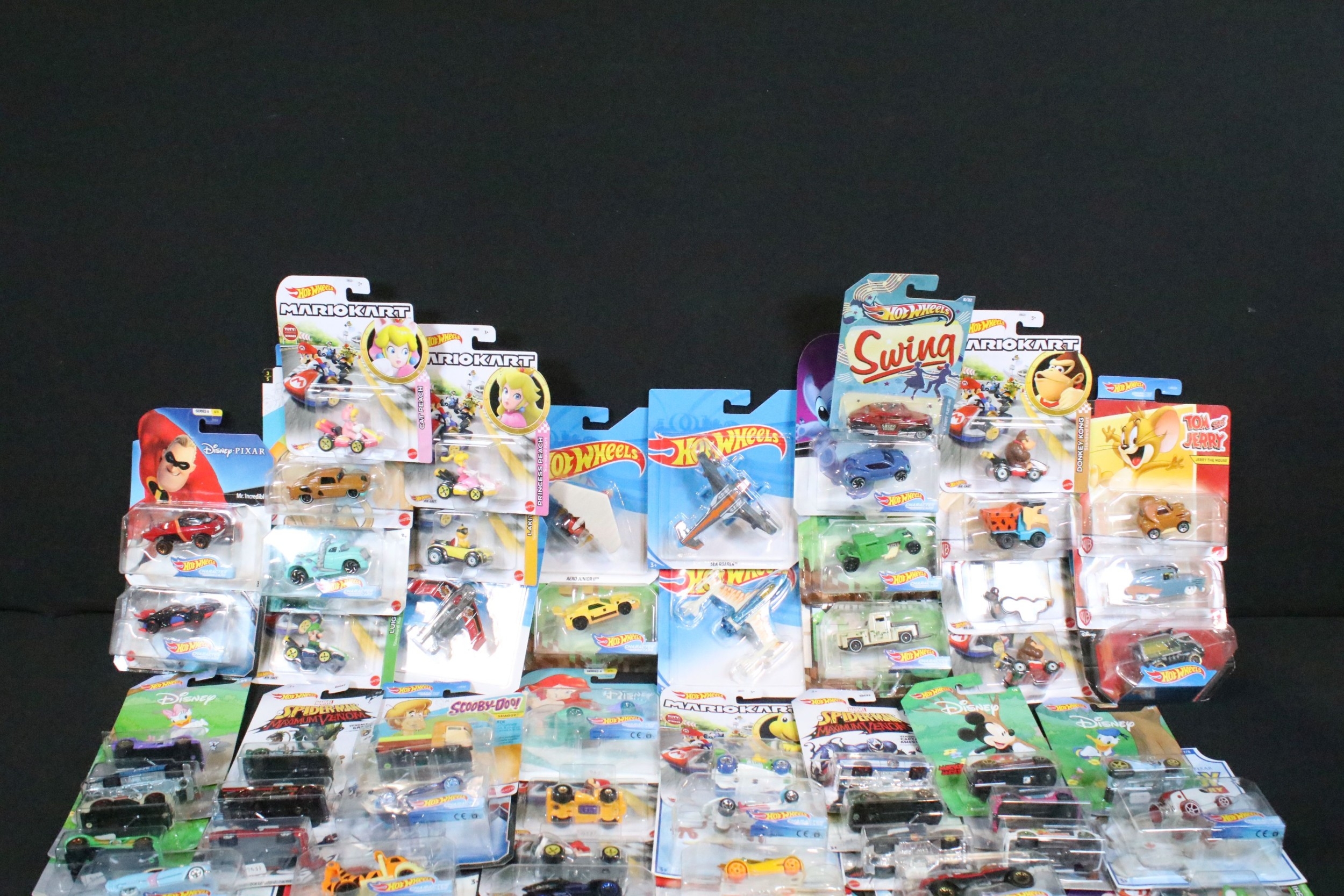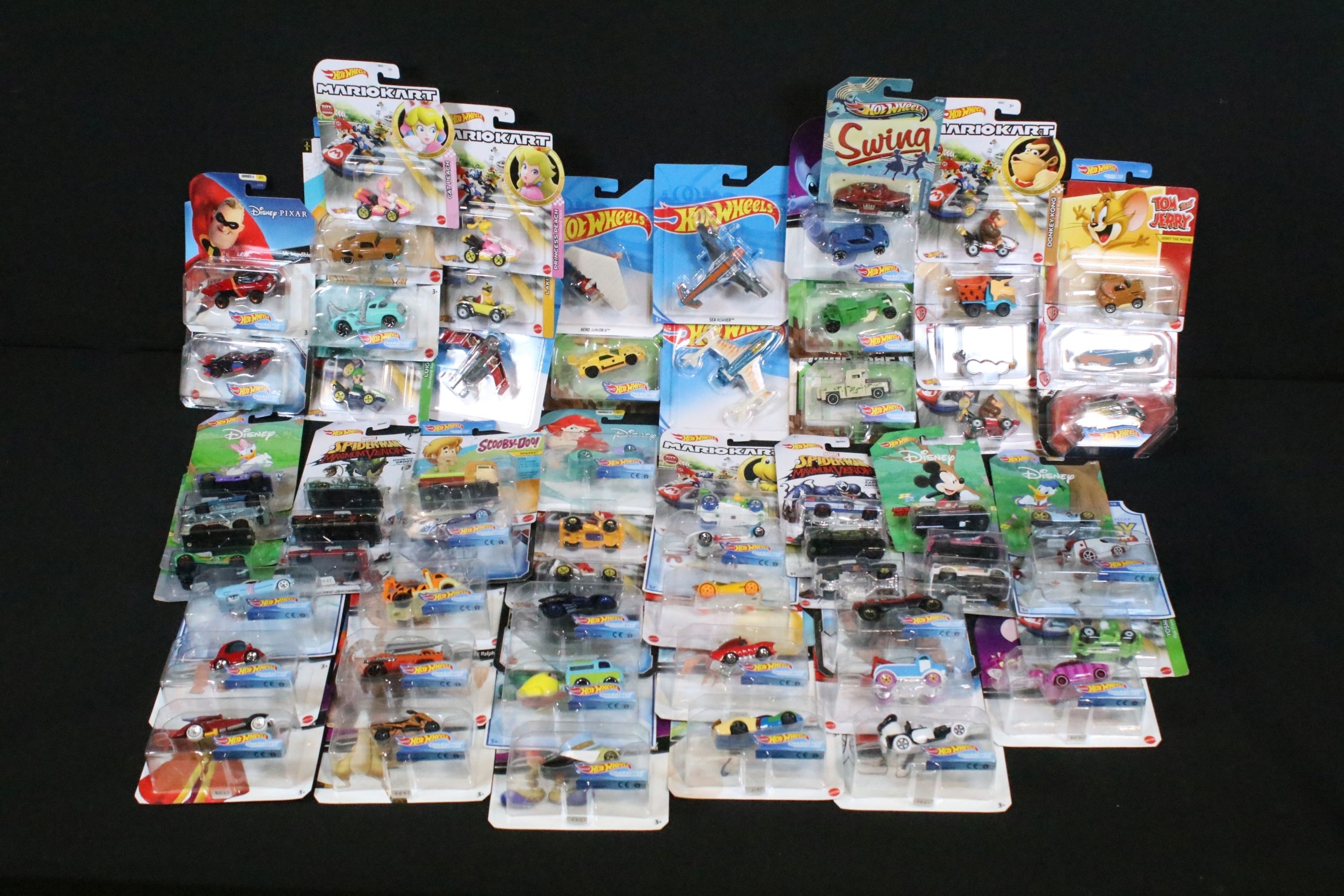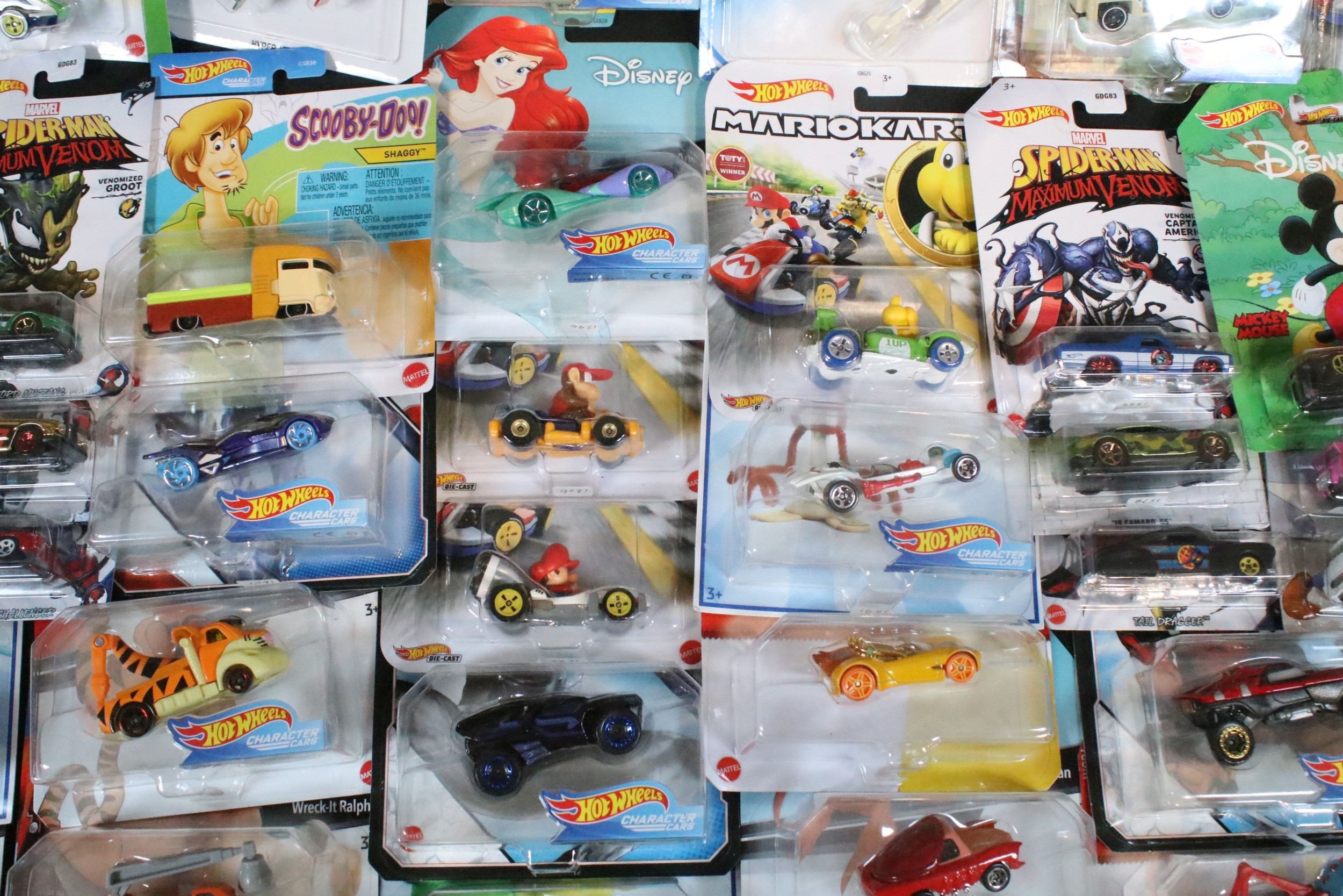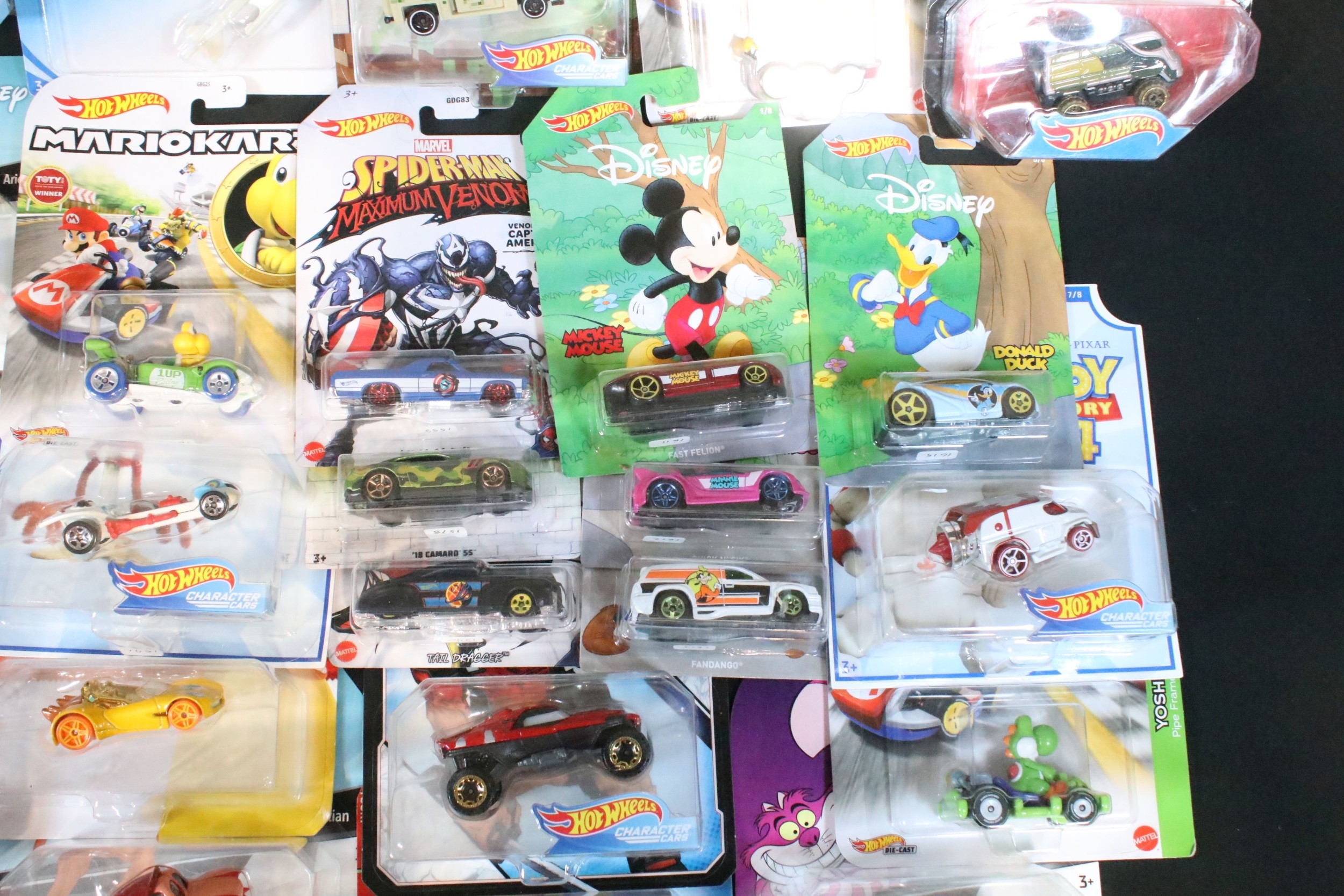60 Carded Mattel Hot Wheels diecast models to include Mario Kart, Marvel Spider-Man Maximum Venom, Disney Donald Duck, Tom And Jerry, Minecraft, Toy Story, etc, all ex
