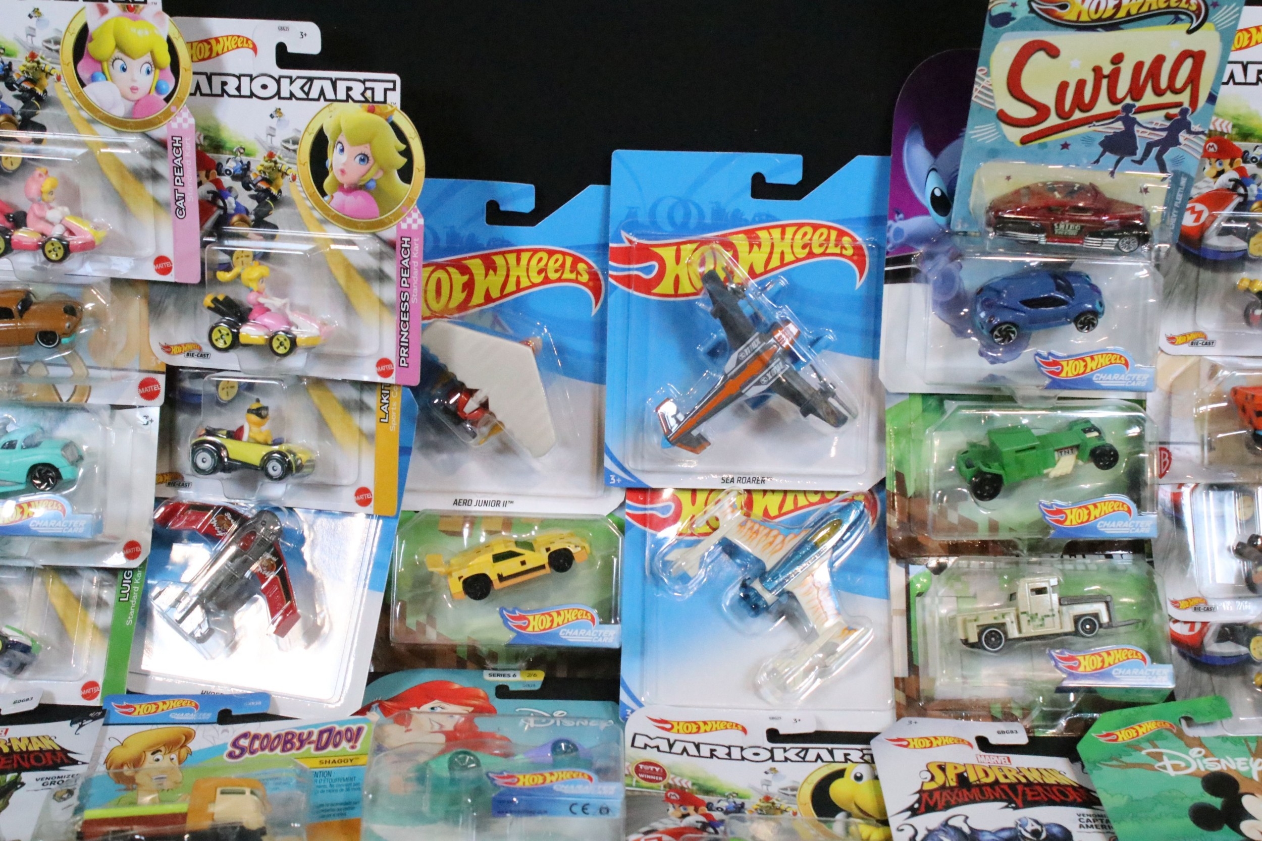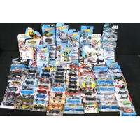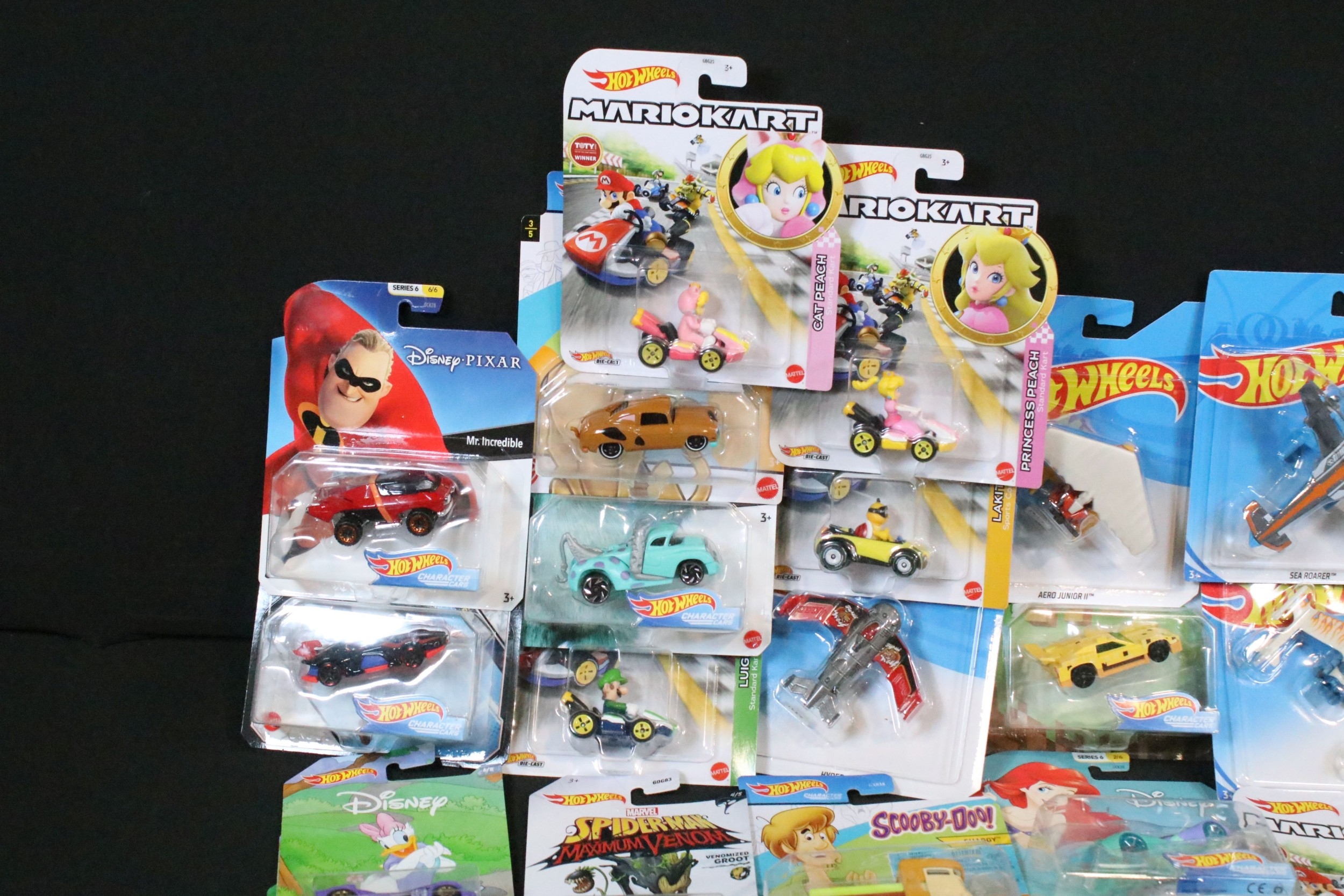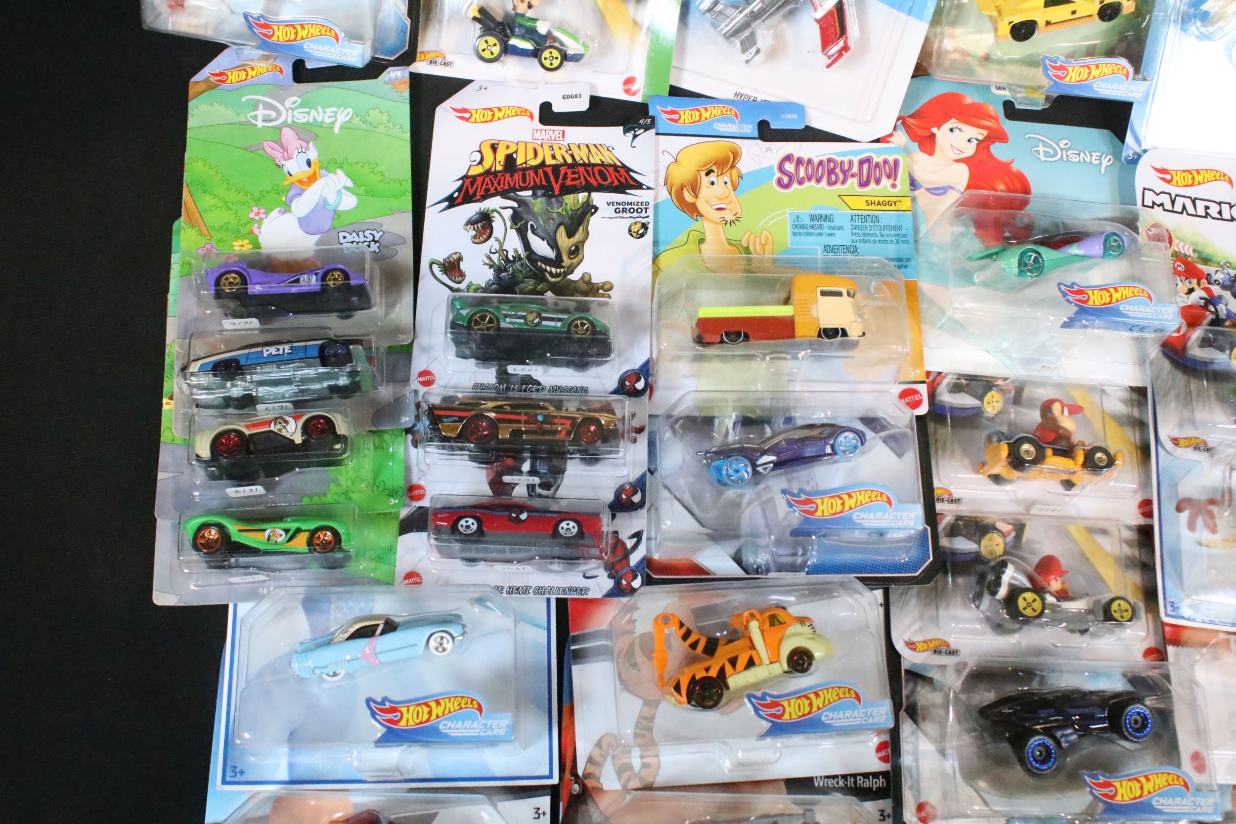 60 Carded Mattel Hot Wheels diecast models to include Mario Kart, Marvel Spider-Man Maximum Venom, Disney Donald Duck, Tom And Jerry, Minecraft, Toy Story, etc, all ex
