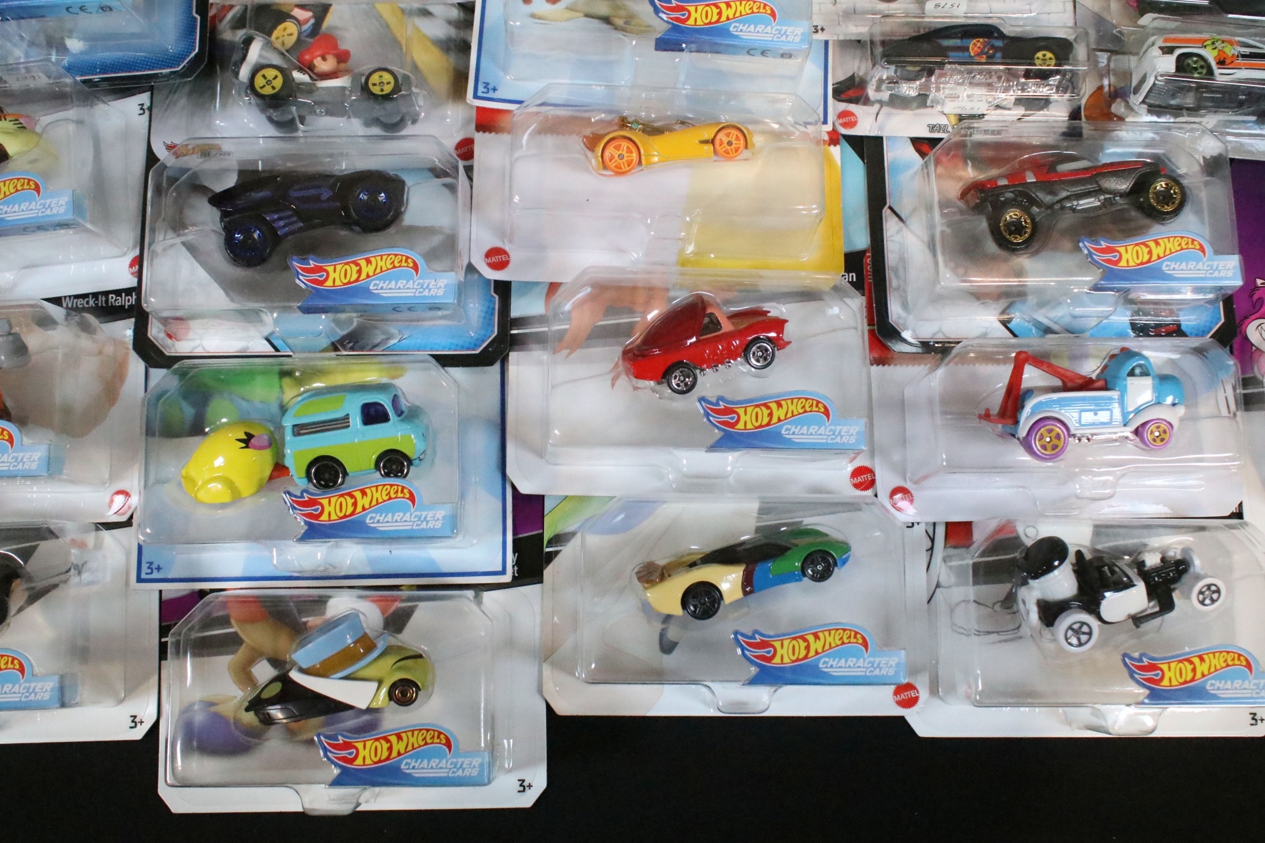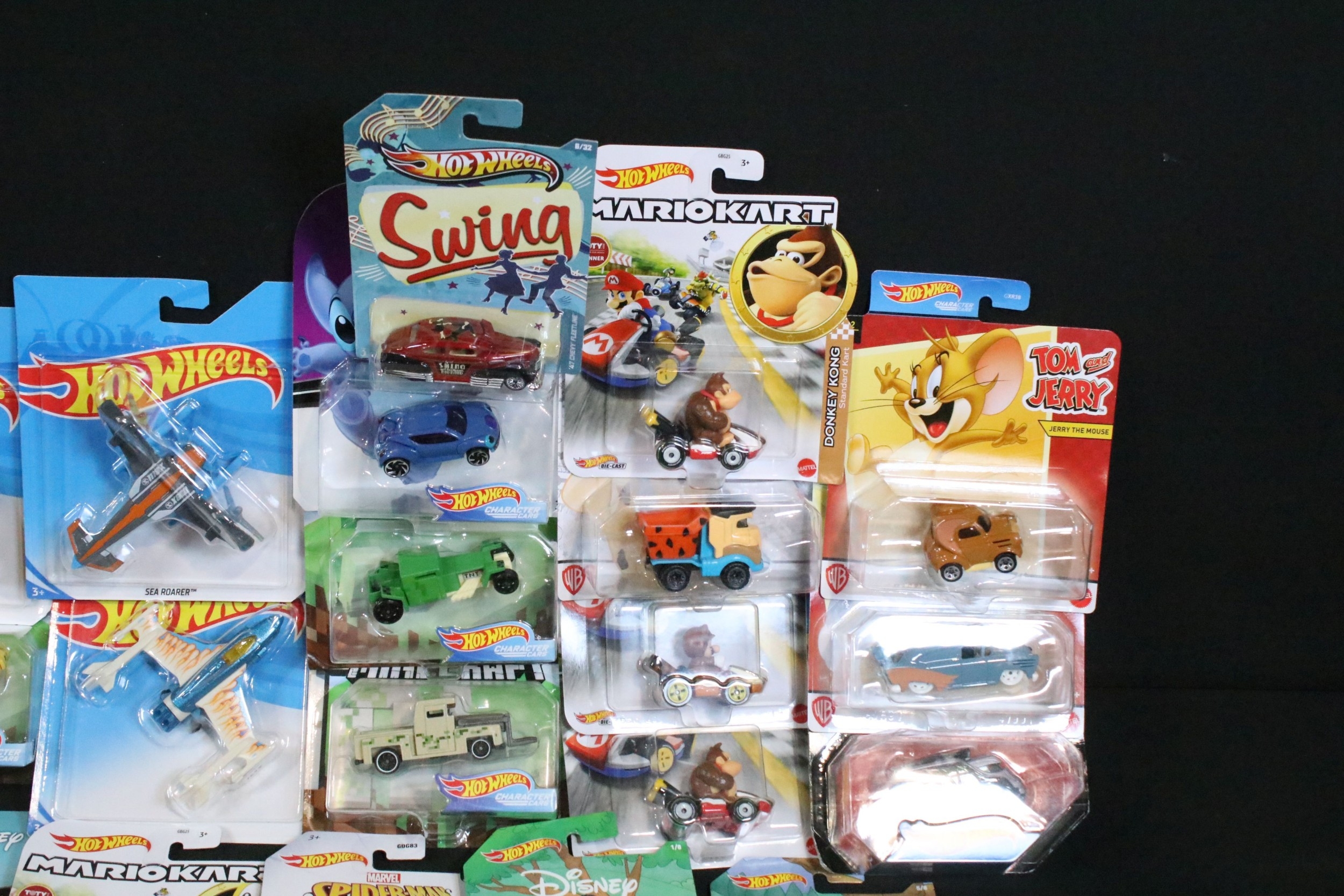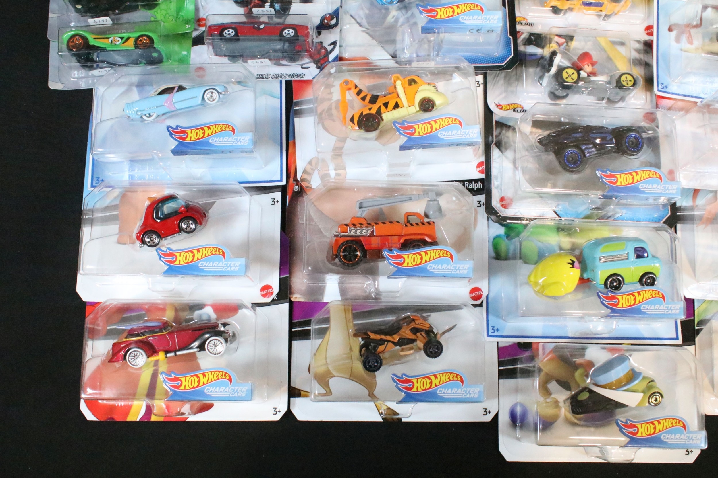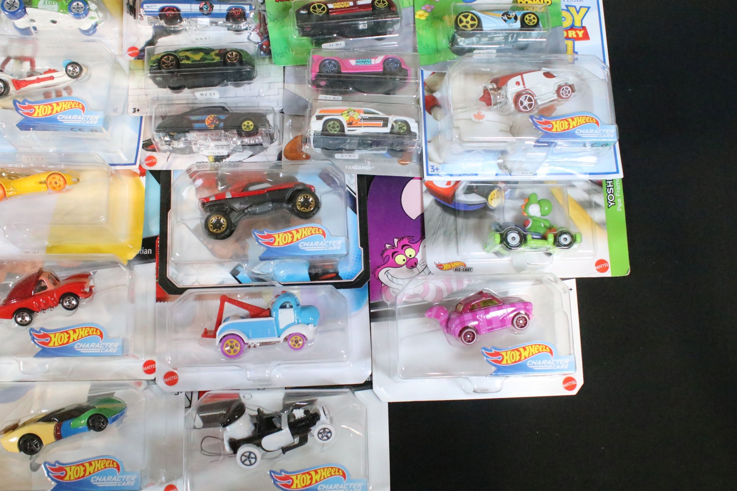 60 Carded Mattel Hot Wheels diecast models to include Mario Kart, Marvel Spider-Man Maximum Venom, Disney Donald Duck, Tom And Jerry, Minecraft, Toy Story, etc, all ex