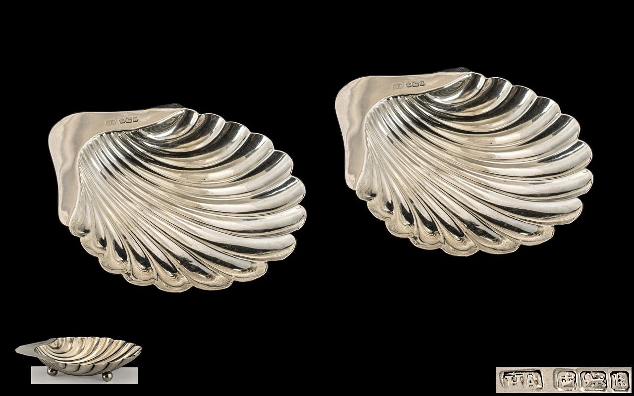 Edwardian Period 1902 - 1910 Superb Quality Pair of Sterling Silver Dishes In Oyster Shell Form and Raised on 3 Ball Feet. Hallmark Sheffield 1902, Maker H.A ( Henry Atkin ) Both Dishes In Wonderful Condition. Weight 107.7 grams. Each 4.75 Inches - 11.90 cm Diameter.