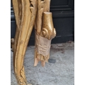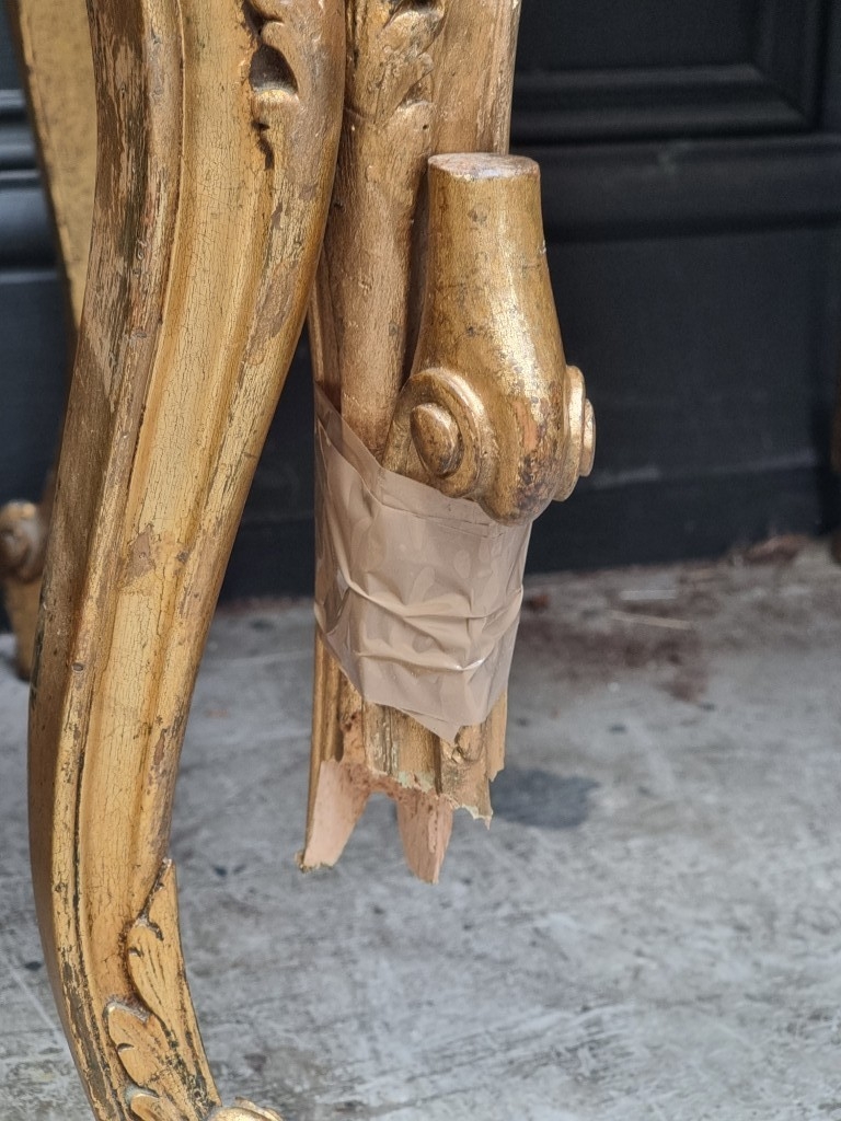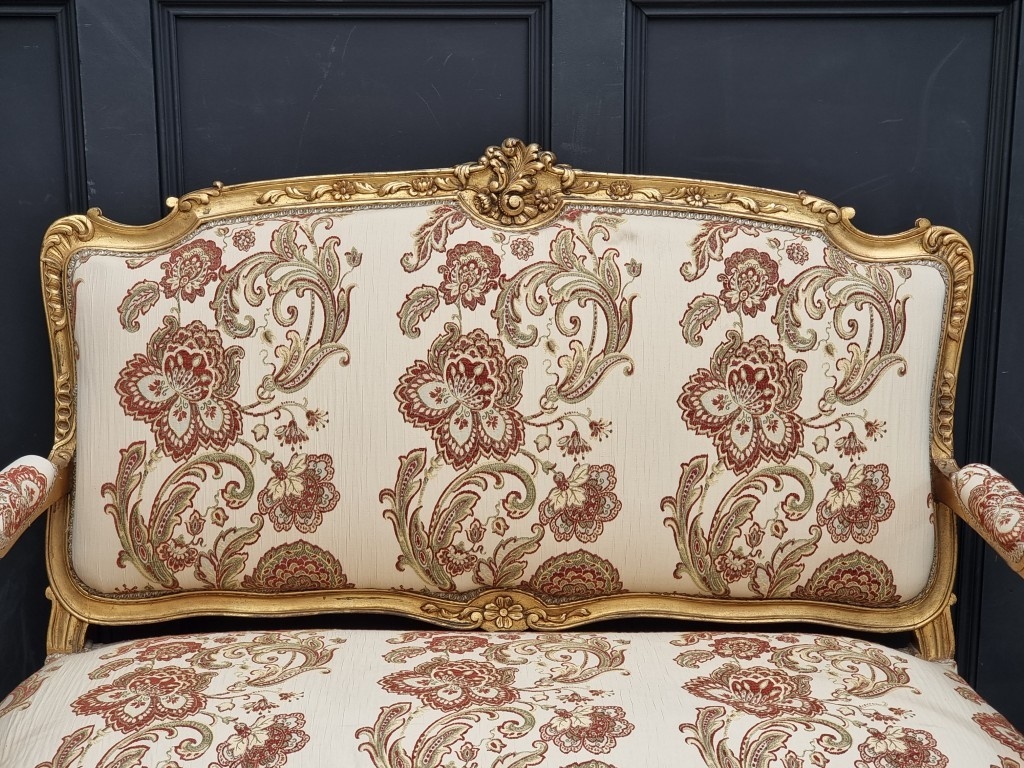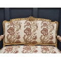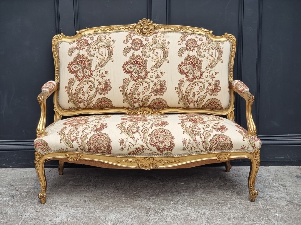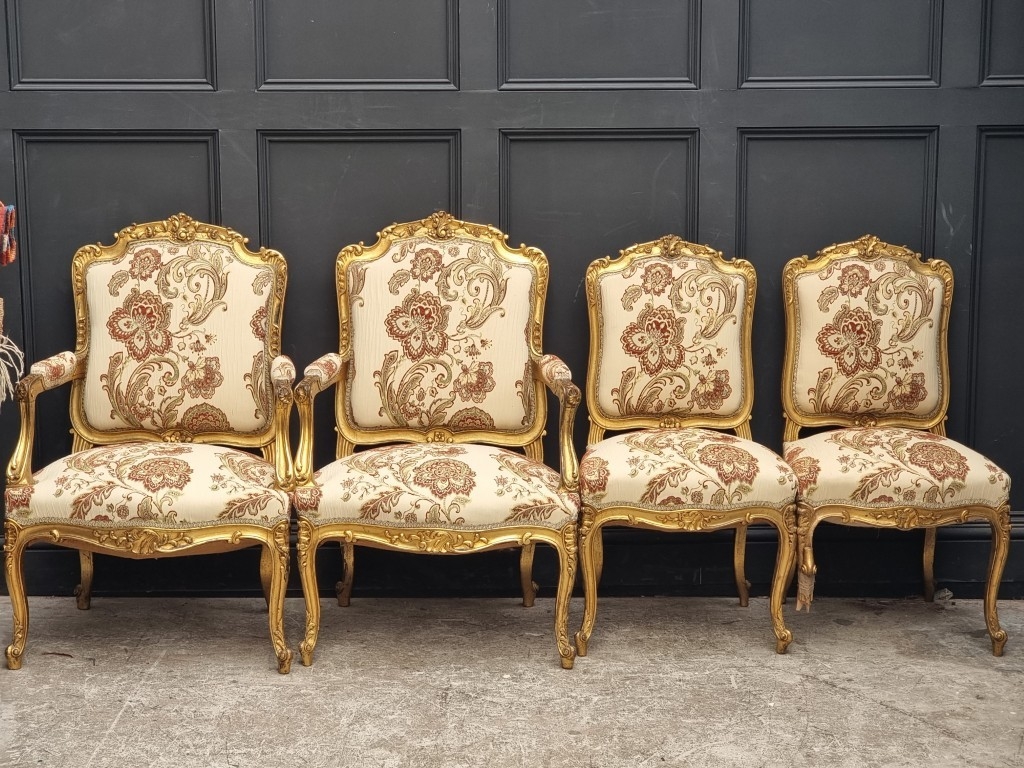 A Louis XV style carved giltwood and upholstered salon suite, comprising: a settee, 132cm wide; a pair of open arm elbow chairs; and a pair of side chairs, (break to leg on one side chair). (5)