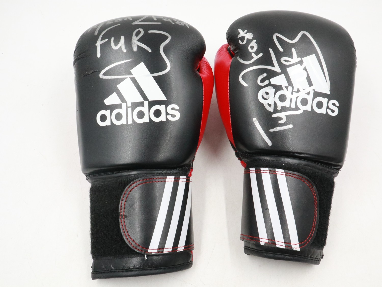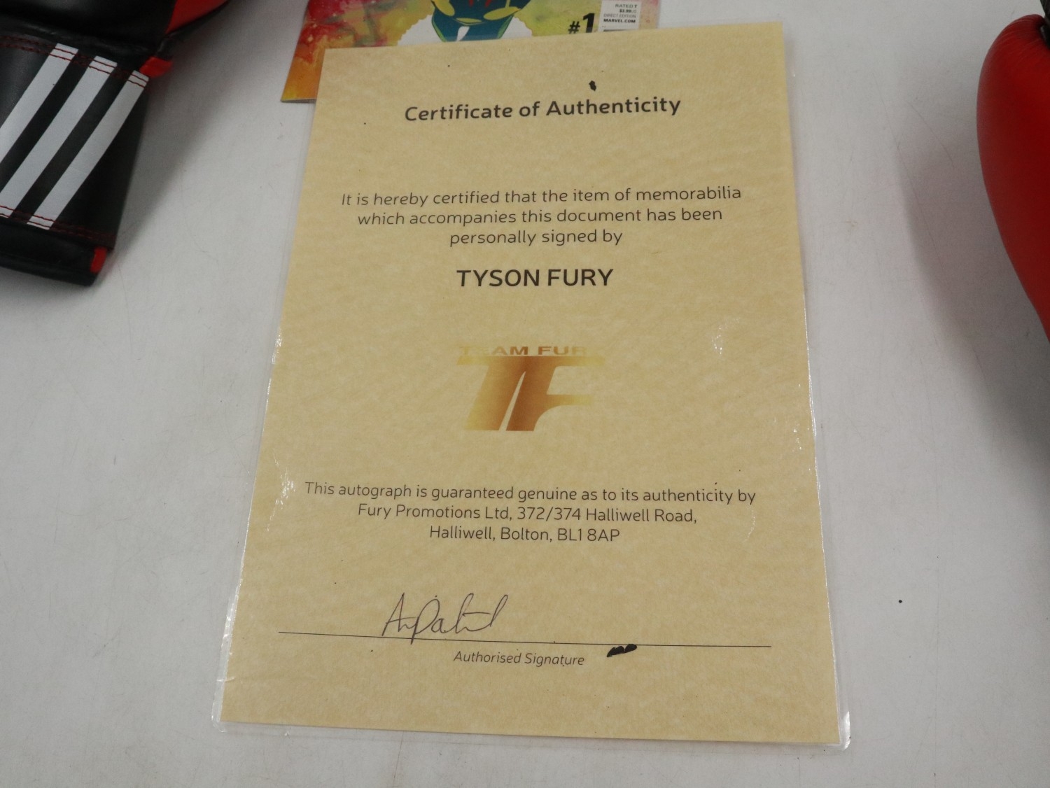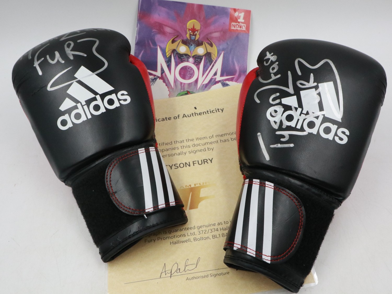Pair of signed boxing gloves by Tyson Fury, with CoA present. UK P&P Group 2 (£24+VAT for the first lot and £5+VAT for subsequent lots)