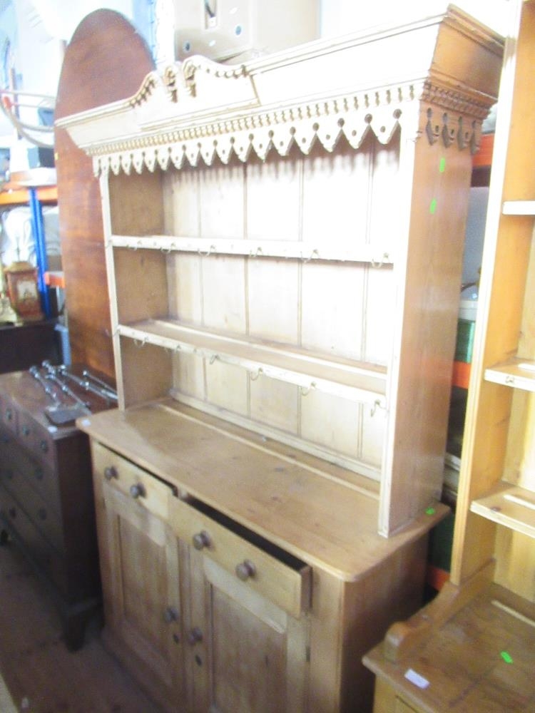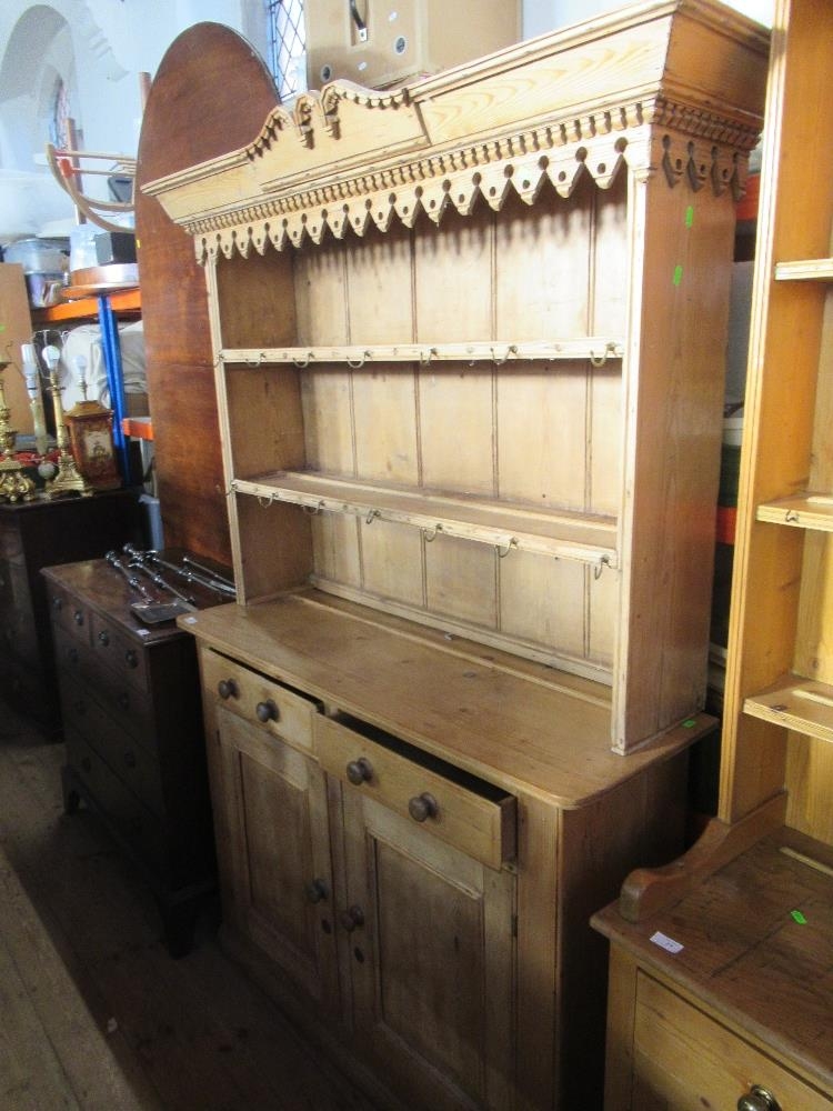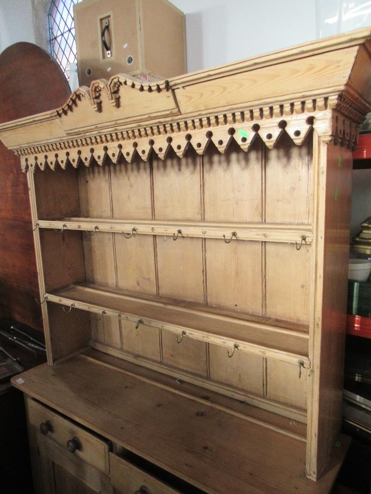 A pine dresser with plate rack over base, filled two drawers over cupboard doors, width 48ins , height 78ins