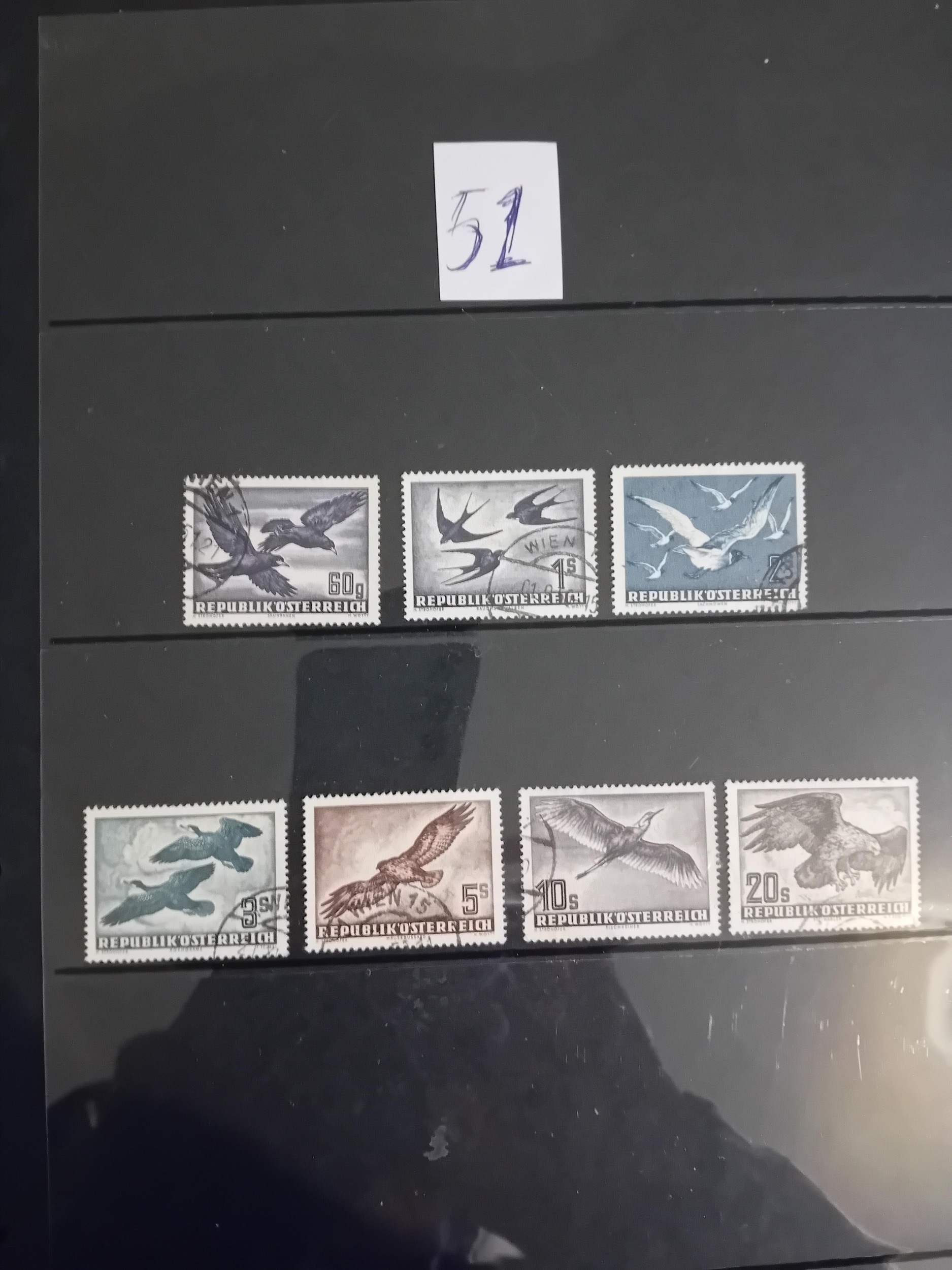 Stamps : Austria - The scarce 1950 air set of birds, f. used, SG1215-21, cat value £440.