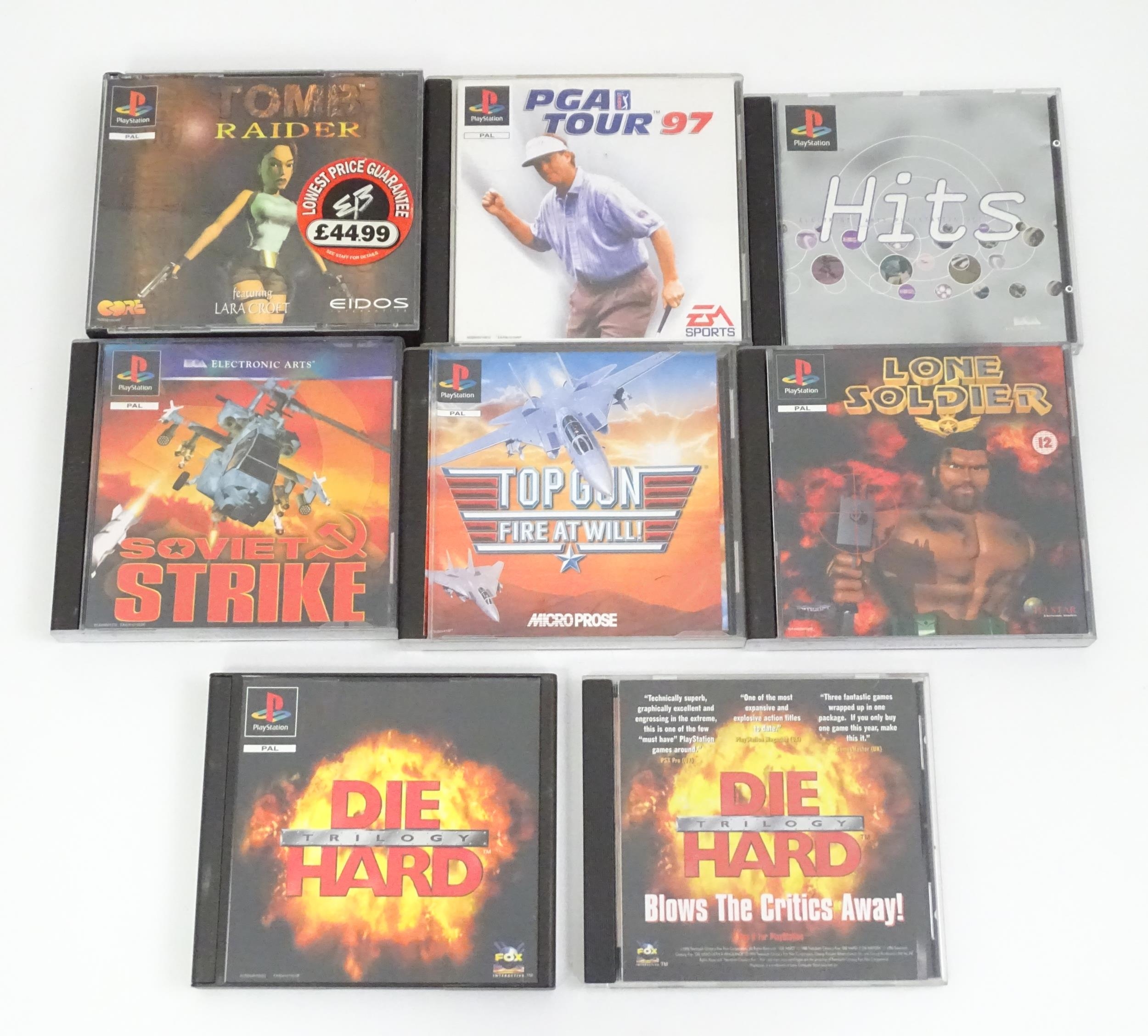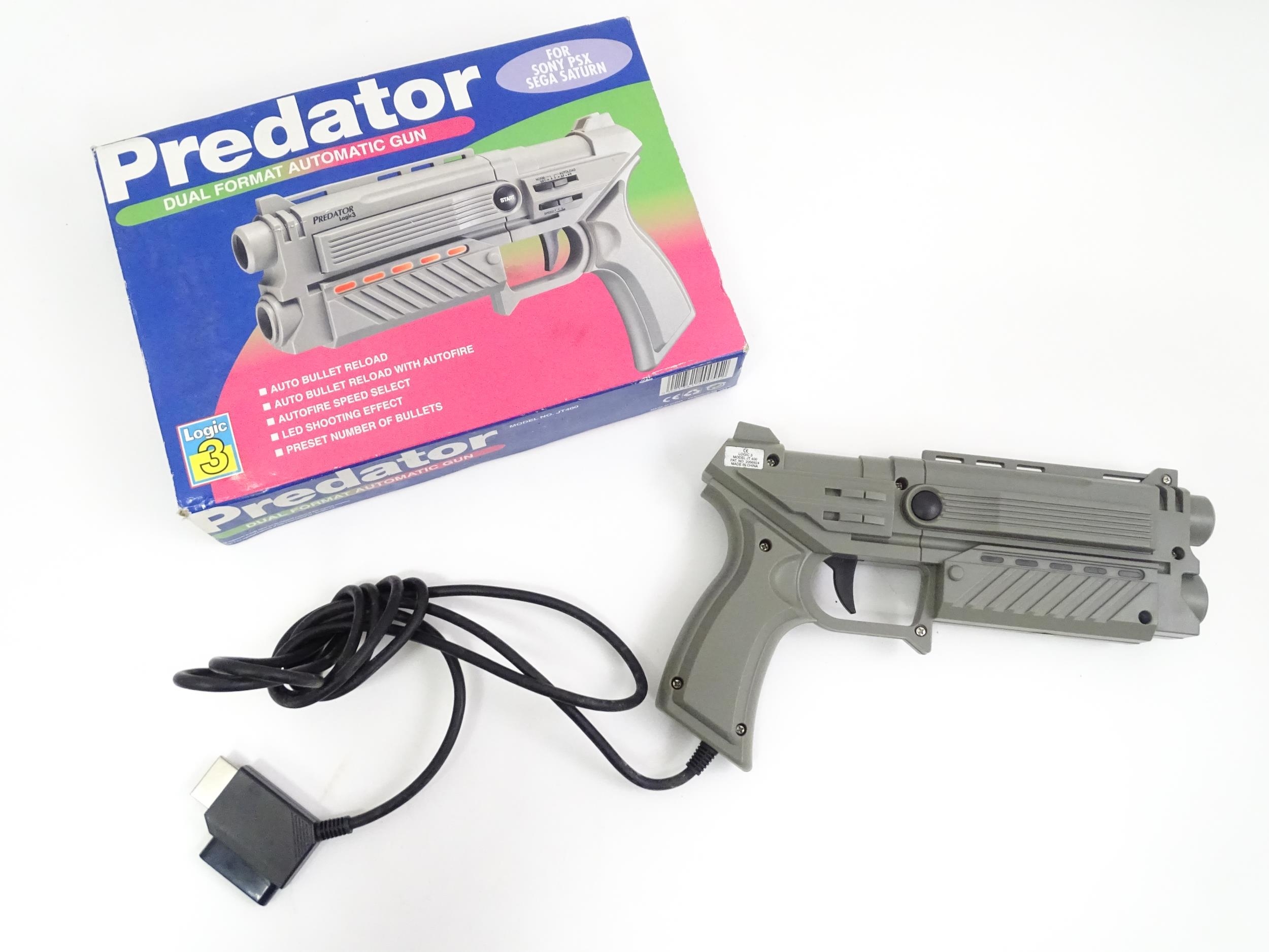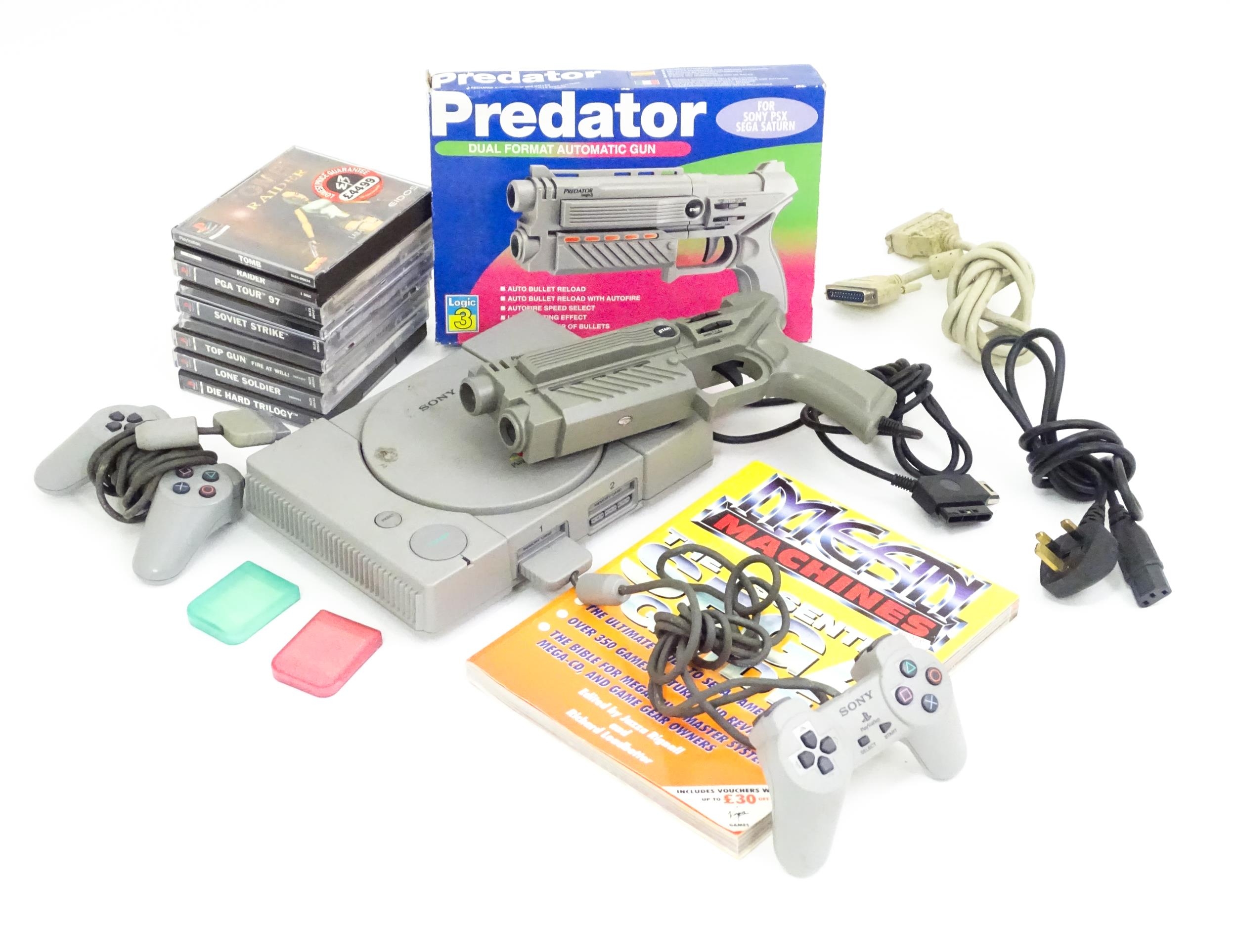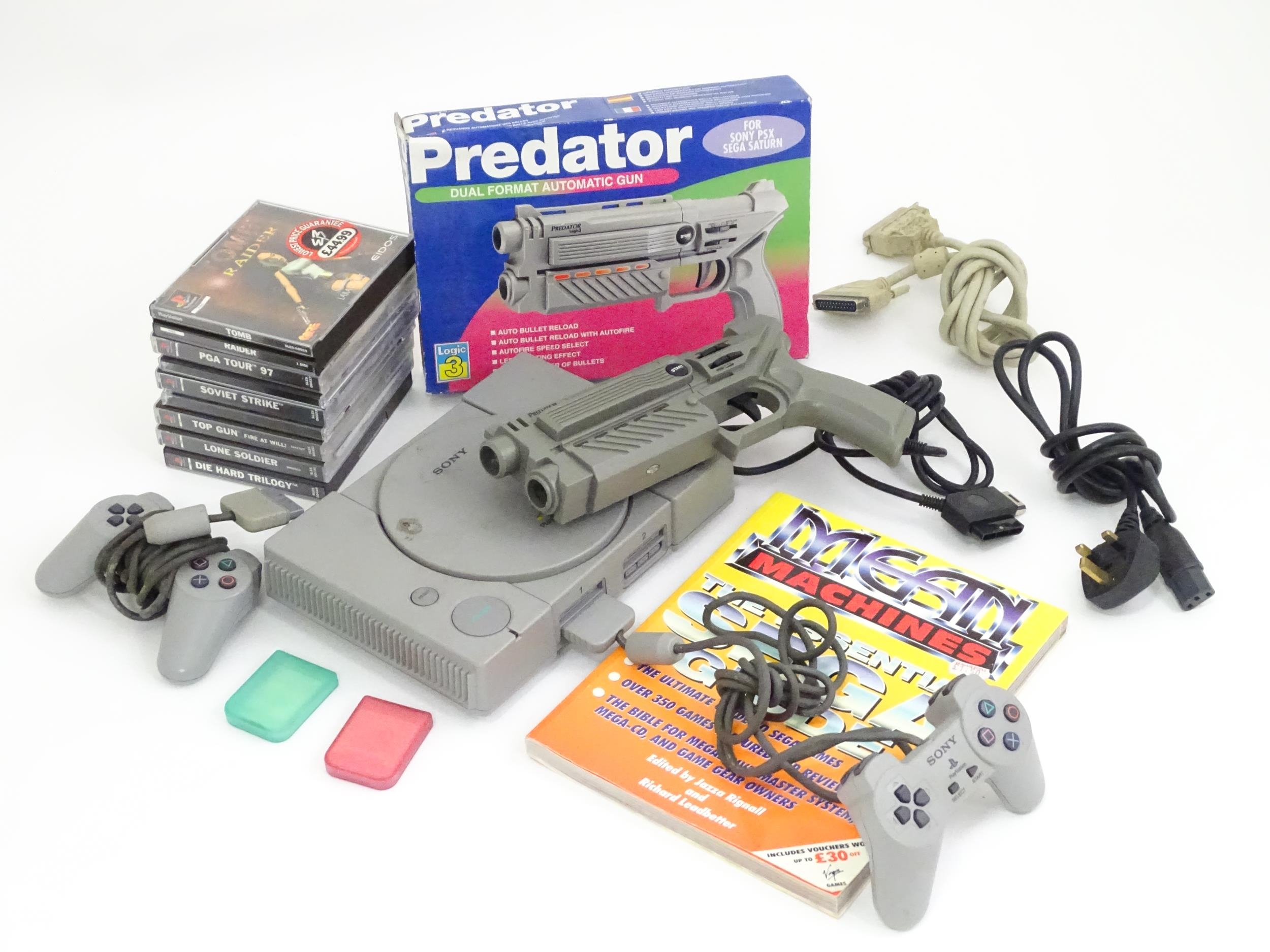 Toys: A Sony PlayStation 1 (PS1 / PSX) video game console, with two controllers and a Predator dual format automatic gun. Together with various games to include Tomb Raider, PGA Tour 97, Top Gun Fire at Will, Lone Solider, Soviet Strike, etc.