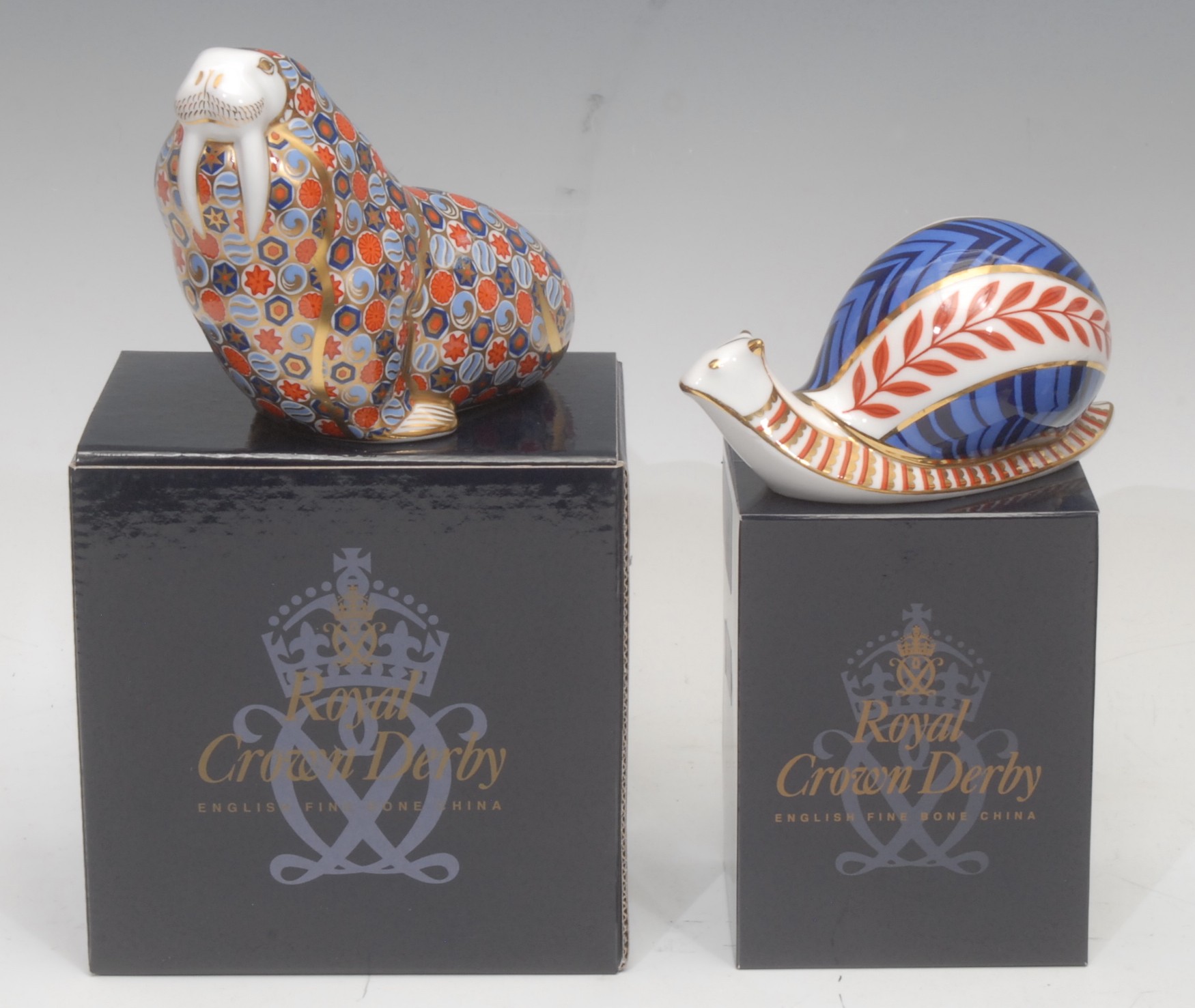 A Royal Crown Derby paperweight, Walrus, silver stopper, 10.5cm high, boxed; another, Snail, silver stopper, 6.5cm high, boxed, both second quality (2)