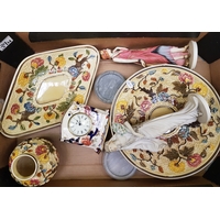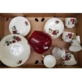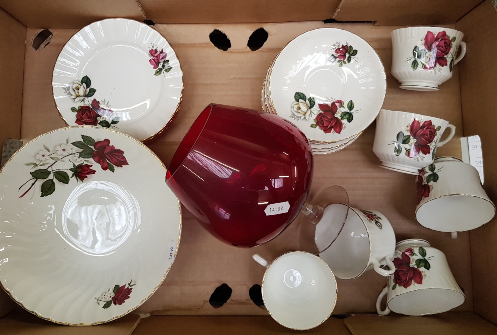 Royal Stafford tea set (18pc): similar fruit/serving bowl and a large decorative red brandy glass (1 tray).
