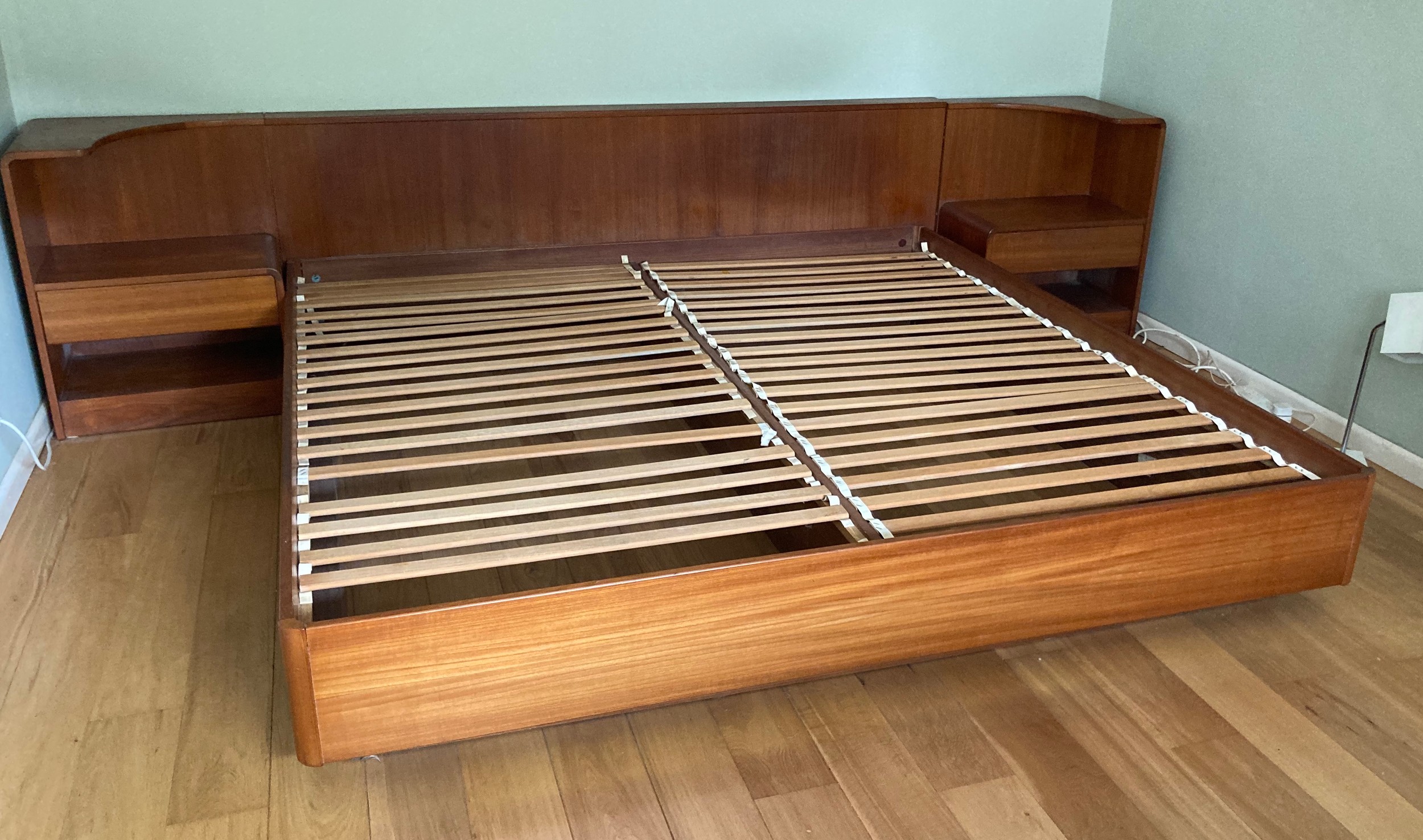 Furniture 1970’s Danish teak bedroom suite by Vinde Mobelfabrik, five peices, a king size bed base with two bedside cupboards, a chest of four drawers and a double sized chest with eight drawers.