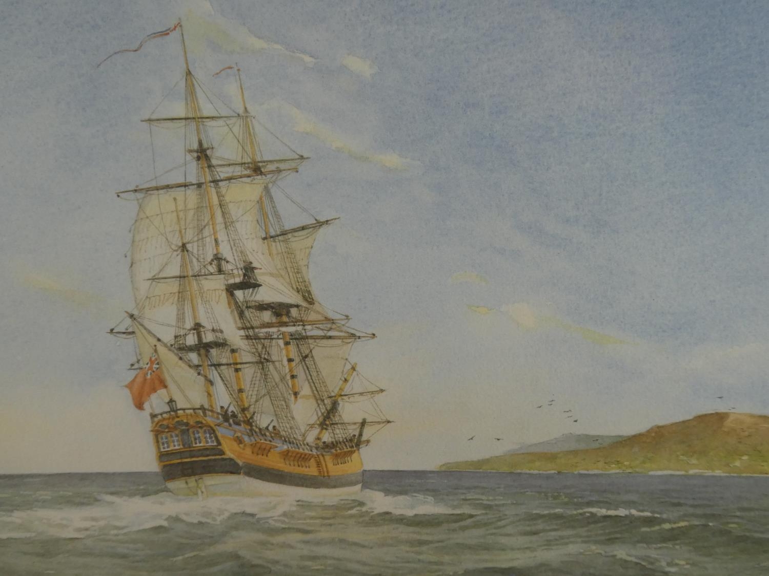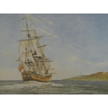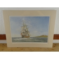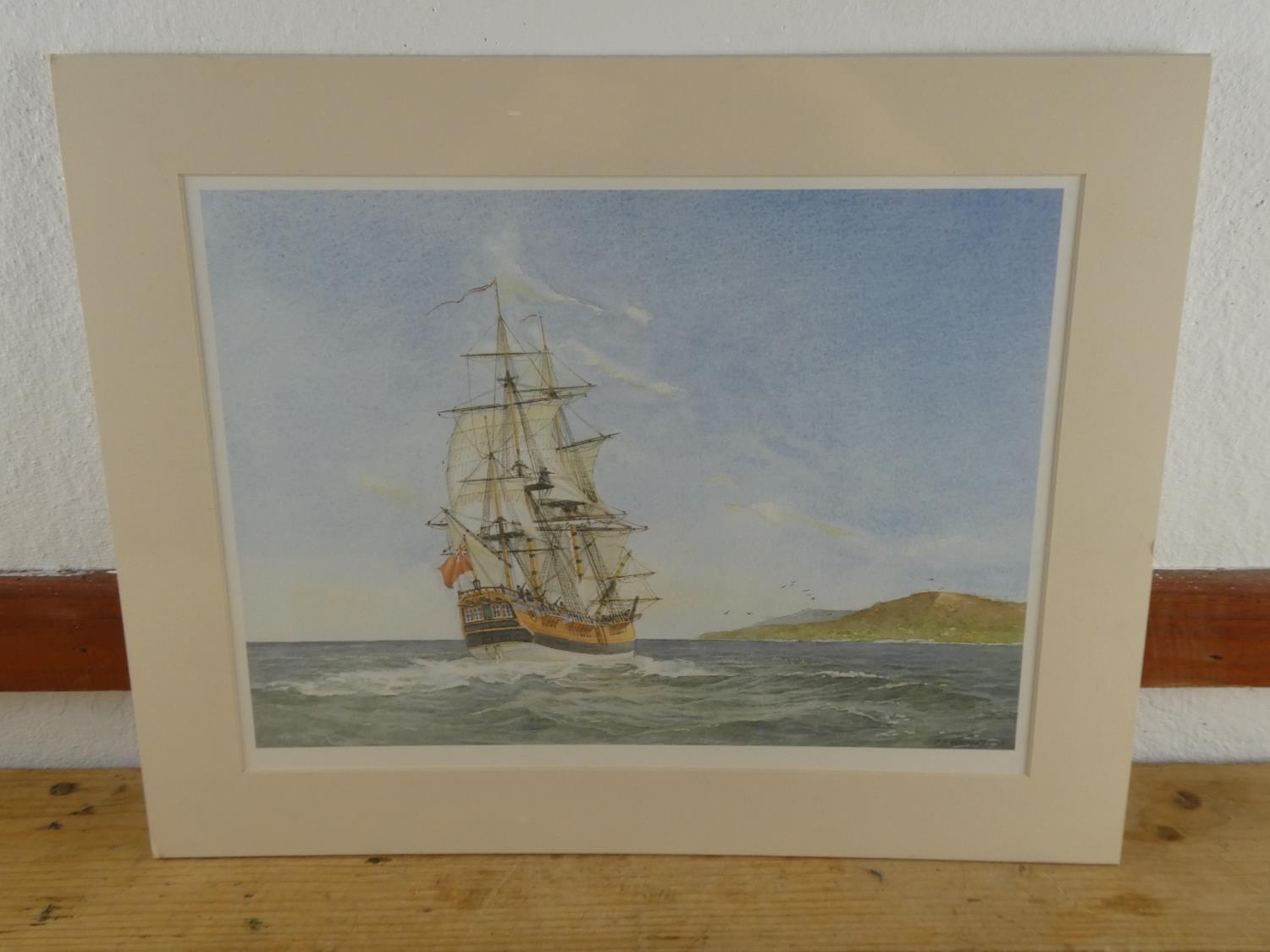 An unframed print of a sailing ship.