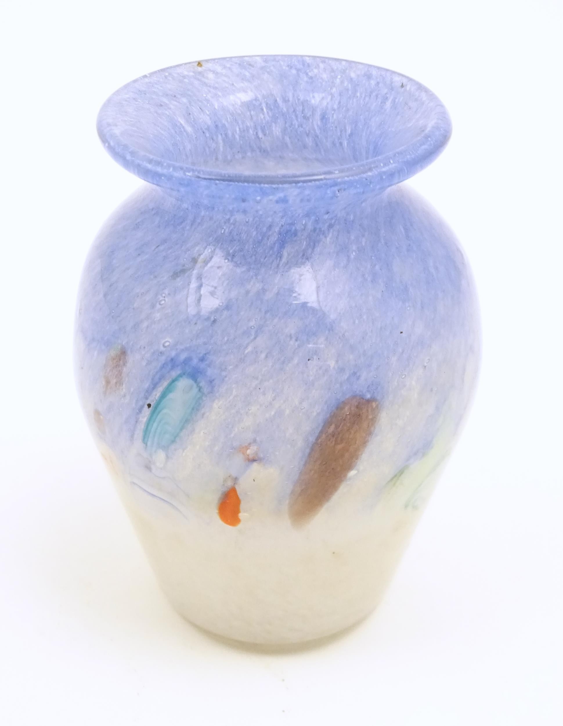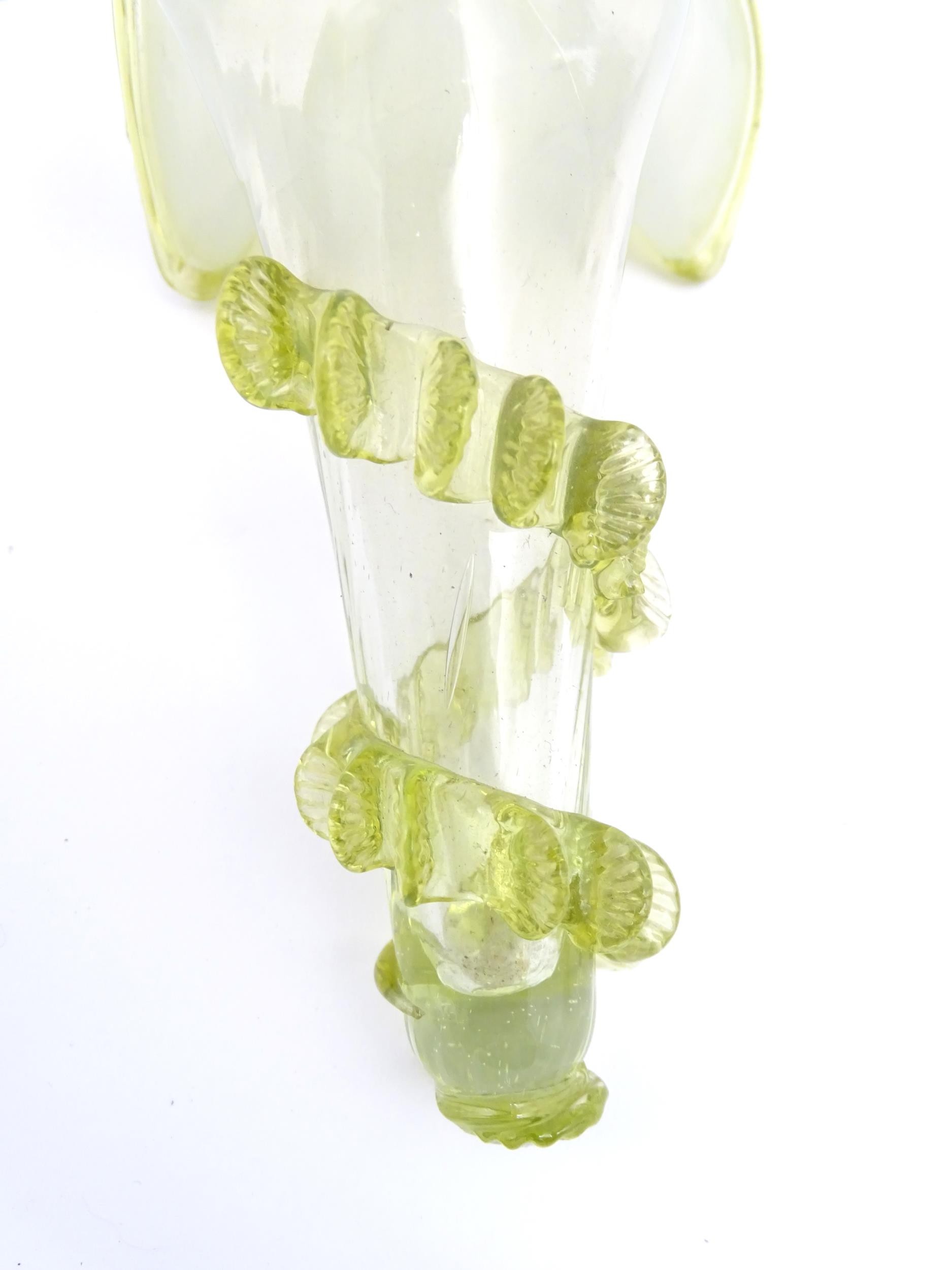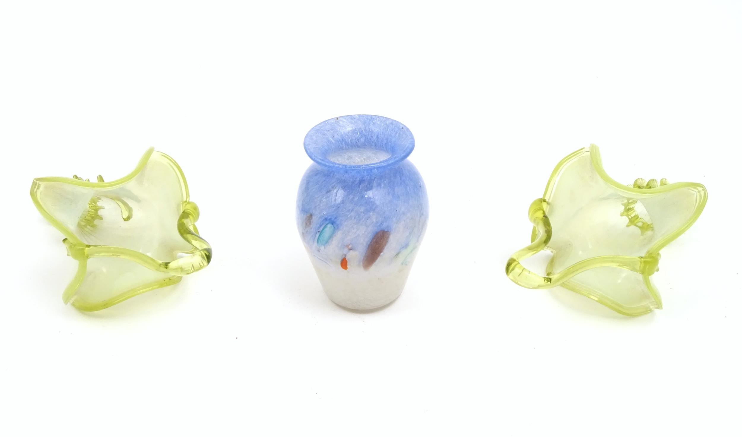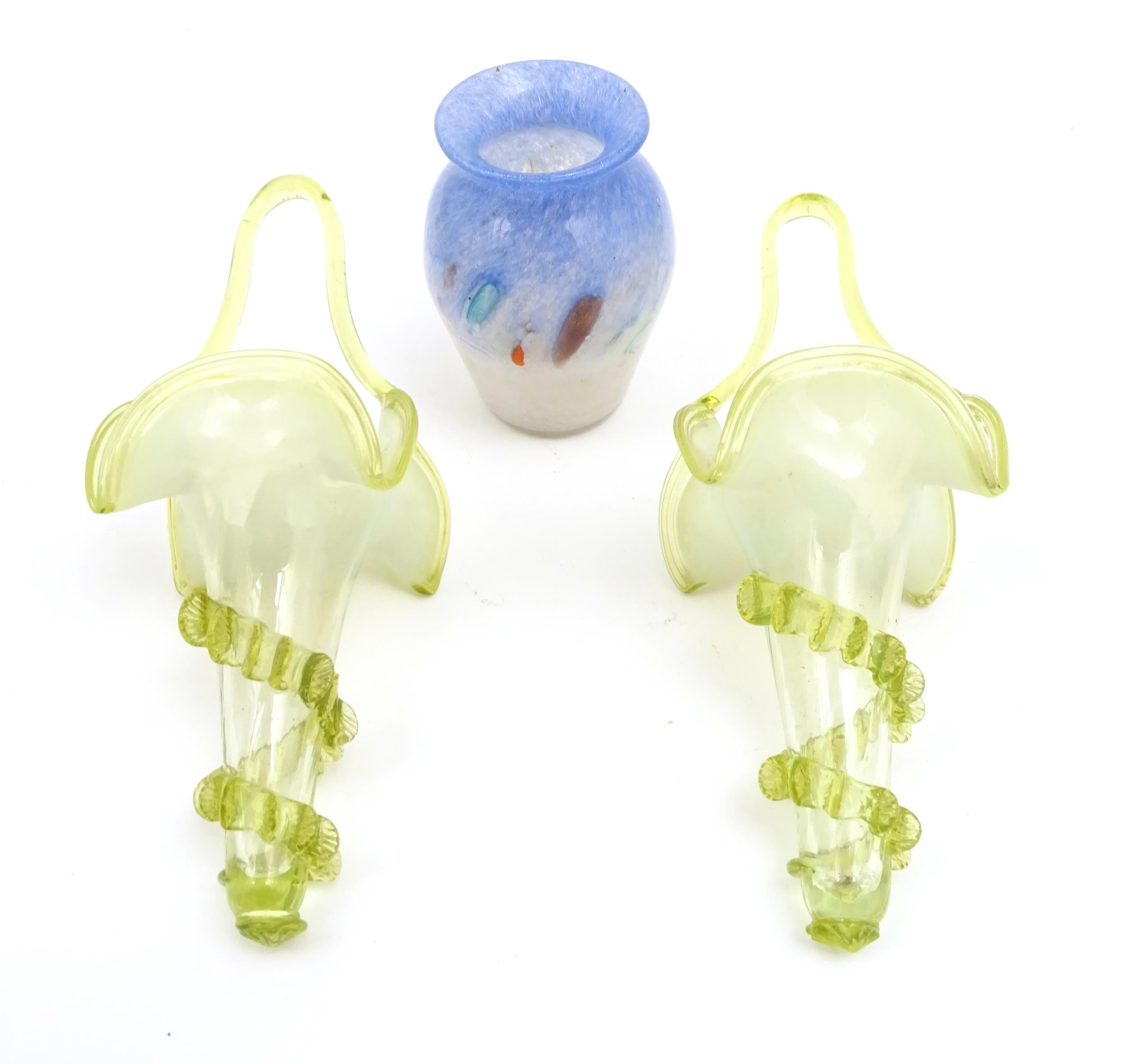 Two vaseline glass hanging epergne baskets together with an Art glass vase approx 4"high (3)