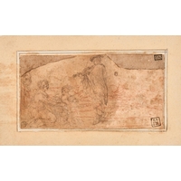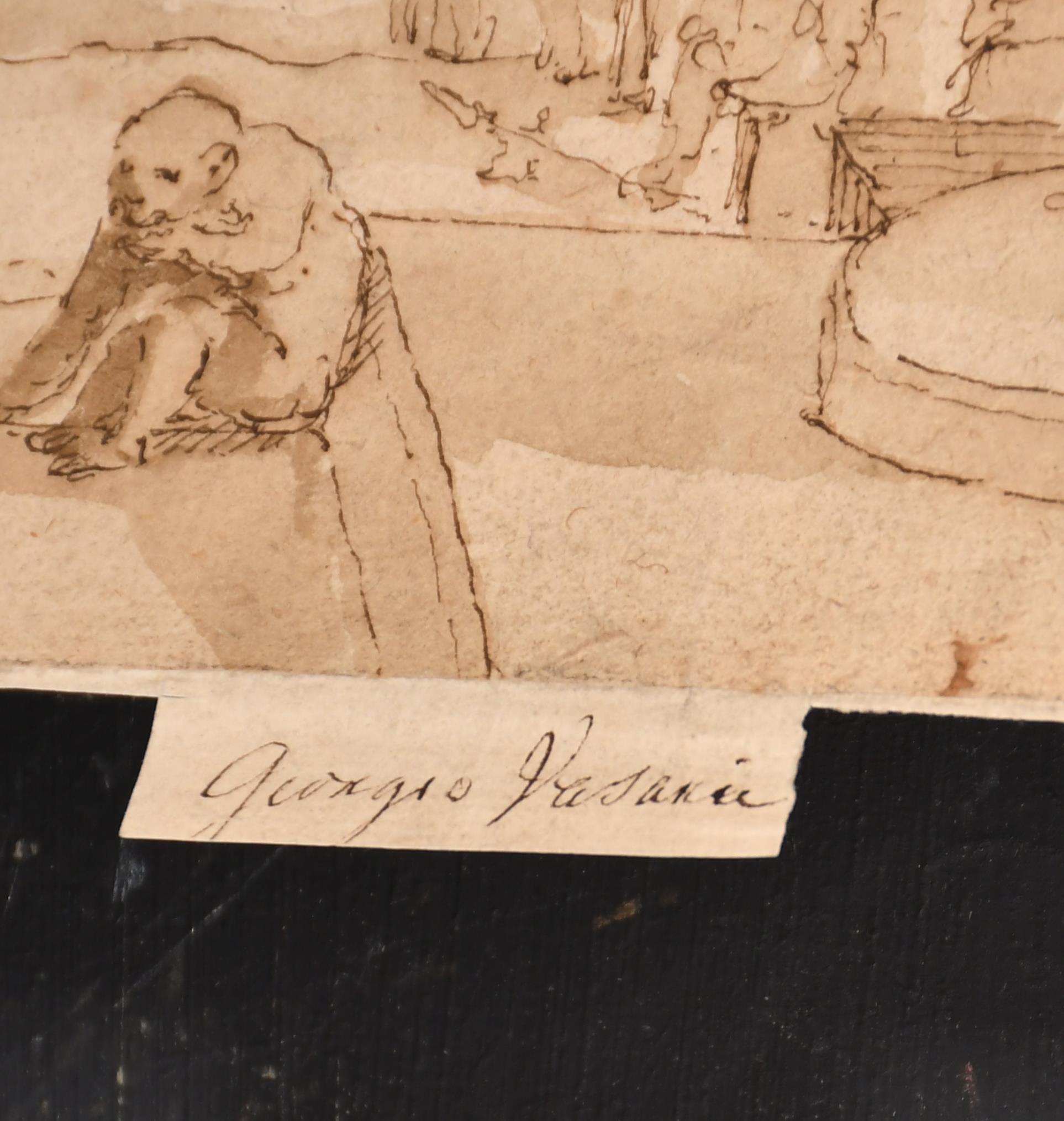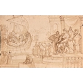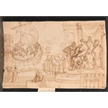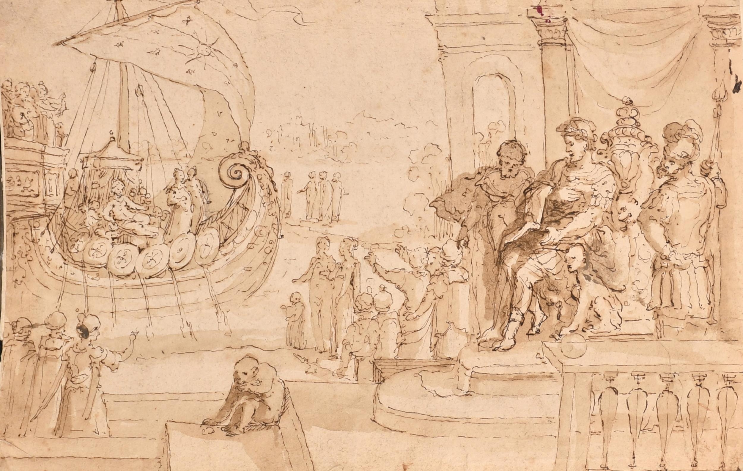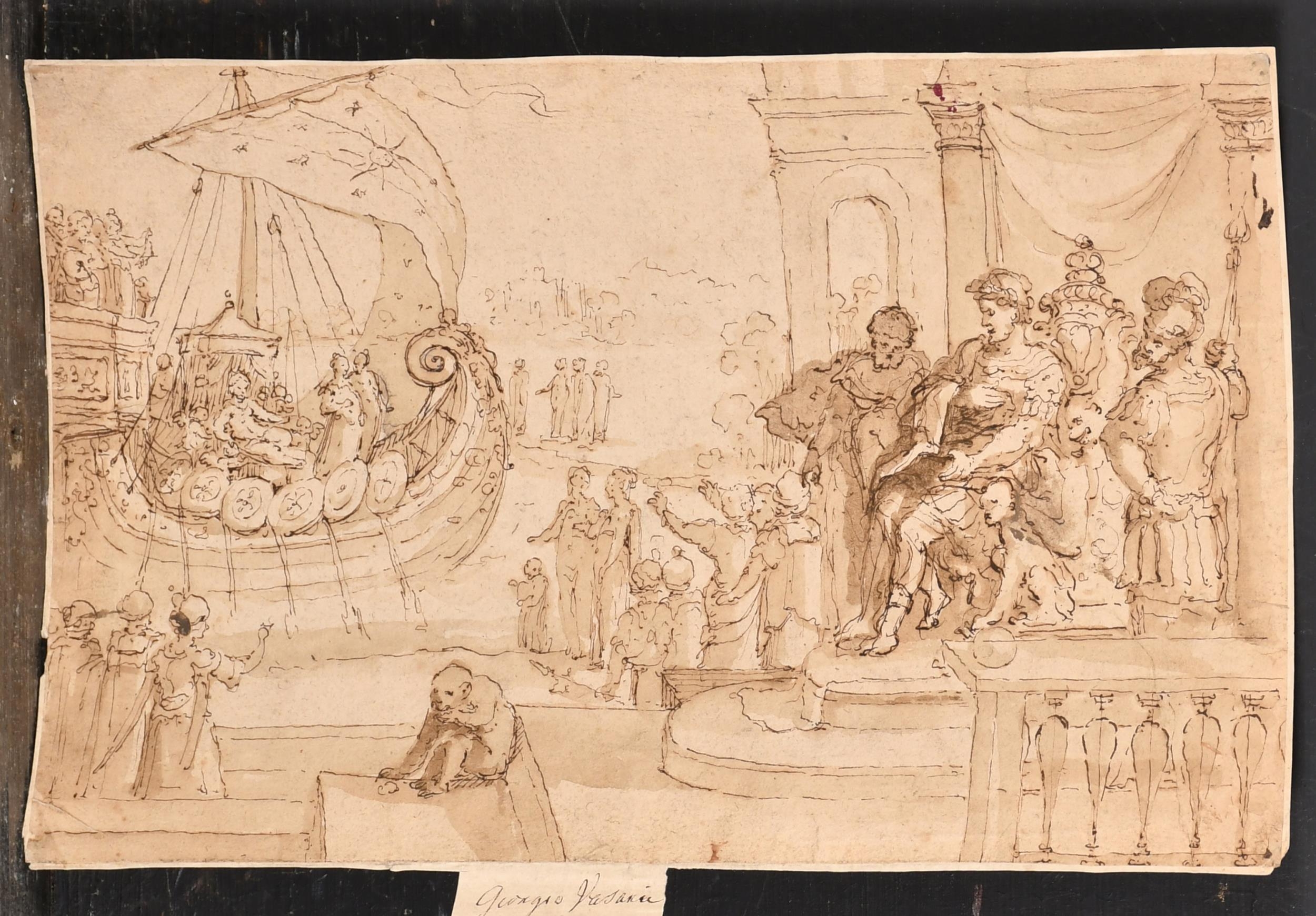 Circle of Giorgio Vasari (1511-1574) Italian. Classical Figures with a Galleon, Ink and wash, Inscribed, unframed 7.2" x 11.5" (18.3 x 29.2cm)