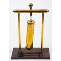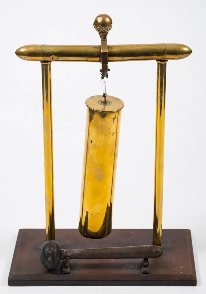 A trench art shell case dinner gong: the shell suspended between two brass column supports with ball finial , on a Bakelite base, 44cm high.