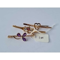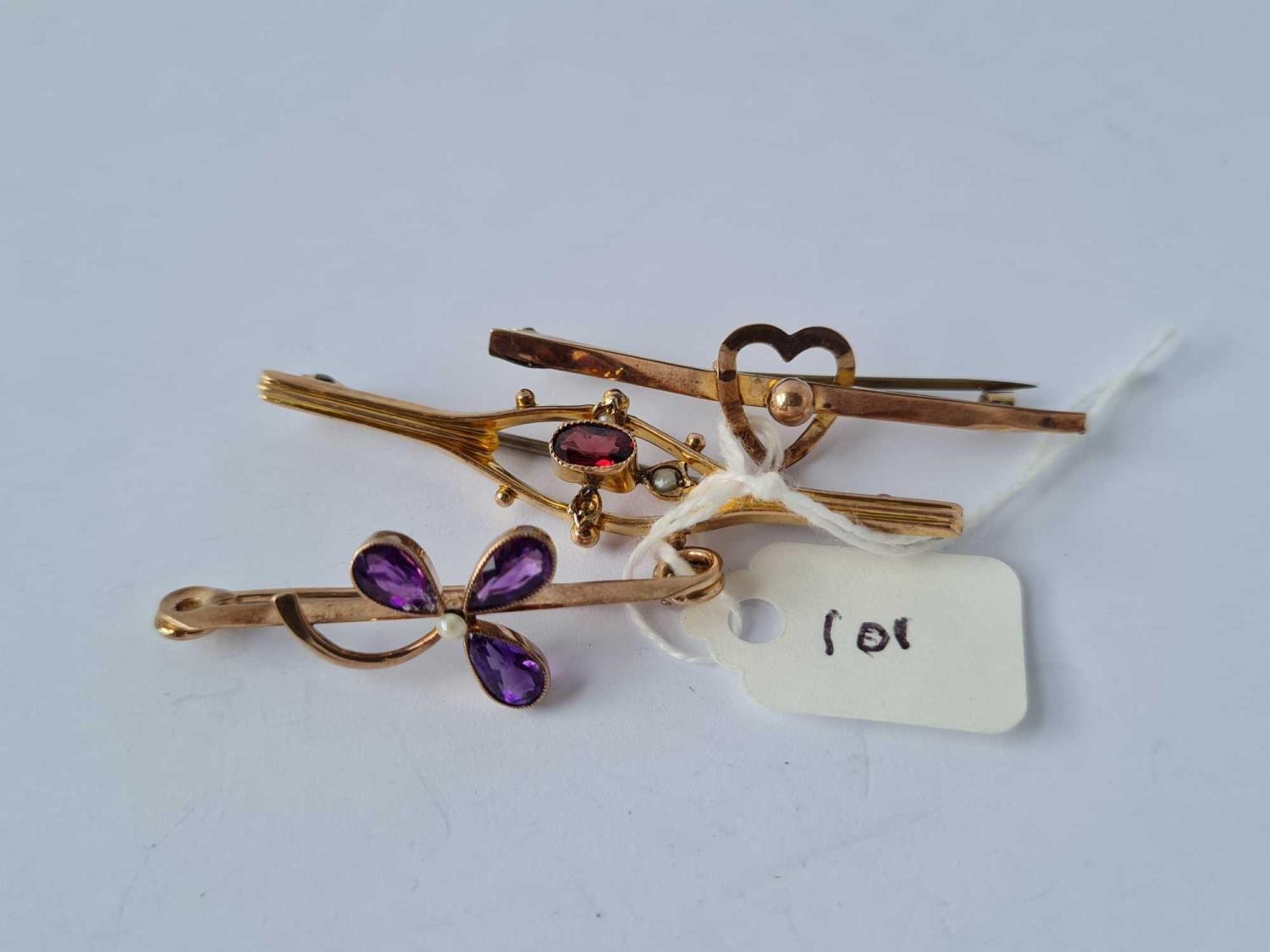 Three bar brooches (1 X garnet 1X amethyst 1 X heart design) all 9ct - 5.5 gms