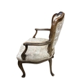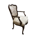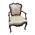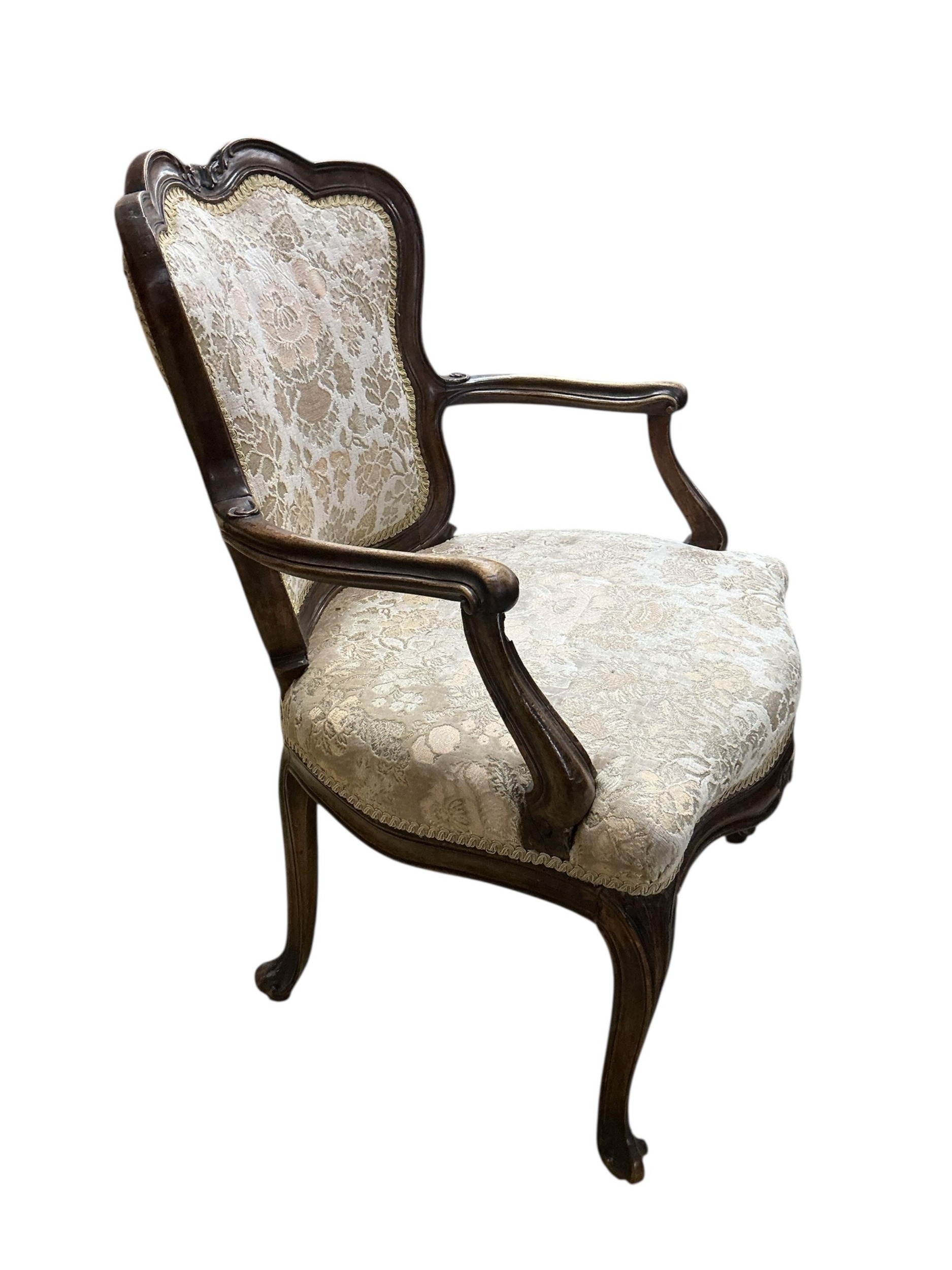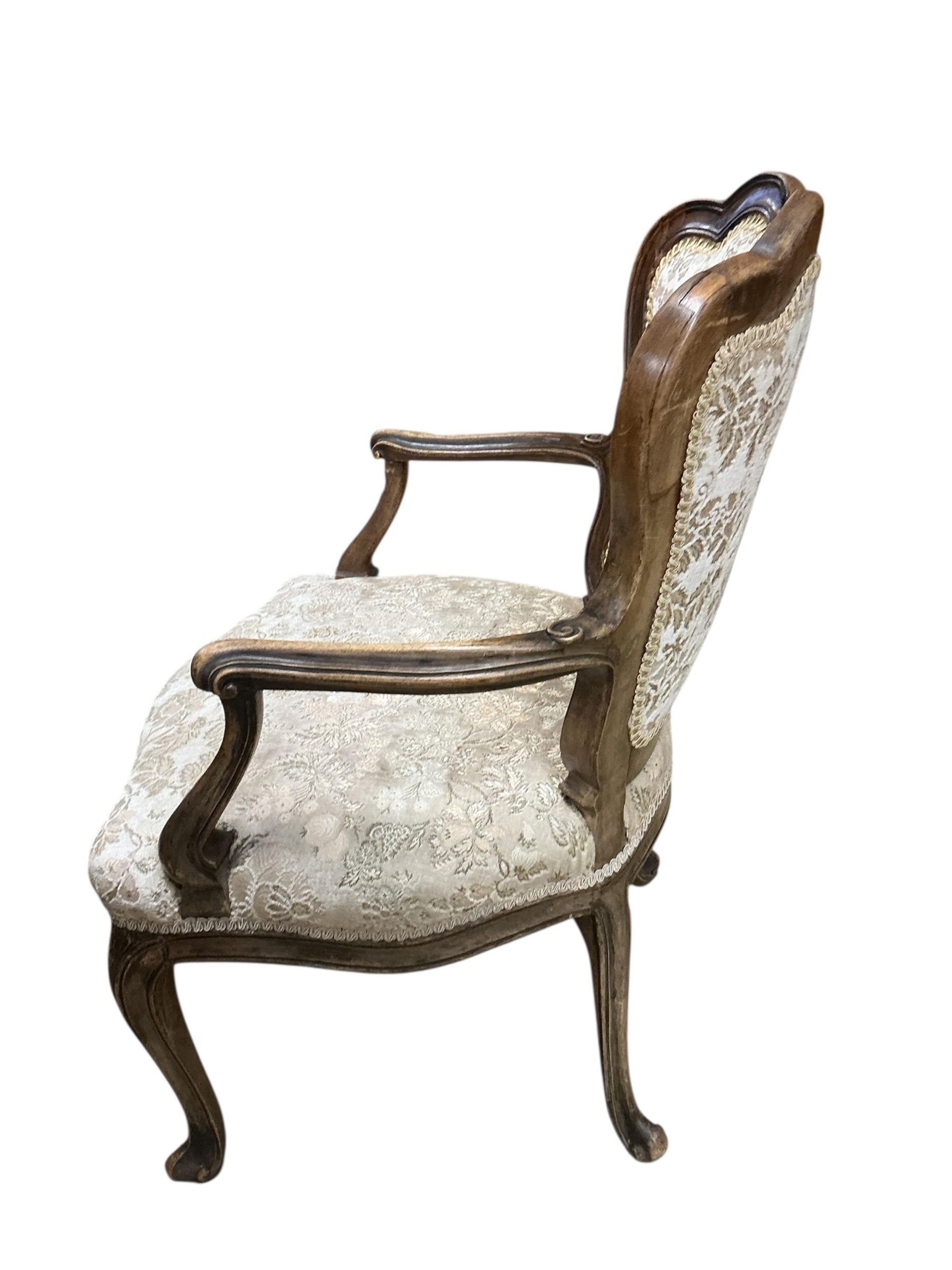 An 18th century French upholstered open arm chair, width 59cm, depth 50cm, height 87cm