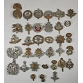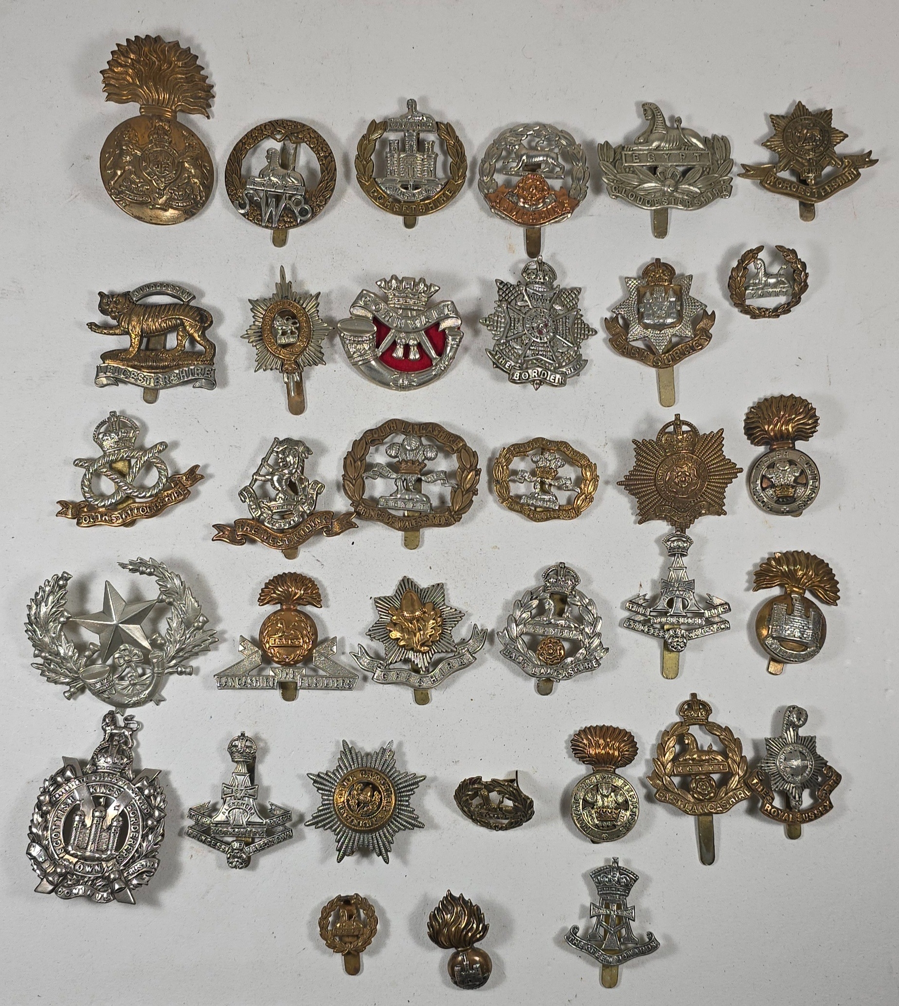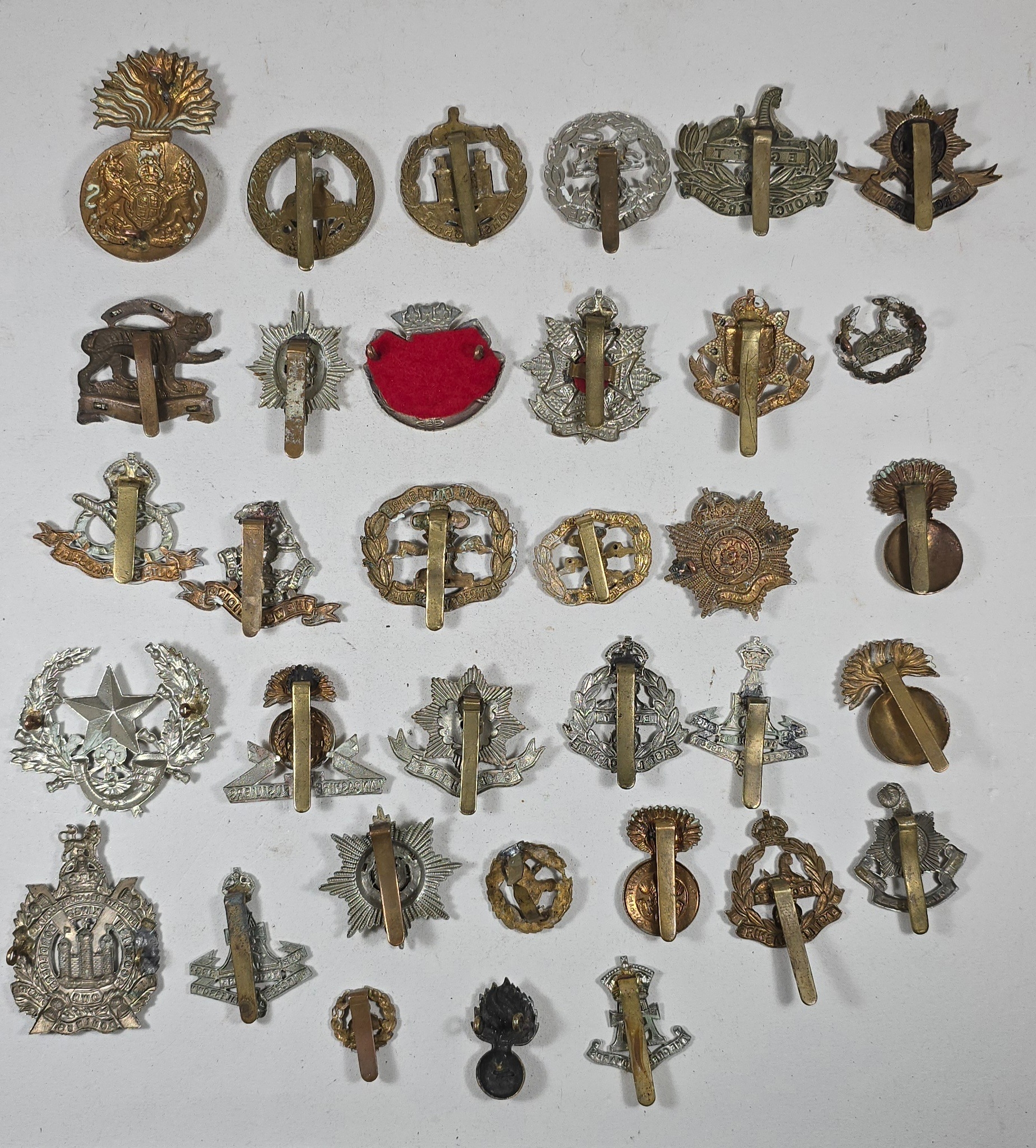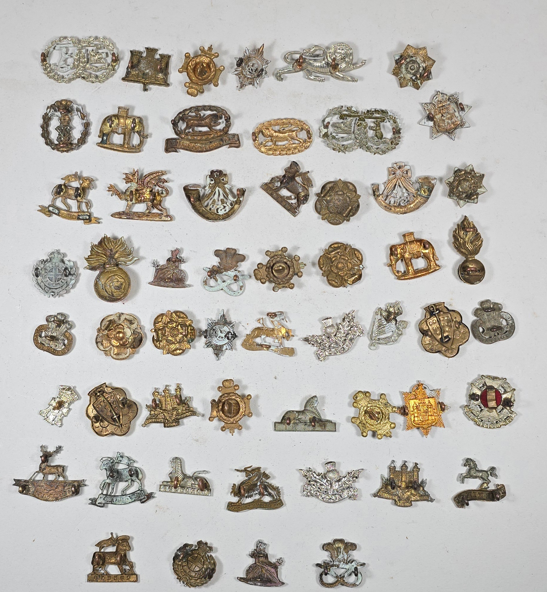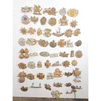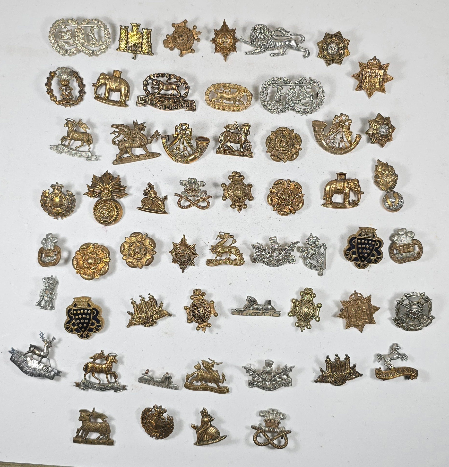 55 Infantry collar badges mostly in pairs including D.C.L.I. enamelled, singles include silver Bedfordshire and white metal Border Regt Militia Bn. GC (55)