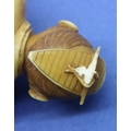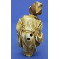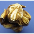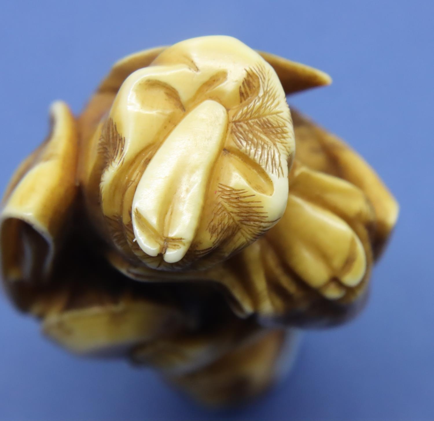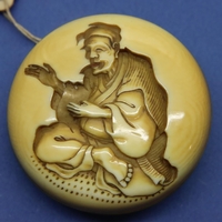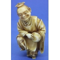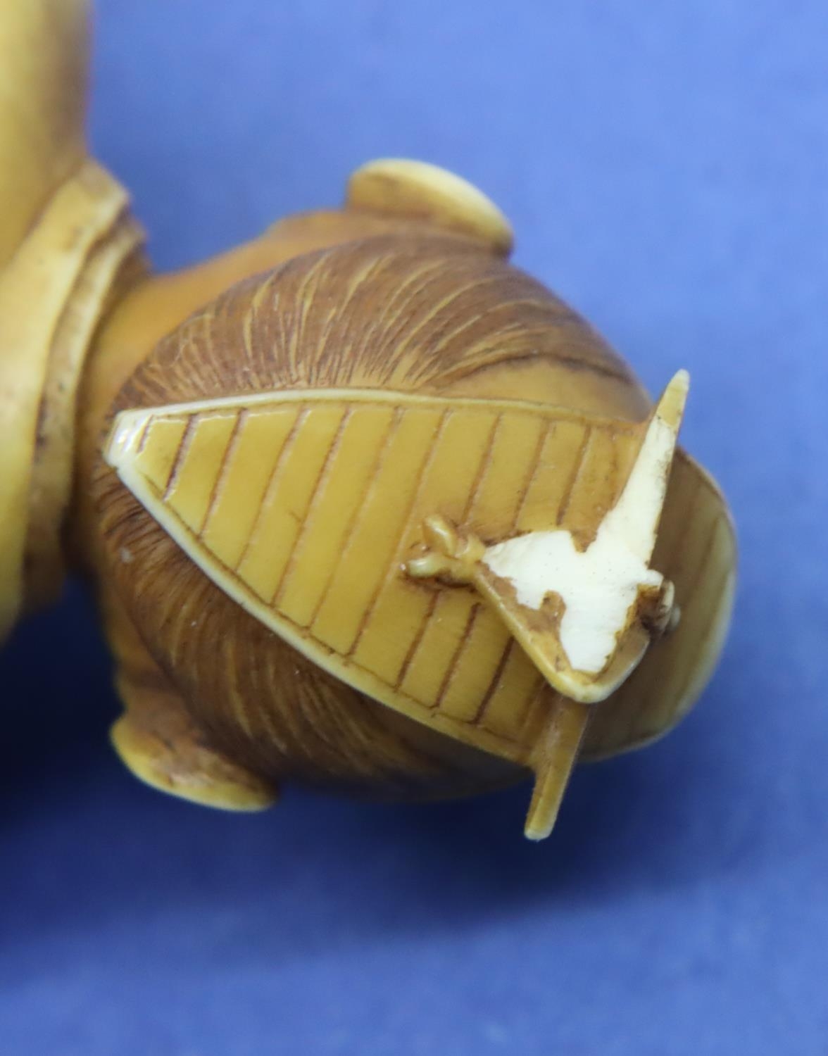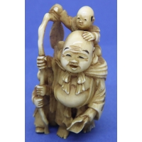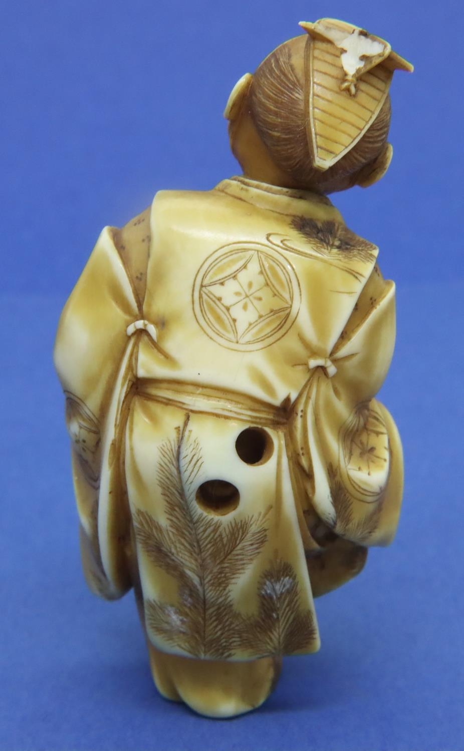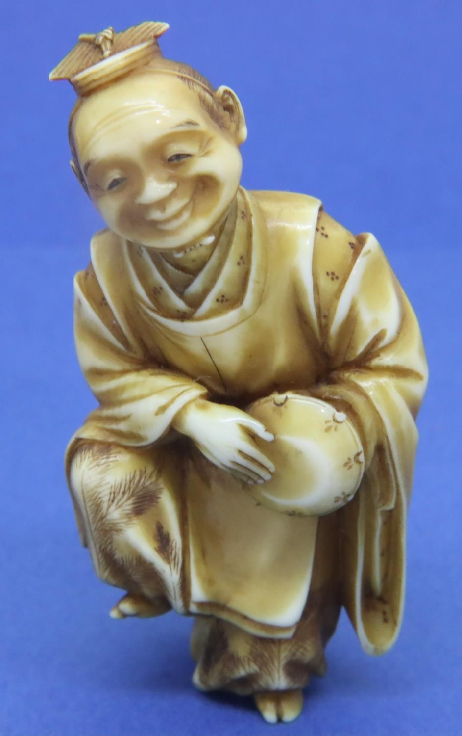 Ivory carved netsuke in the form of a standing man with a drum, damage to the top of hat, H: 62 mm, signed to back. P&P Group 1 (£14+VAT for the first lot and £1+VAT for subsequent lots)