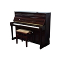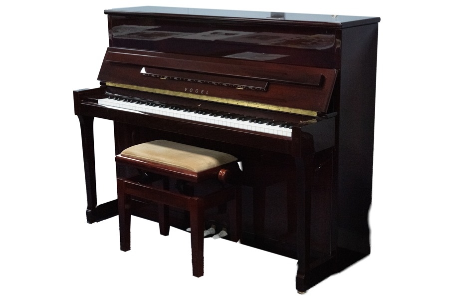 MODERN ‘VOGEL’ BY SCHIMMEL, MODEL 115 TRADITIONAL, MAHOGANY CASED UPRIGHT PIANO IN HIGH GLOSS, with ASSOCIATED NEAR MATCHING MODERN ADJUSTABLE STOOL, the oblong top covered in olde gold plush, (2)