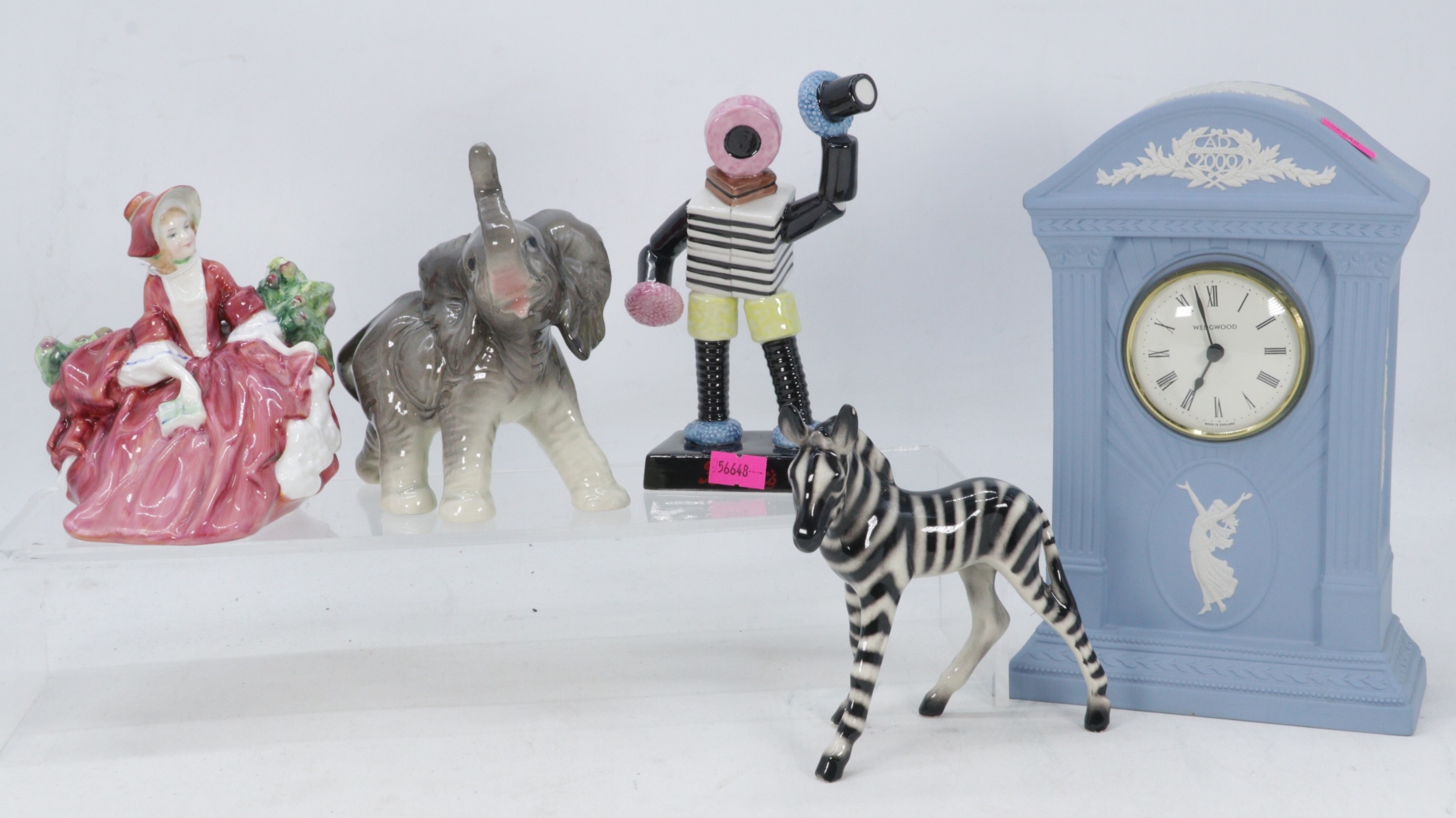 Bertie Bassett limited edition Coalport figure together with royal Doulton figure West German Zebra and Elephant, and a Wedgwood mantle clock