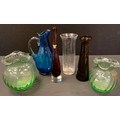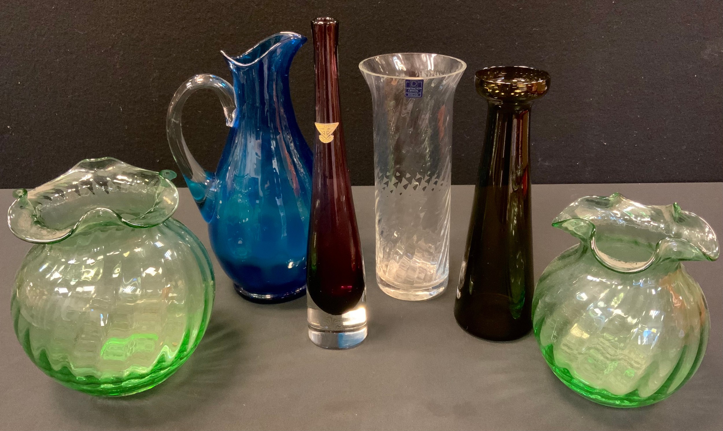 A Dartington crystal wrythen cylindrical vase, 22cm high; a Gullaskruf Art vase; other coloured glass
