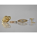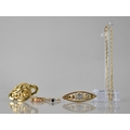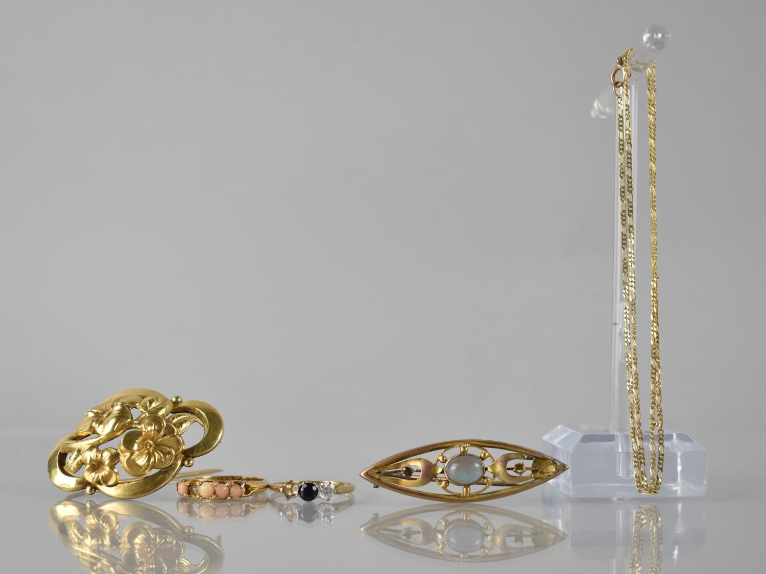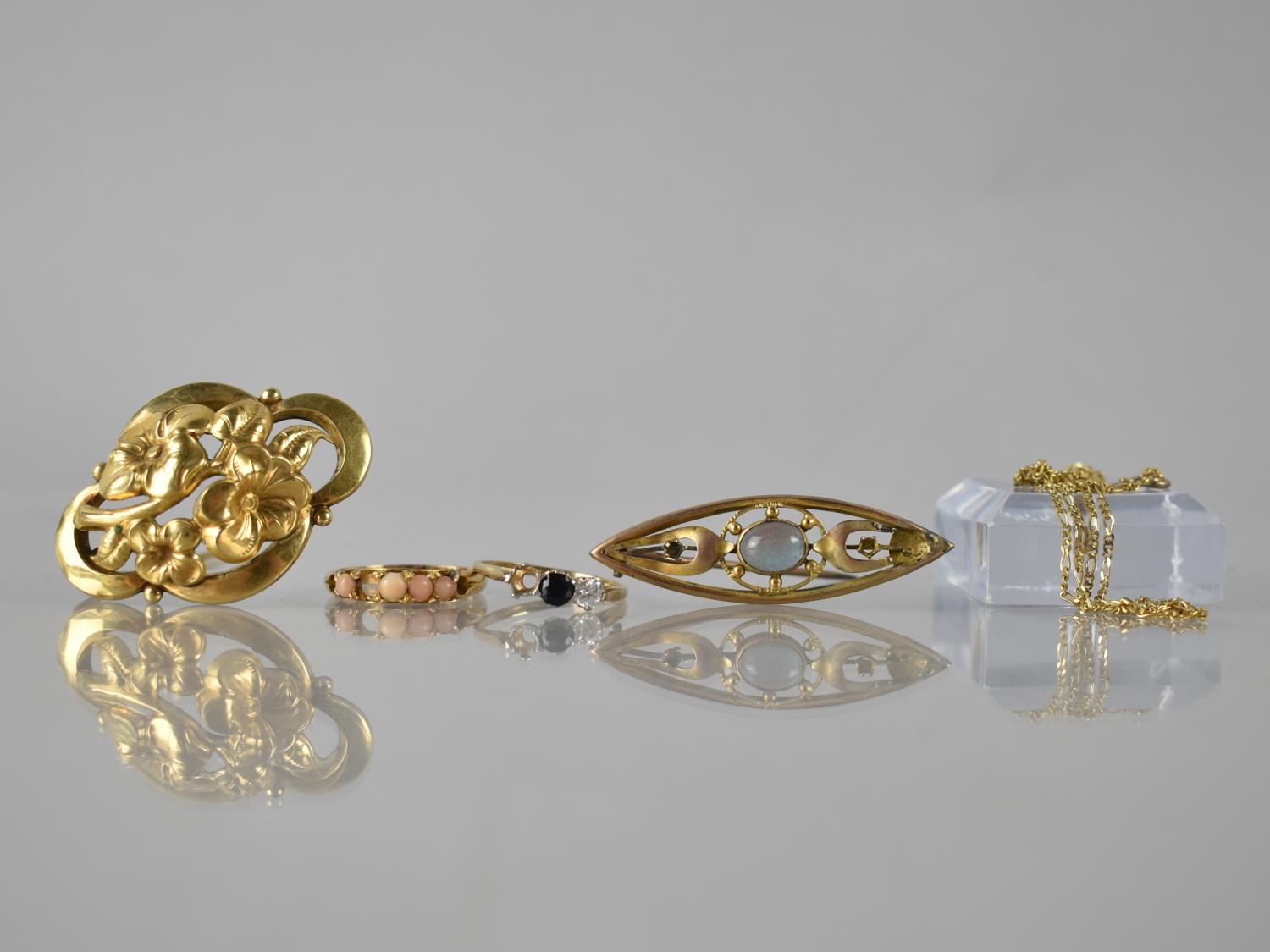 A Collection of Gold and Gold Coloured Metal Items to include a 9ct Gold Mounted Saphiret Mounted Lozenge Shaped Brooch, (AF), 46mm Wide, A Gold Coloured Metal Victorian Brooch Depicting Blossom and Branches in a Scrolling Border, A 9ct Gold Figaro Chain, A 9ct Gold CZ and Sapphire Ring (Missing One Stone), An Unmarked Gold Metal Pink Coral Fve Stone Dress Ring (Signs of Resizing and Missing One Stone), Total Weight 11.6gms
