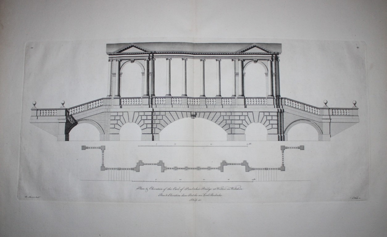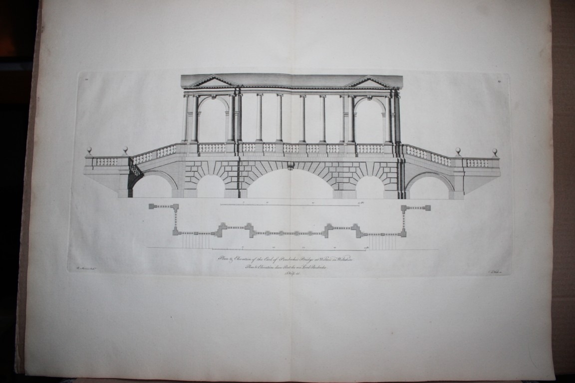 Vitruvius Britannicus 1771 - Pl 89 Earl of Pembroke's Bridge, Wilton. This original copperplate engraving of the Earl of Pembroke's Bridge, Wilton in Wiltshire, is from Vitruvius Britannicus Vol 5 published in 1771.
