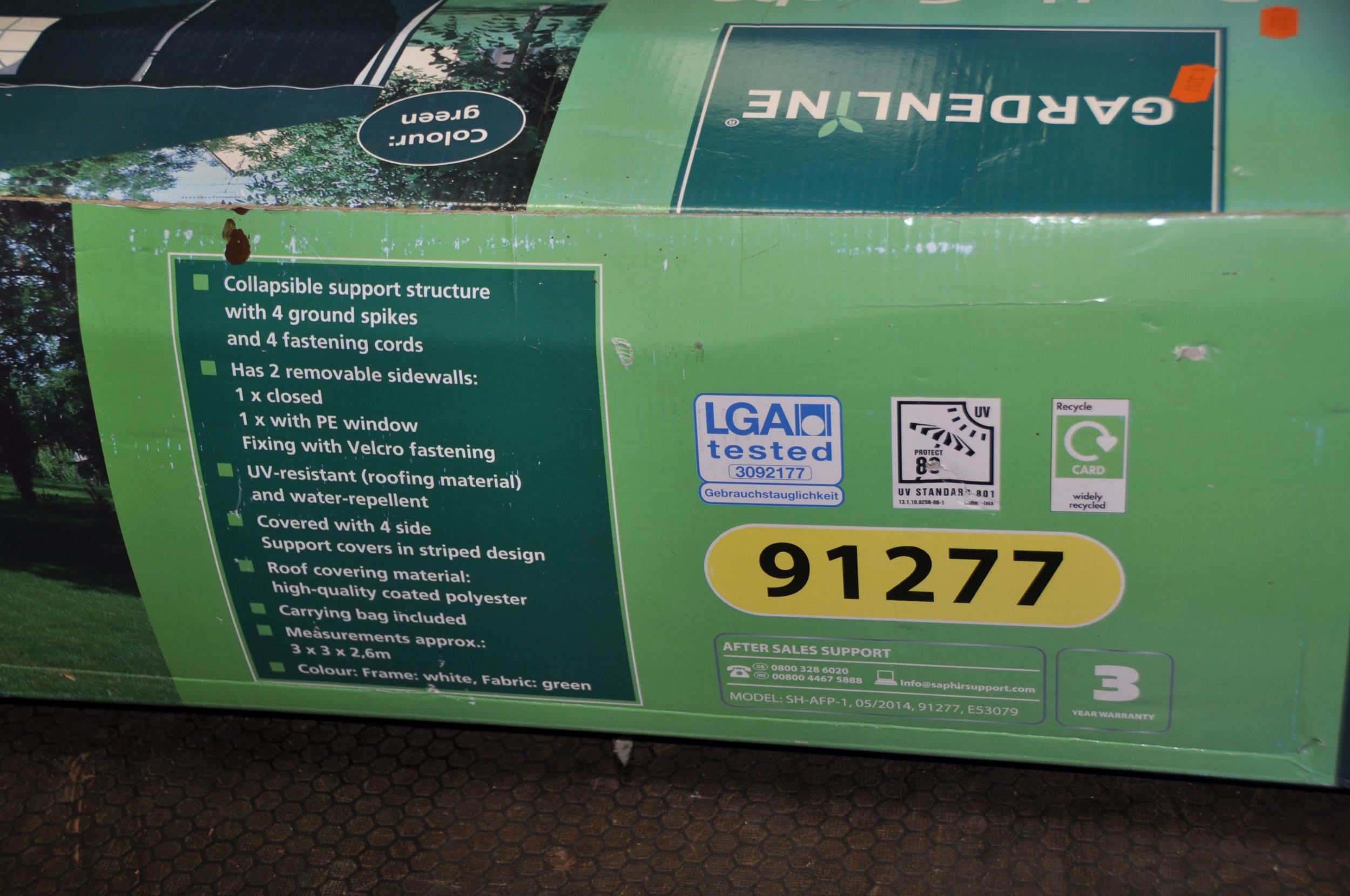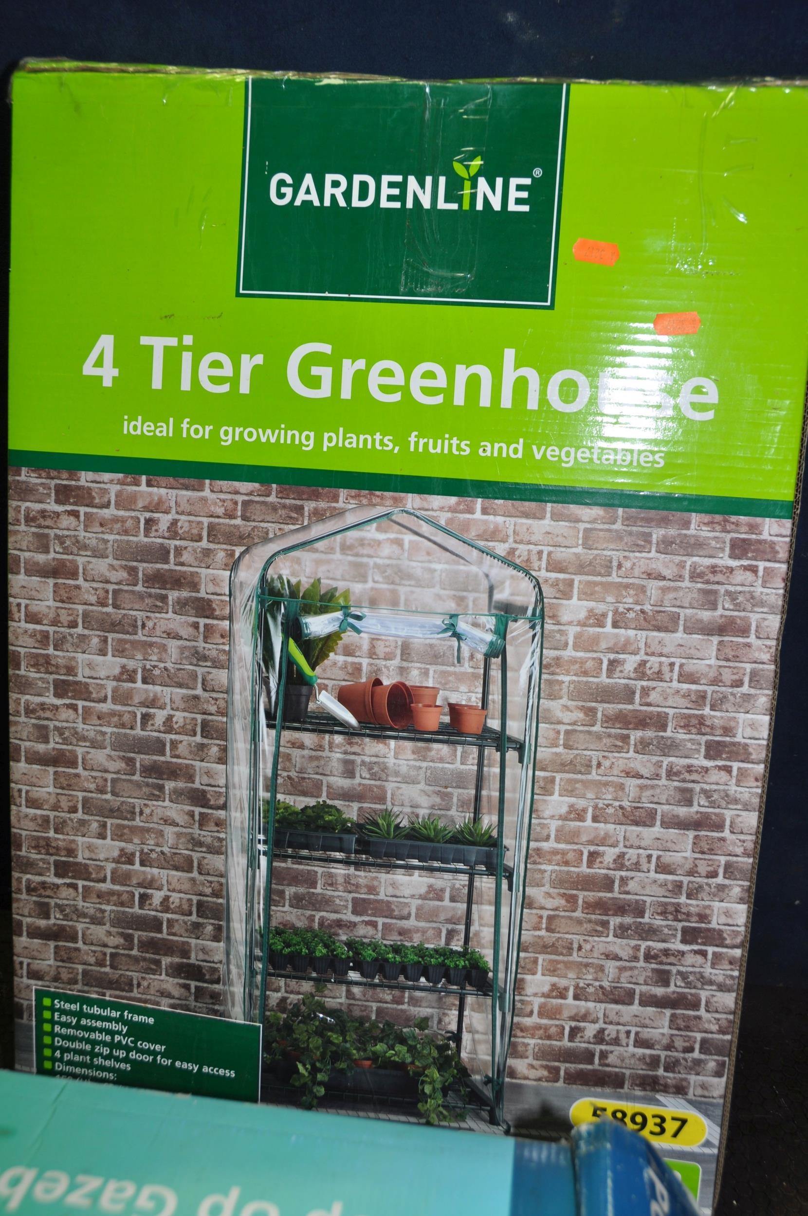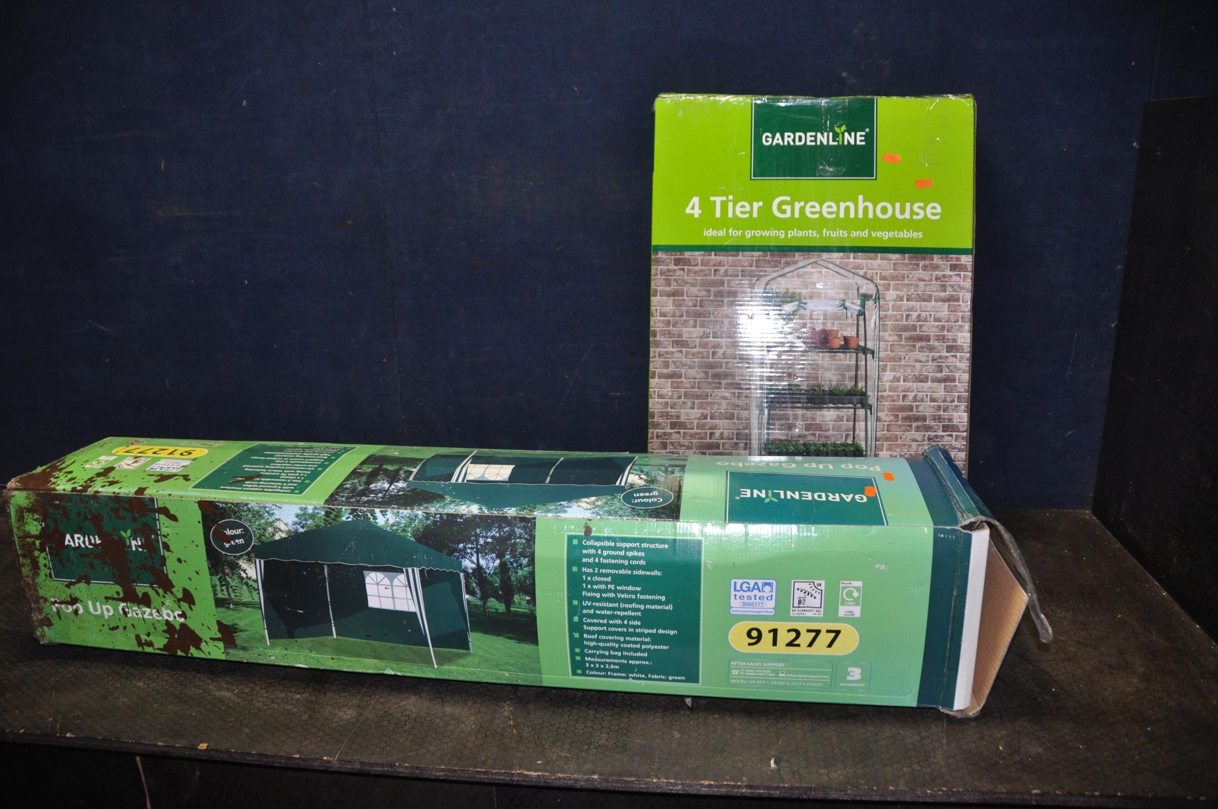 A BOXED GARDENLINE POP UP GAZEBO in green, stated size 3m x 3m x2.6m (unchecked) and a 4 tier Greenhouse in box (2)