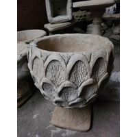 Large concrete garden planter on plinth with traditional decorative moulding. approx. 55cm diameter by 38cm tall