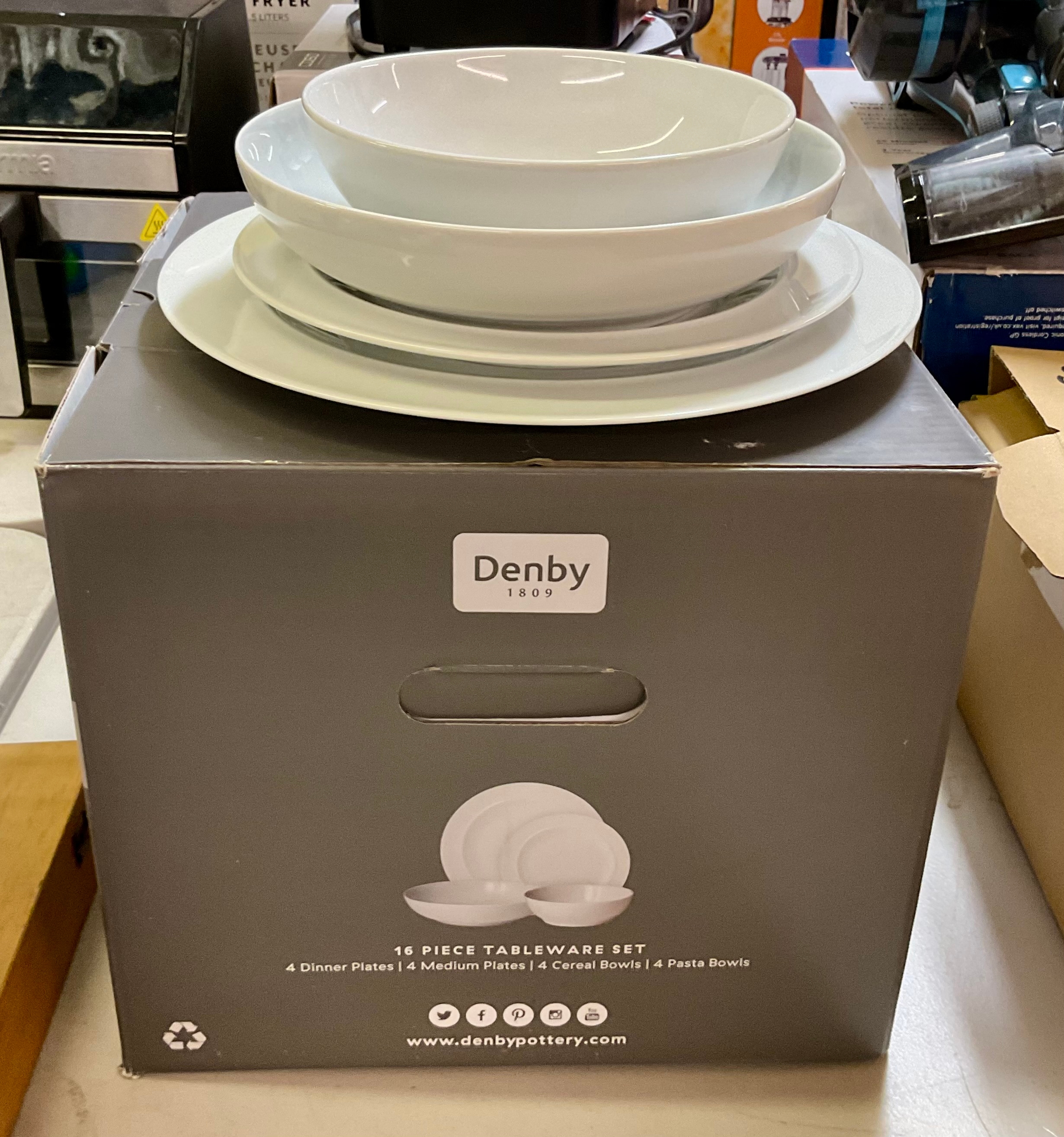 BOXED SET OF 13 DENBY WHITE DINERWARE SET 4 DINNER PLATES, 4 SIDE PLATES, 4 PASTA BOWLS, 1 CEREAL BOWL