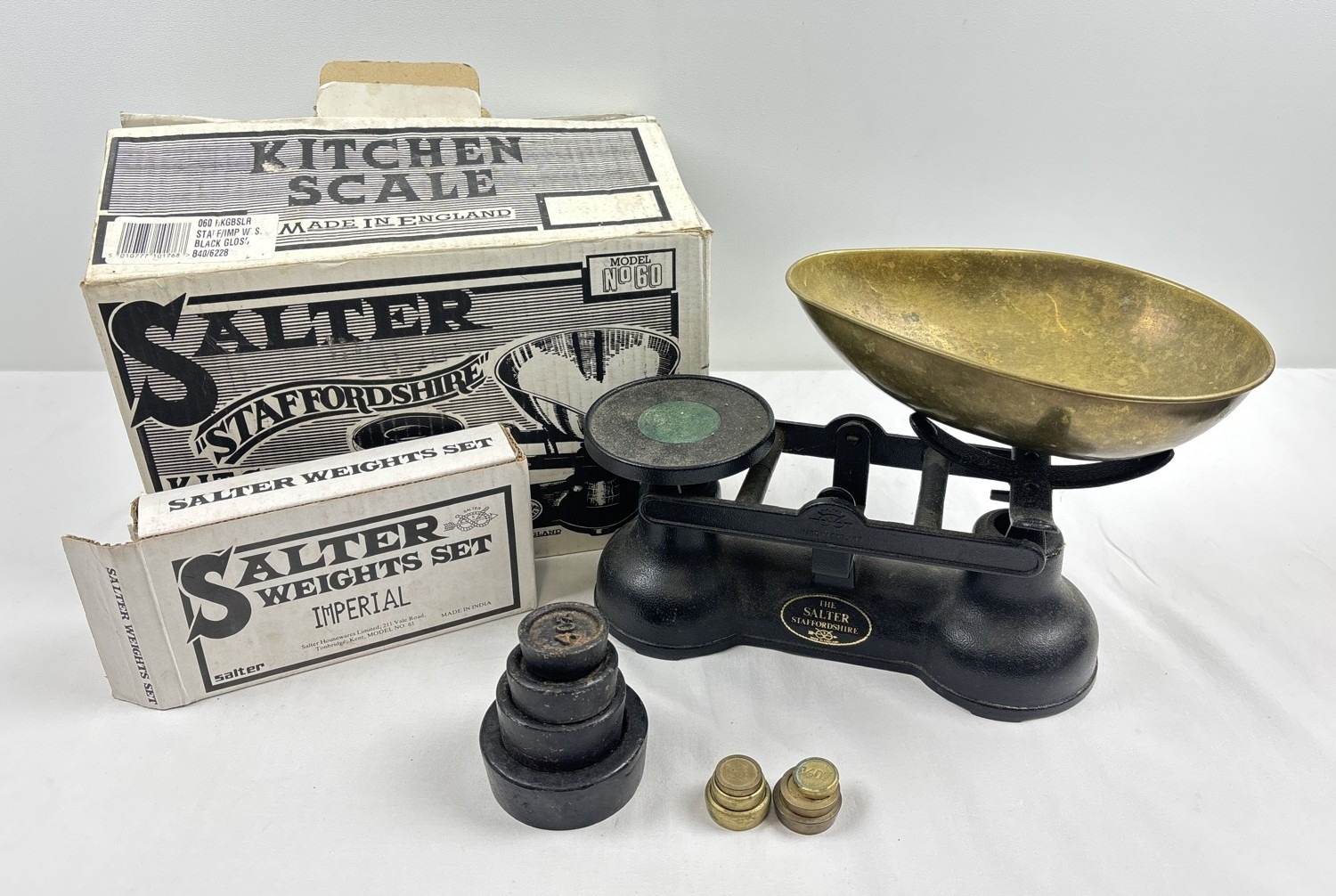 A boxed set of Salter kitchen balance scales with brass scoop and a boxed imperial weights set.