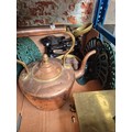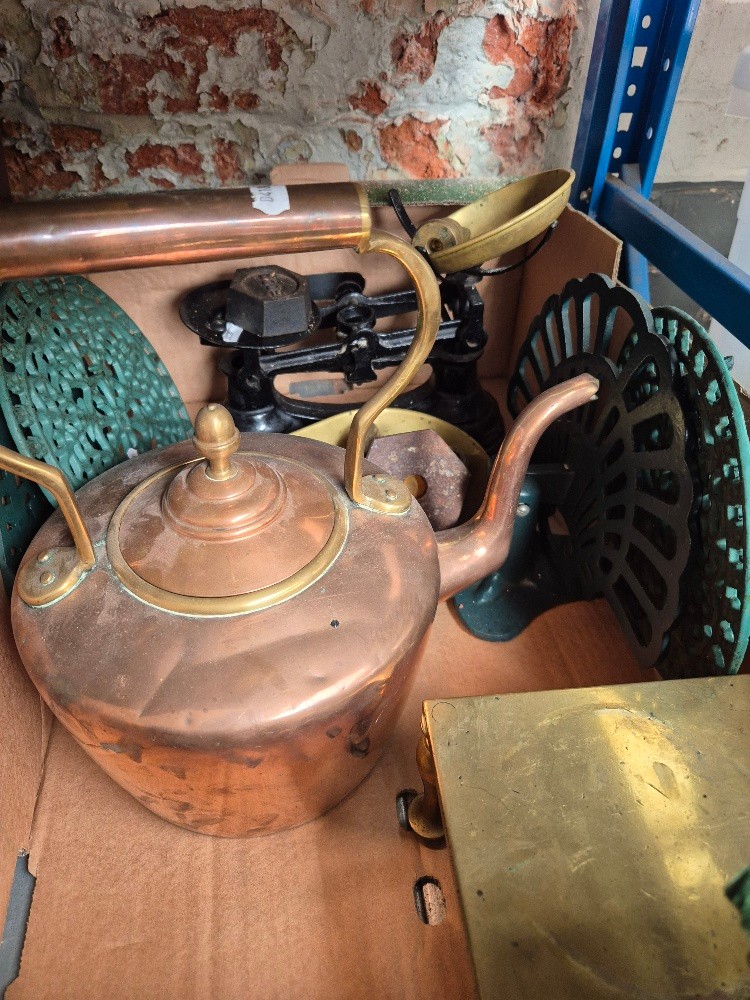 A box of metalware including copper kettle, brass trivet, kitchen scales etc