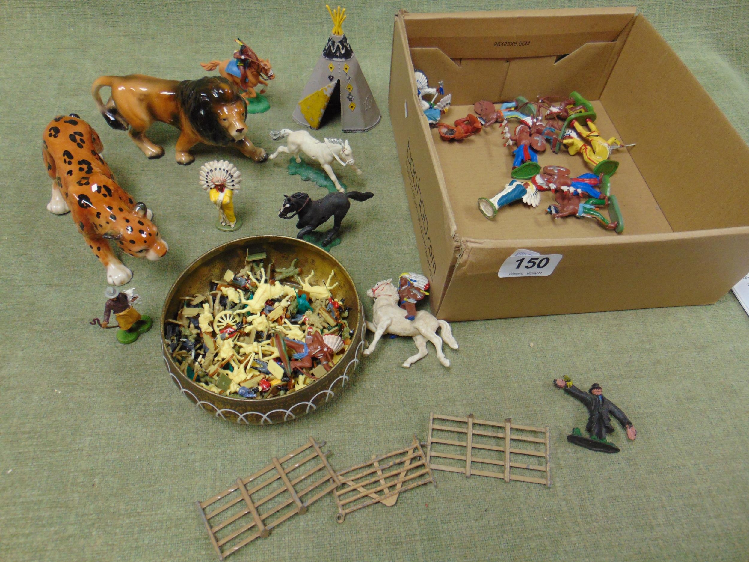 Various Britain's plastic Cowboy and Indian figures, ceramic Lion and Leopard , etc