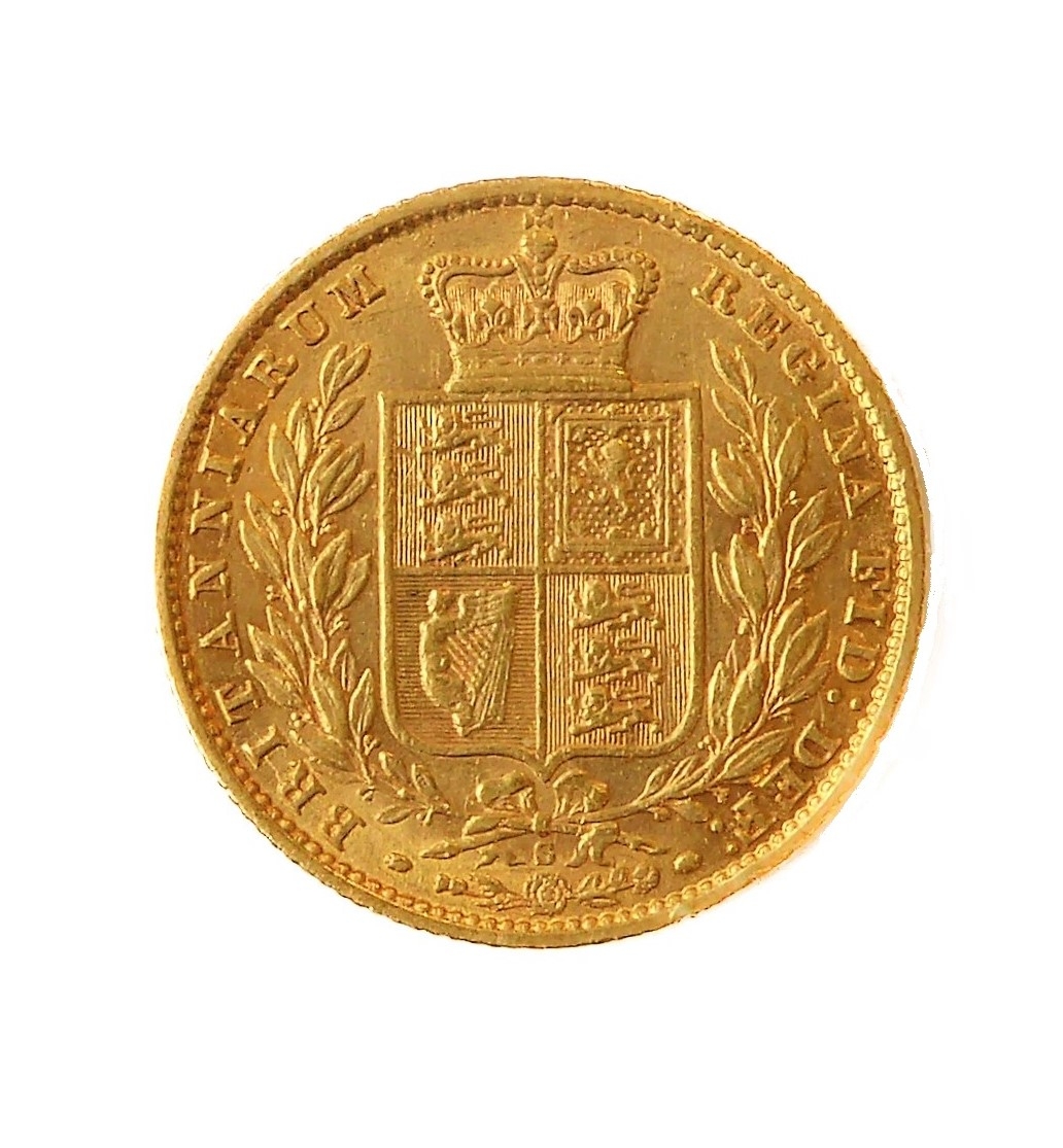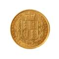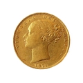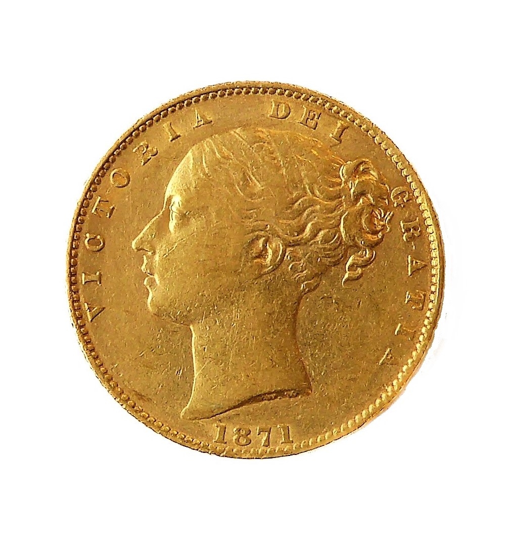 An 1871 gold sovereign (young head obverse and royal arms reverse).