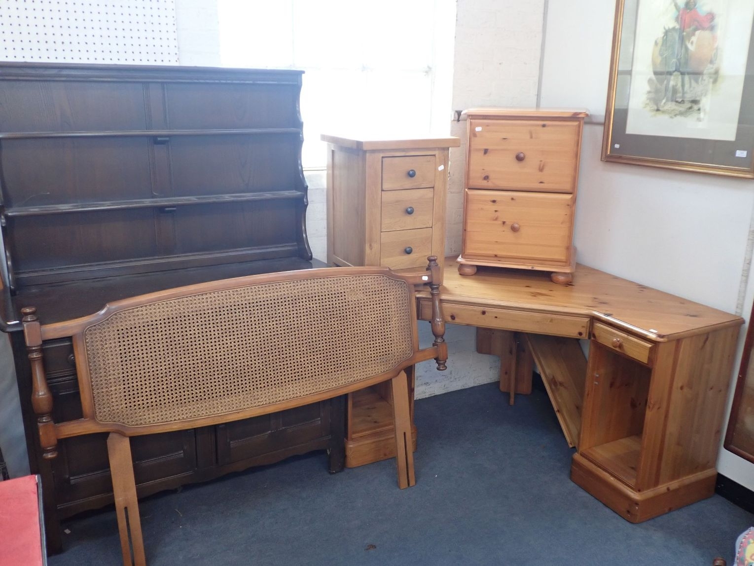 AN ERCOL ELM DRESSER, AN ERCOL CANED DOUBLE BEDHEAD a modern light oak bedside chest, a pine corner desk by ducal, and a similar pine filing cabinet (5)