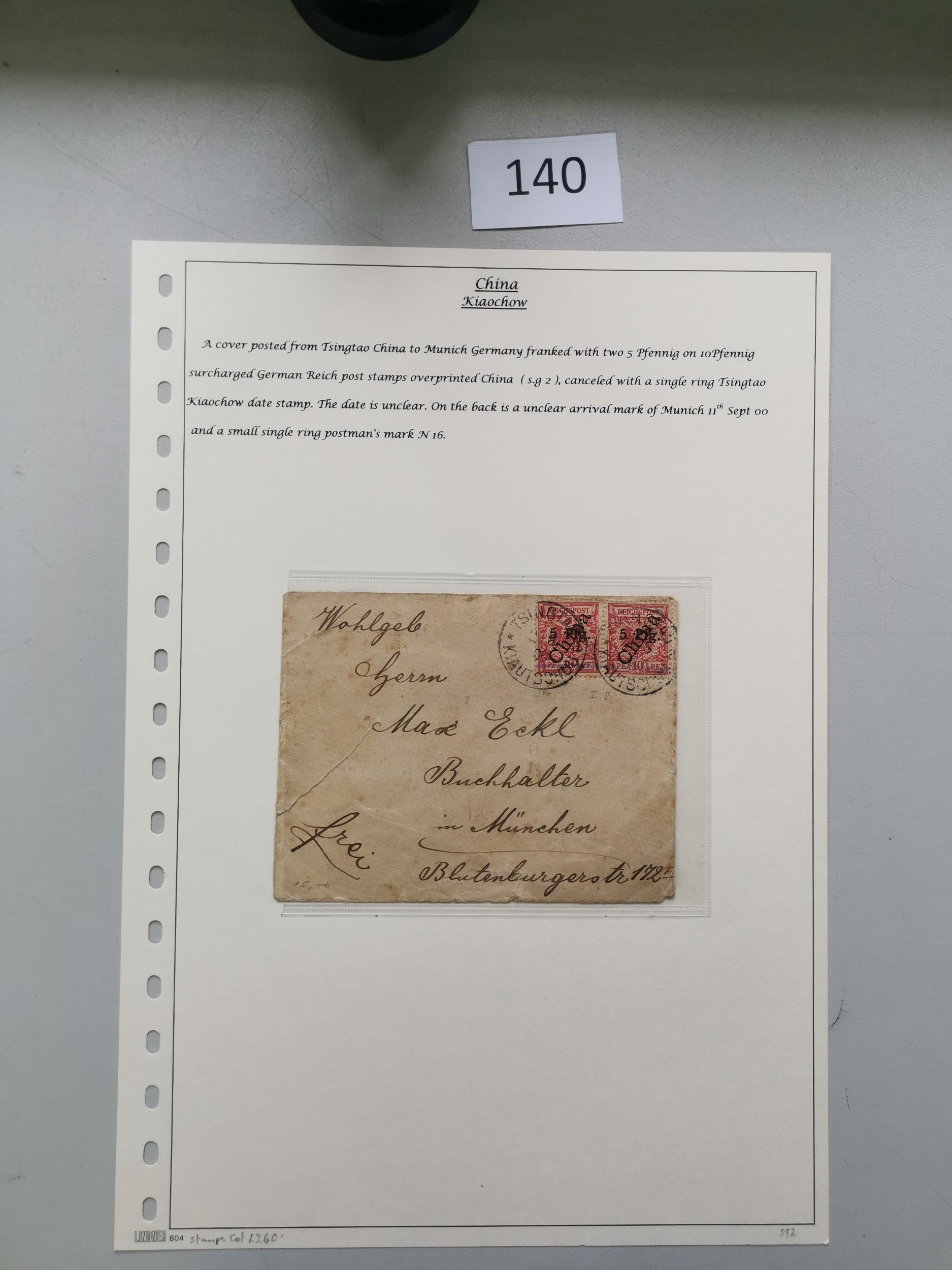 CHINA. 1900 cover from Tsingtao to Munich with 2 x Kiaochow 5Pfg on 10pf (SG2) the cover with some soiling/faults. (1 cover)