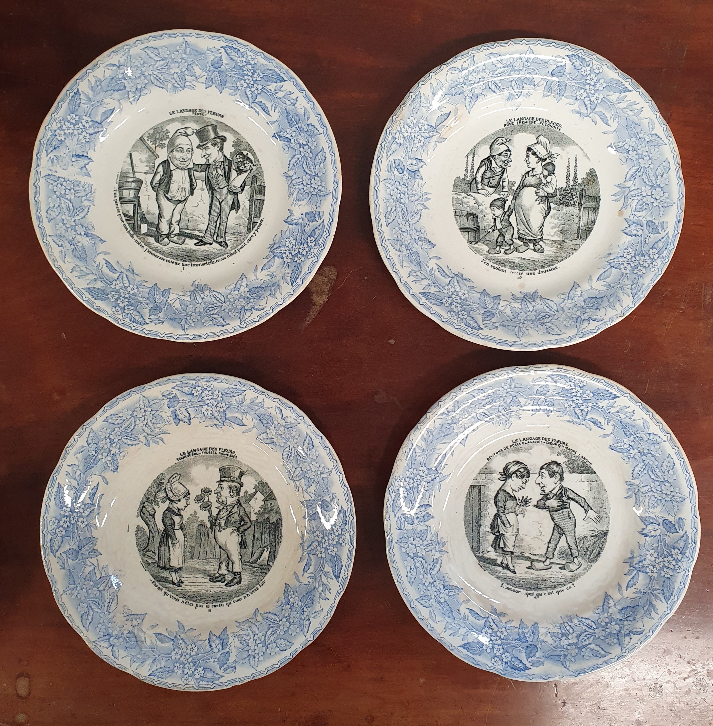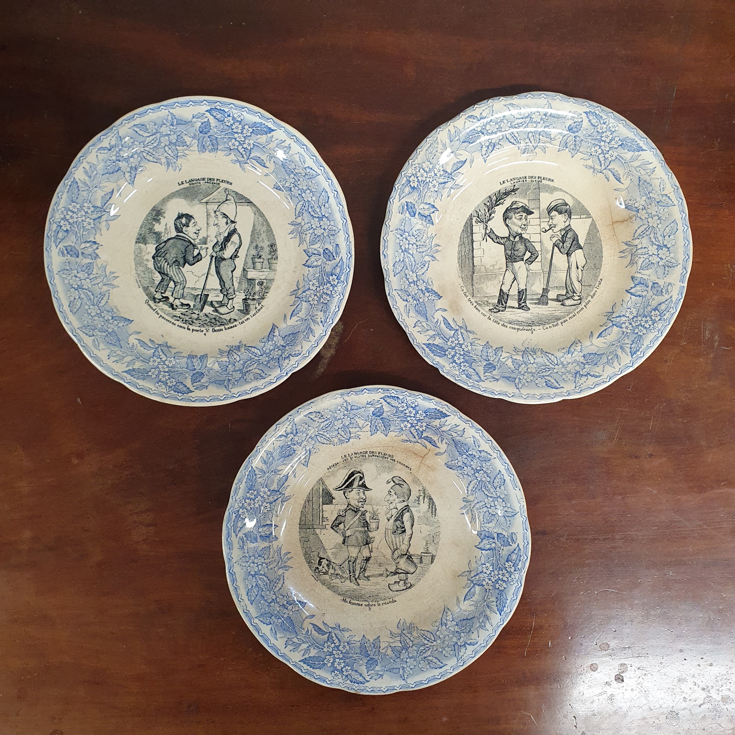 A good quantity of 19th Century French Opaque Porcelain Gien caricature Plates. D 20 cm approx. Sold due to non collection.